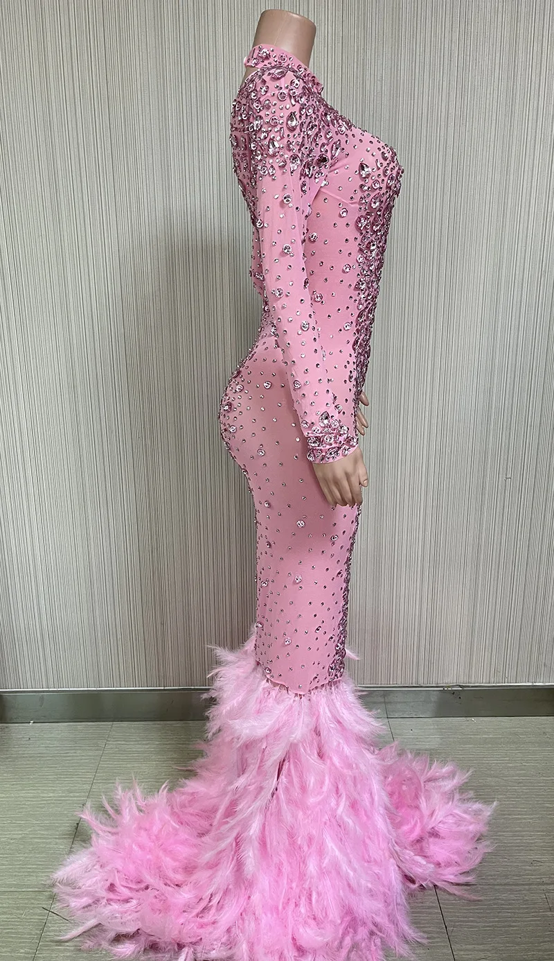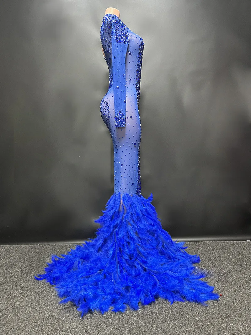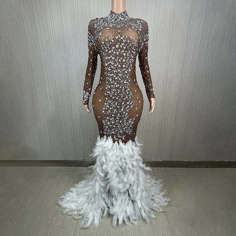 Luxury Shiny Crystal Diamond Elastic Tight Feather Splice Dress Empress Cross dress Show Luxury Prom Dress Performance Costume