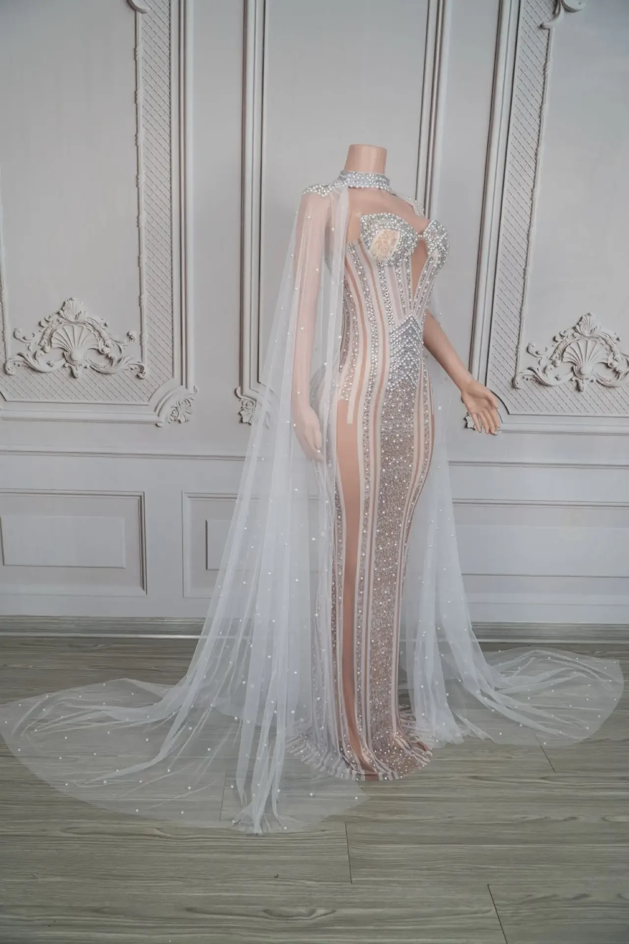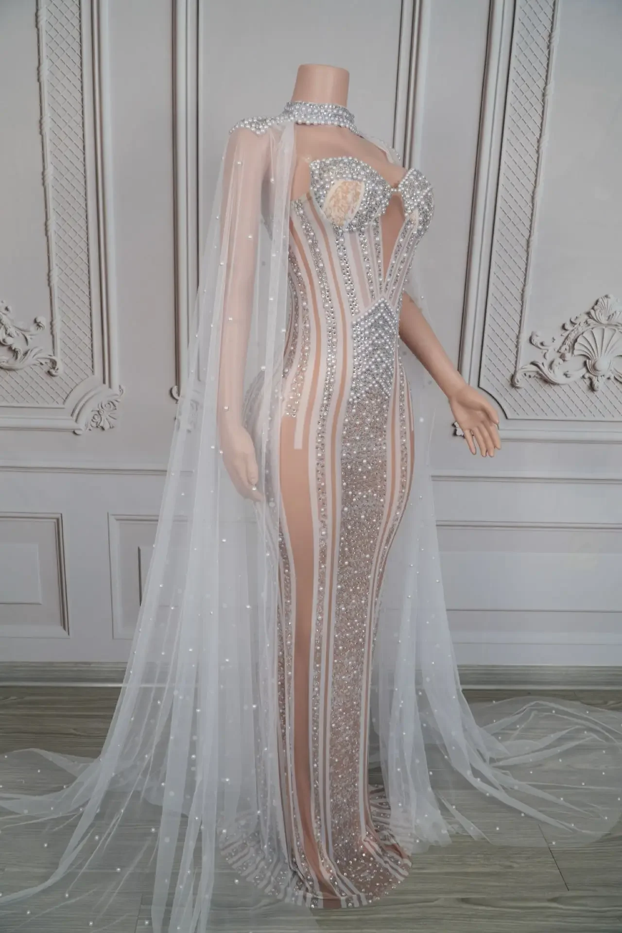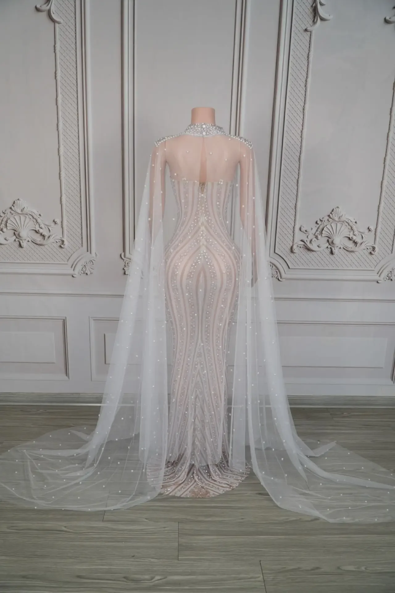 Luxury Sparkling pearl Large Crystal Transparent Long Train Dress Set Birthday Celebration Dress Evening Wedding Dance Dress