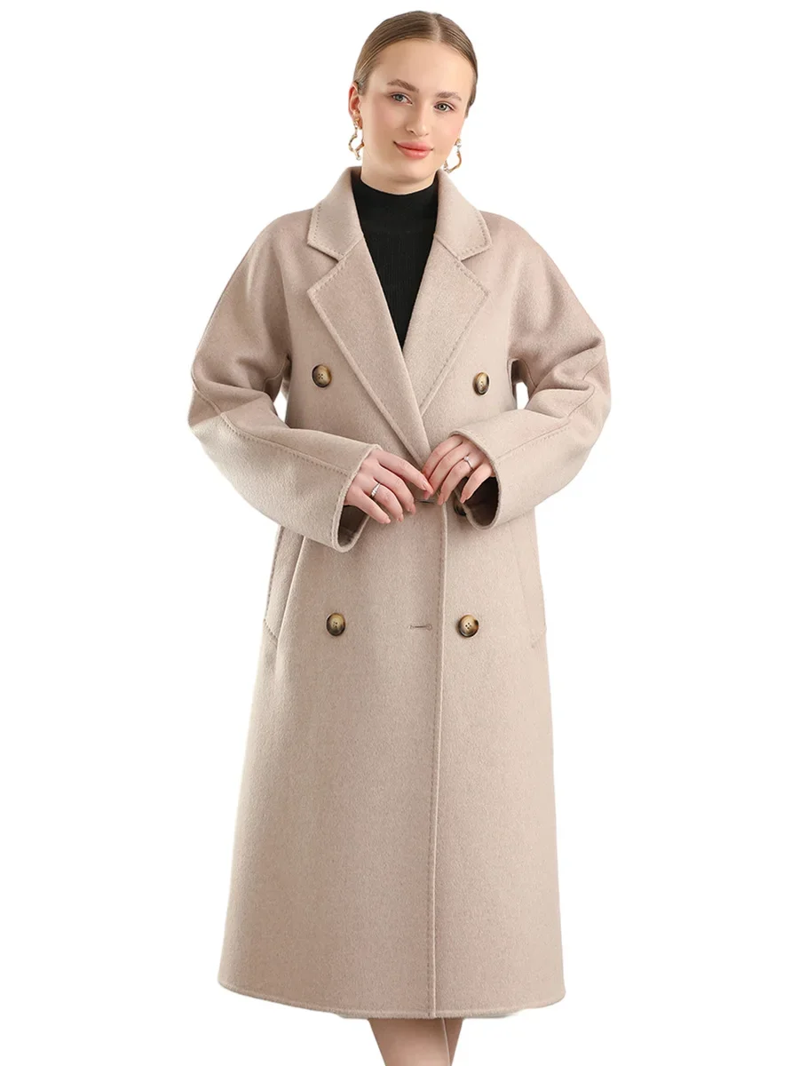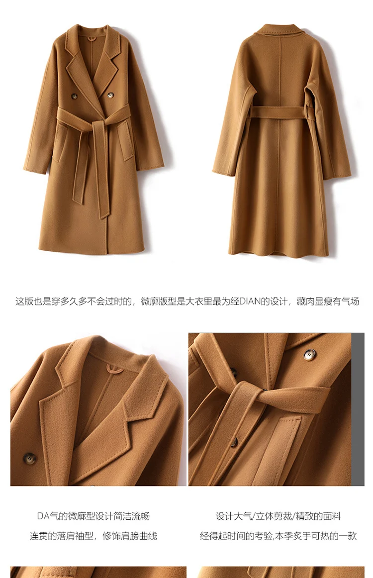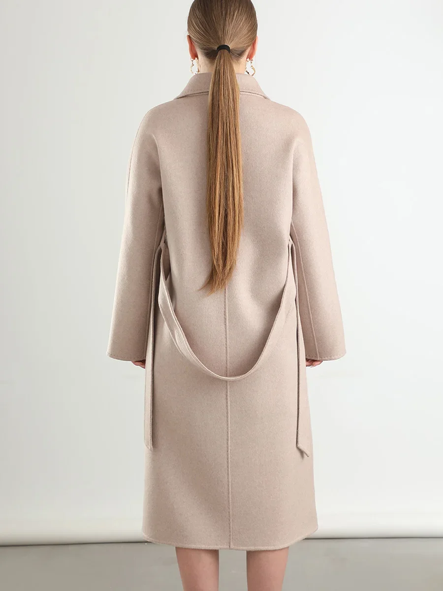 M 801 Real Pure Wool Overcoat Handmade Turn-down Collar Belt Dense Fabric Notch Lapel Women Coat Long Winter Jacket Autumn #09