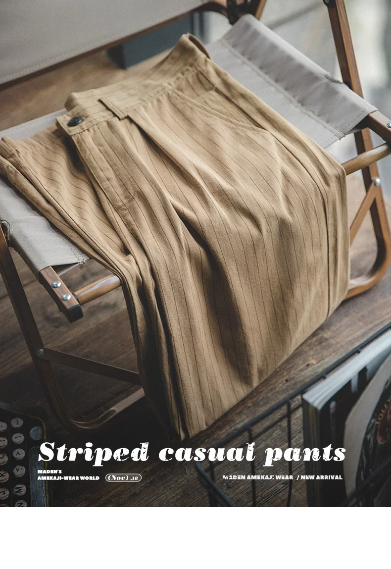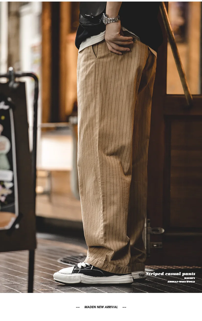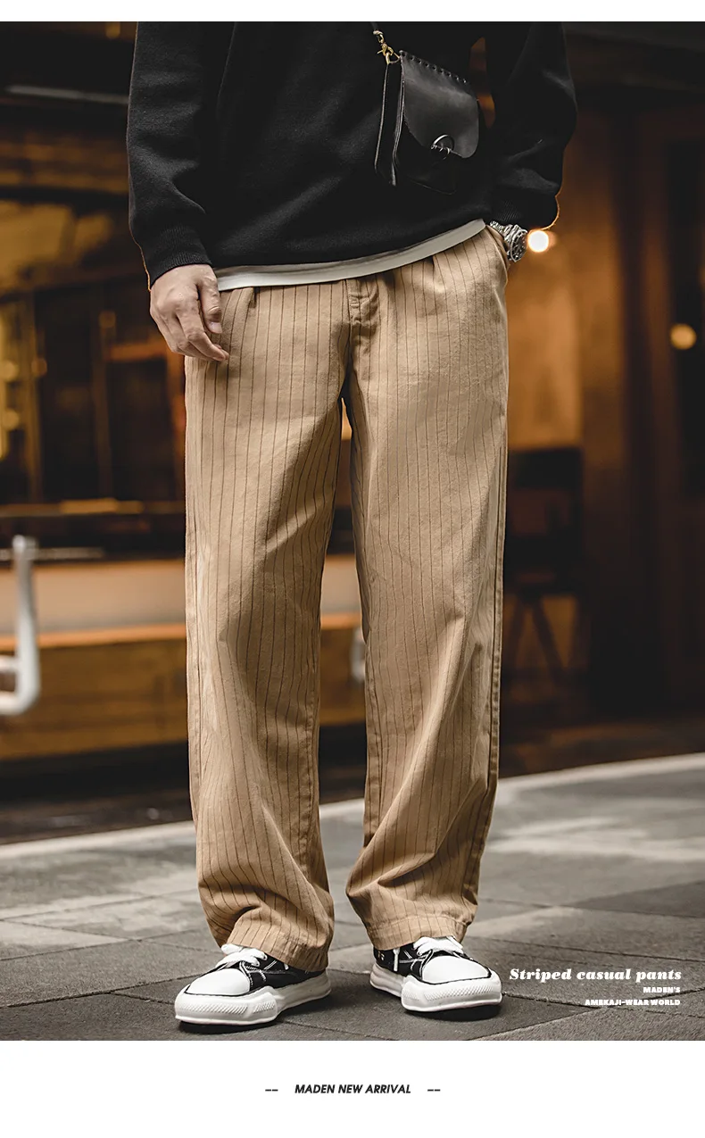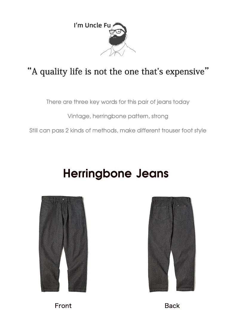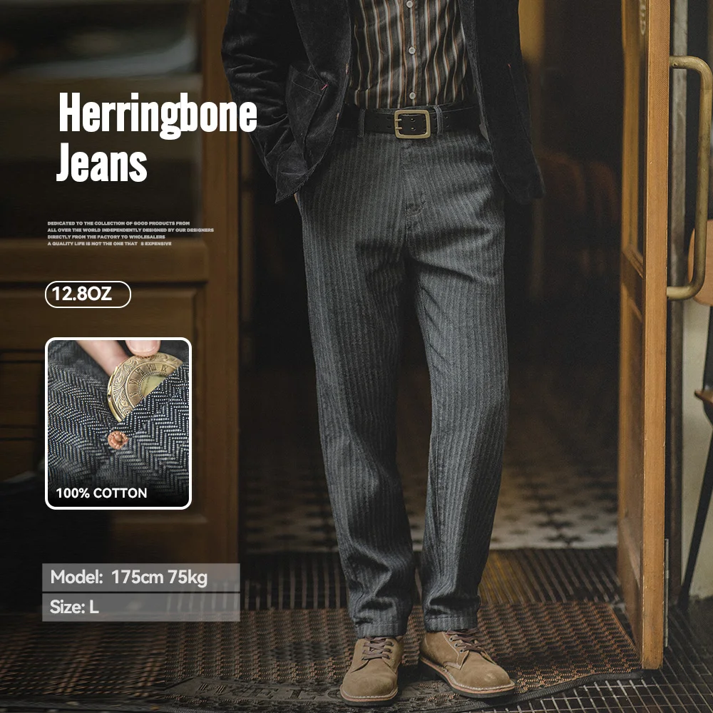 Maden Retro 12.8oz Grey Striped Jeans Straight Fit Zip Fly with Pockets Versatile Herringbone Trousers for Men’s Spring and Fall