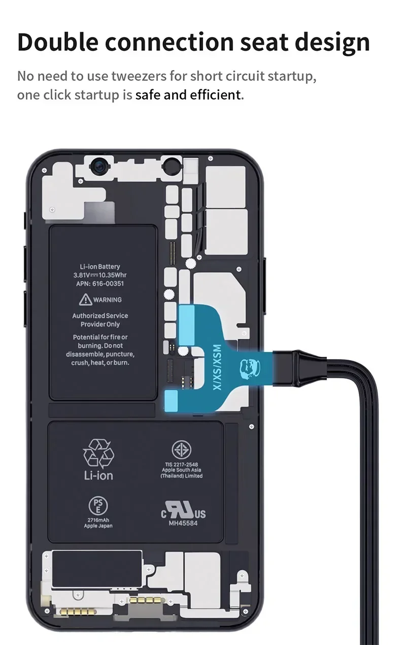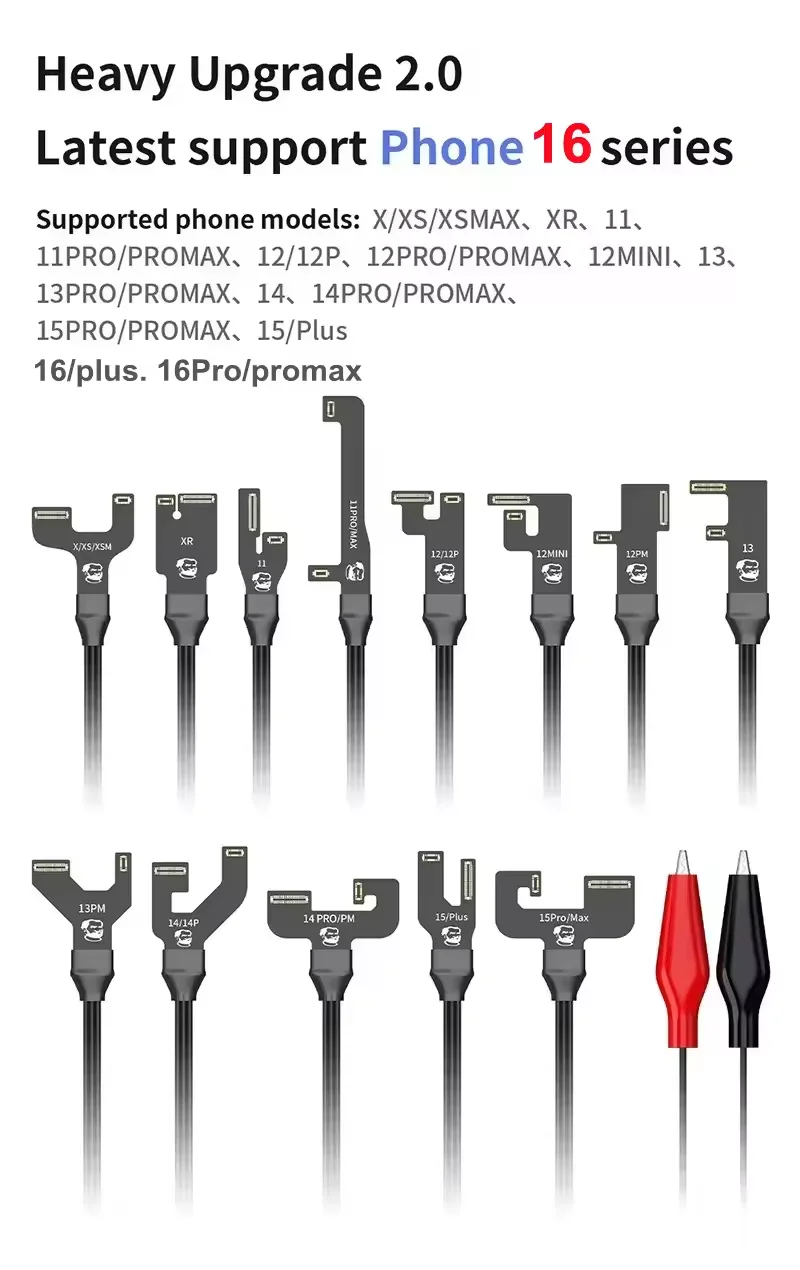 1. Support iPhone X/XR/XS/XS Max 11/11Pro/11 Pro Max/12/12 Mini/12 Pro 12 Pro Max/13/13Mini/13Pro/13 Pro Max/14/14 Plus/14 Pro/14 Pro Max/15/15 Plus/15 Pro/15 Pro Max/16/16 Plus/16 Pro/16 Pro Max, come with FPC connectors and a pair of alligator clips.