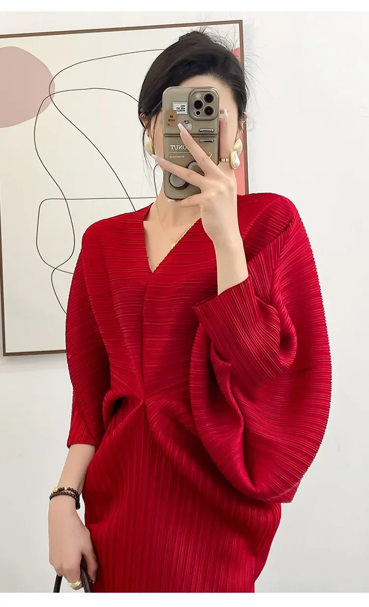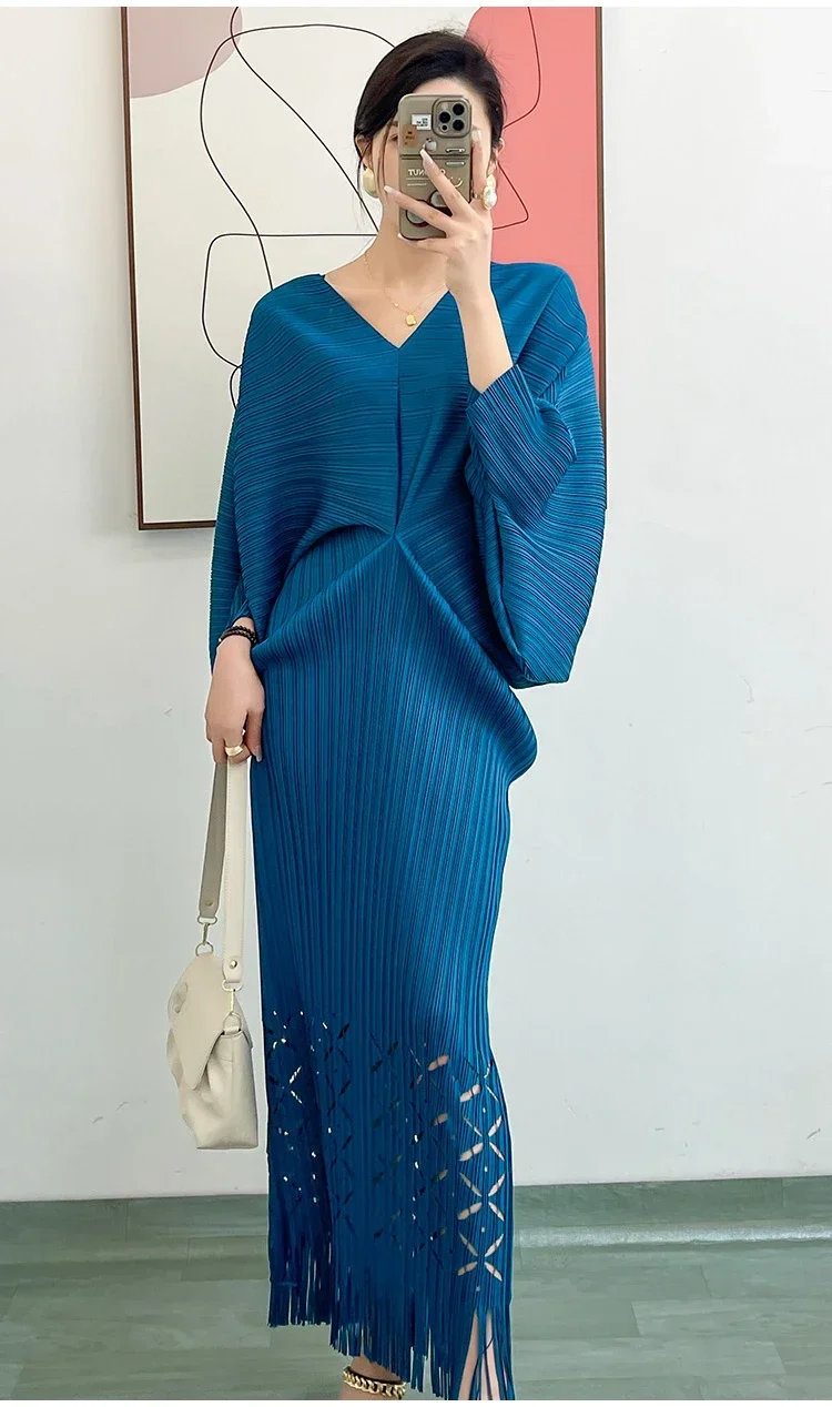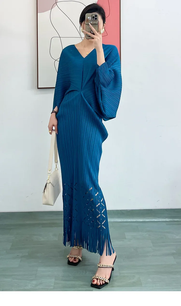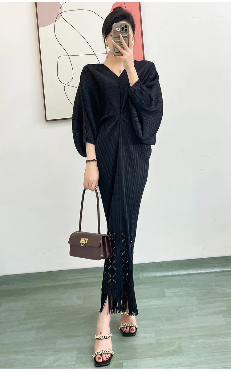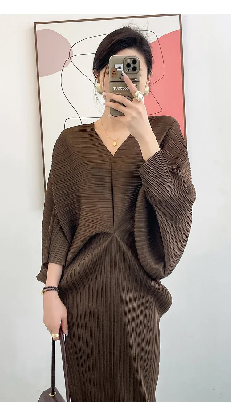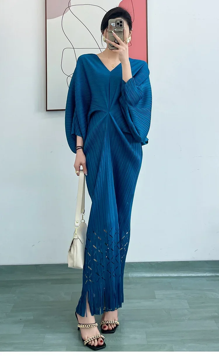 Miyake Dress Pleated Fashion Solid Color Bat Sleeve V-neck Formal Holiday Evening Dress 2024 Summer Maxi Dresses for Women