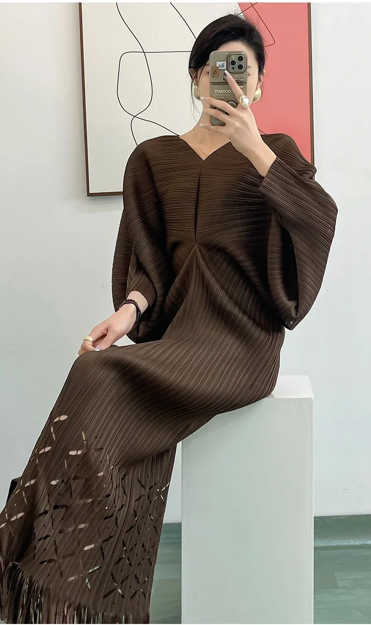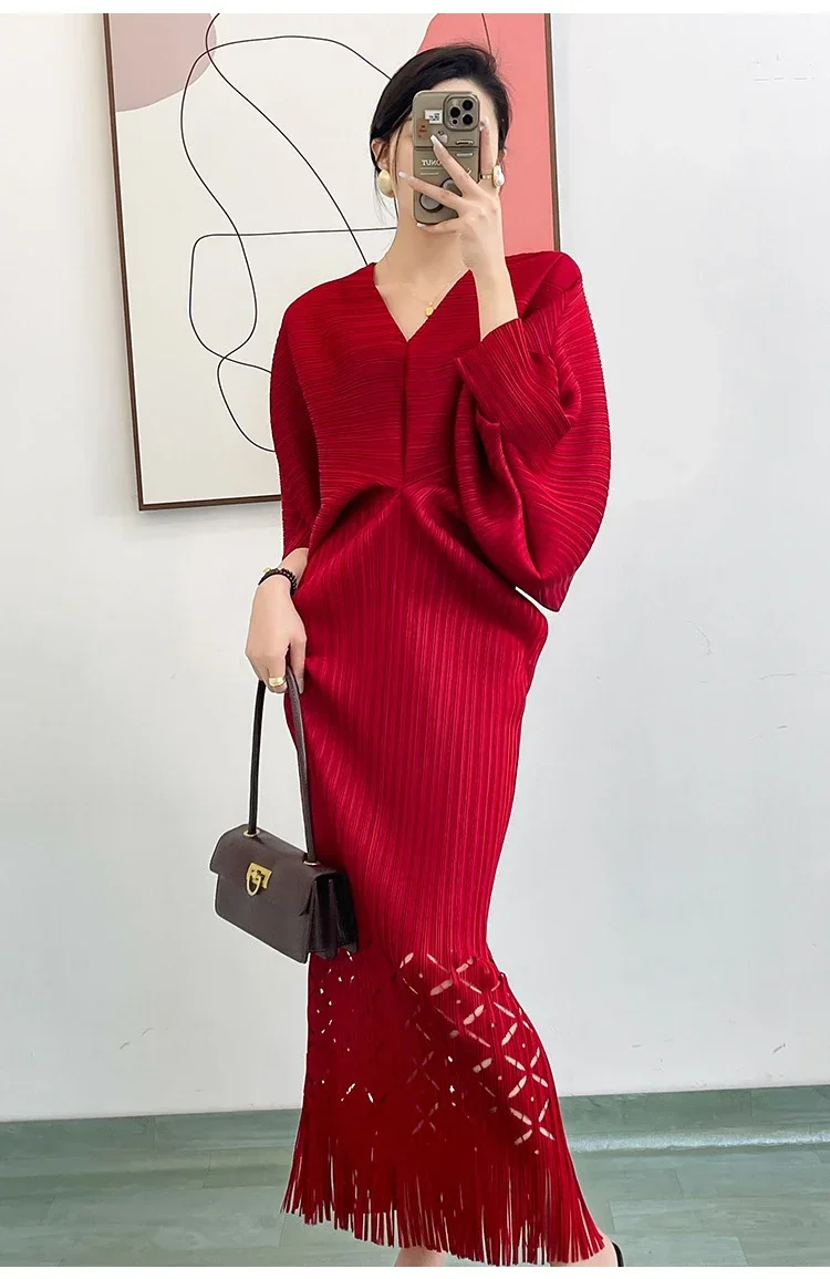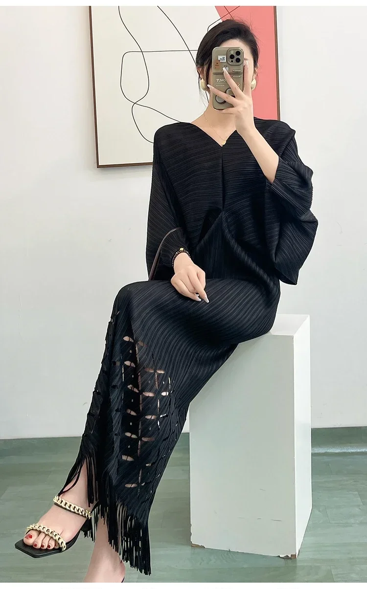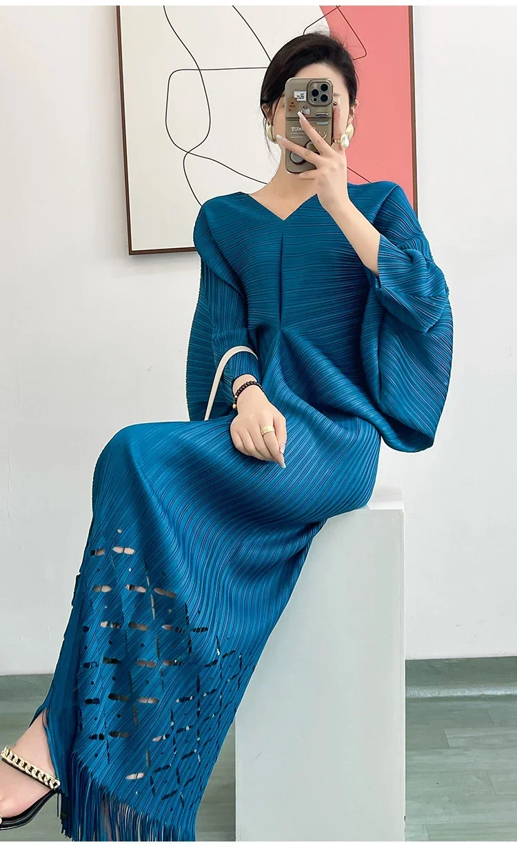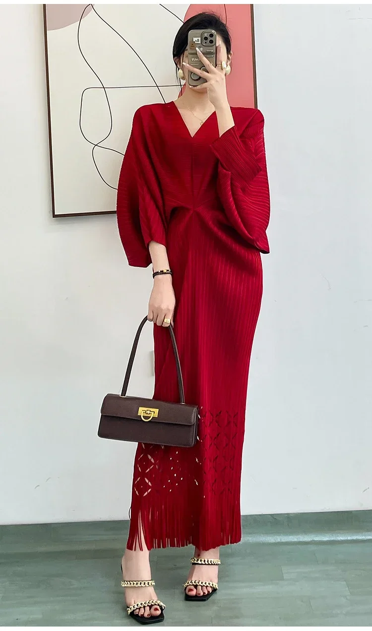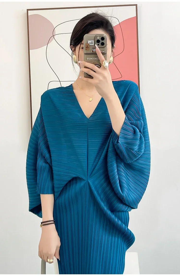 Miyake Dress Pleated Fashion Solid Color Bat Sleeve V-neck Formal Holiday Evening Dress 2024 Summer Maxi Dresses for Women