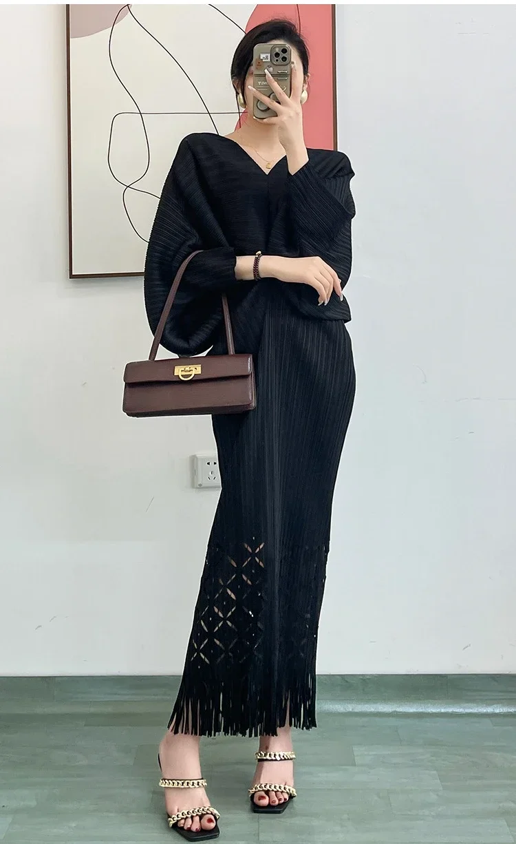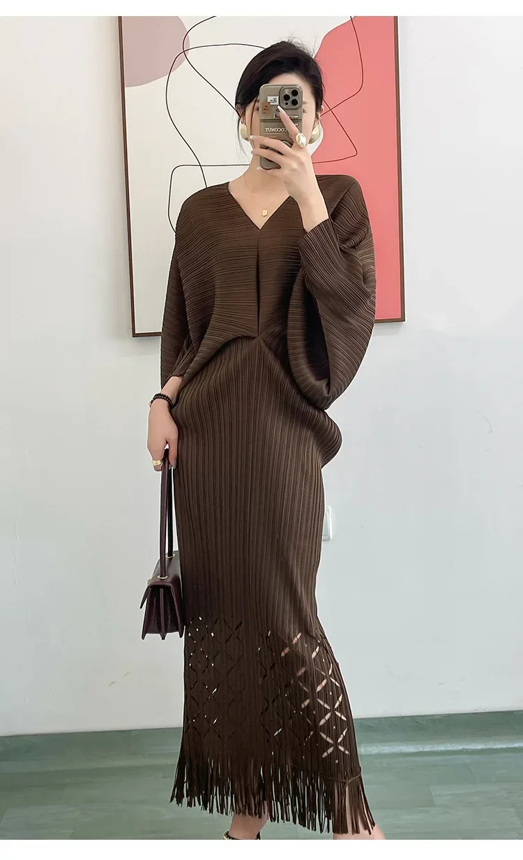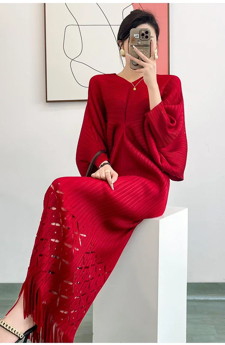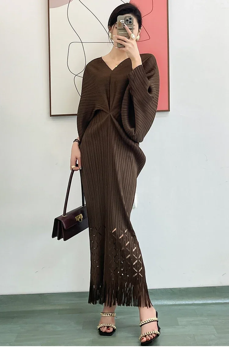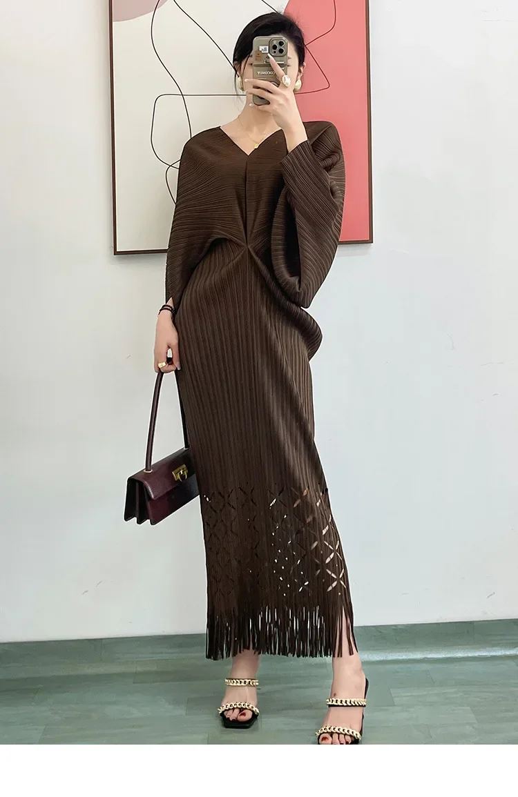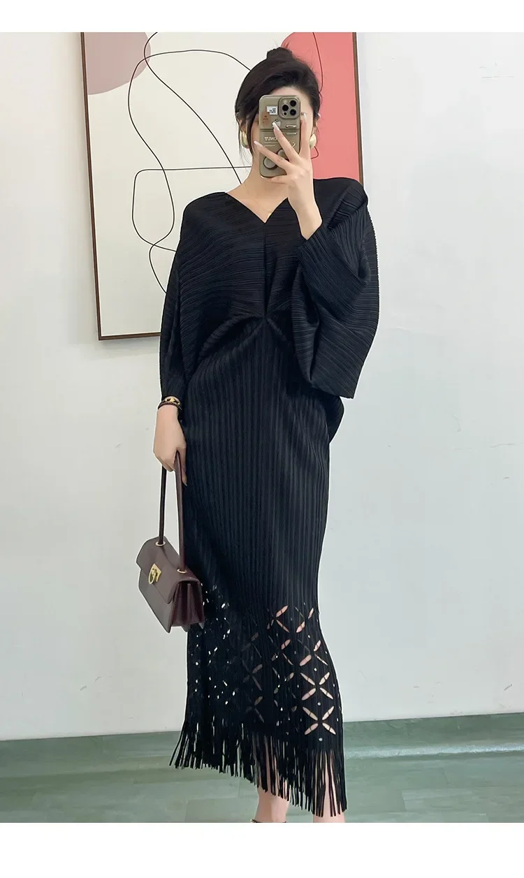 Miyake Dress Pleated Fashion Solid Color Bat Sleeve V-neck Formal Holiday Evening Dress 2024 Summer Maxi Dresses for Women