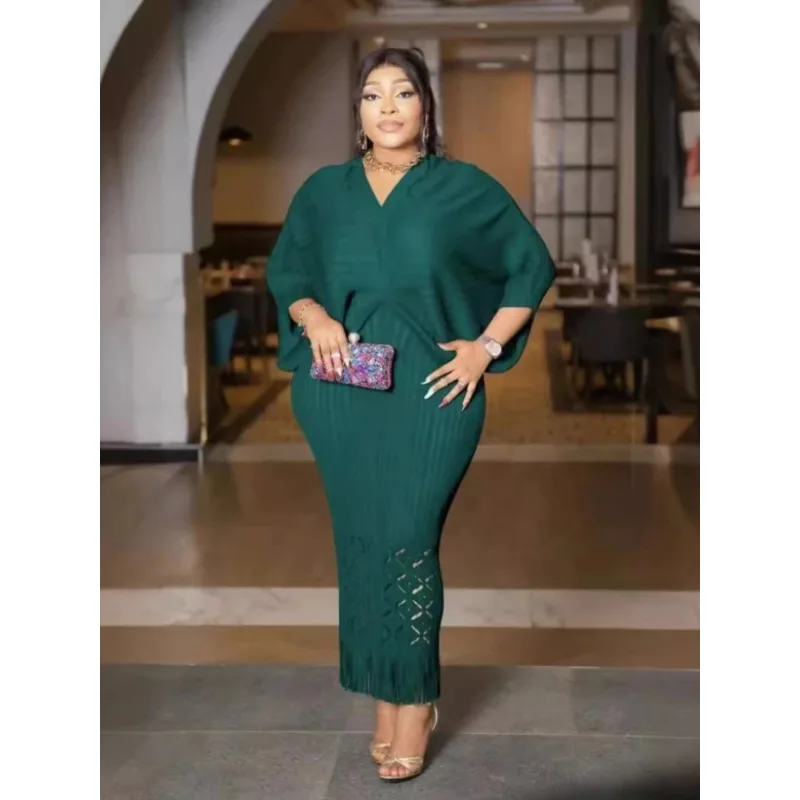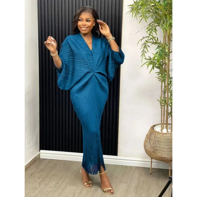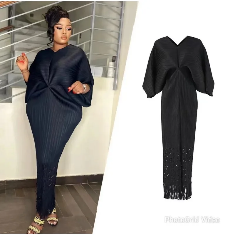 Miyake Dress Pleated Fashion Solid Color Bat Sleeve V-neck Formal Holiday Evening Dress 2024 Summer Maxi Dresses for Women