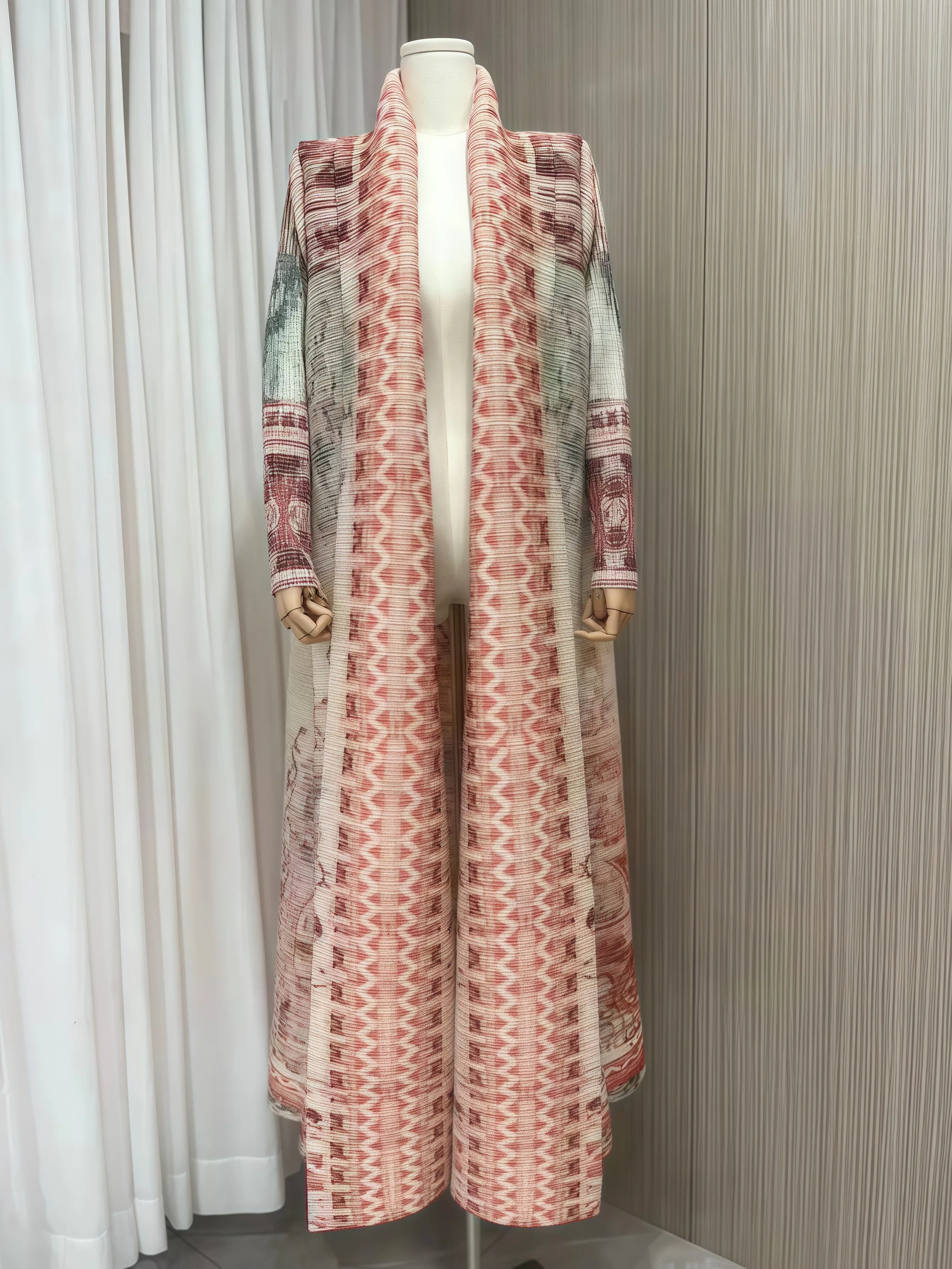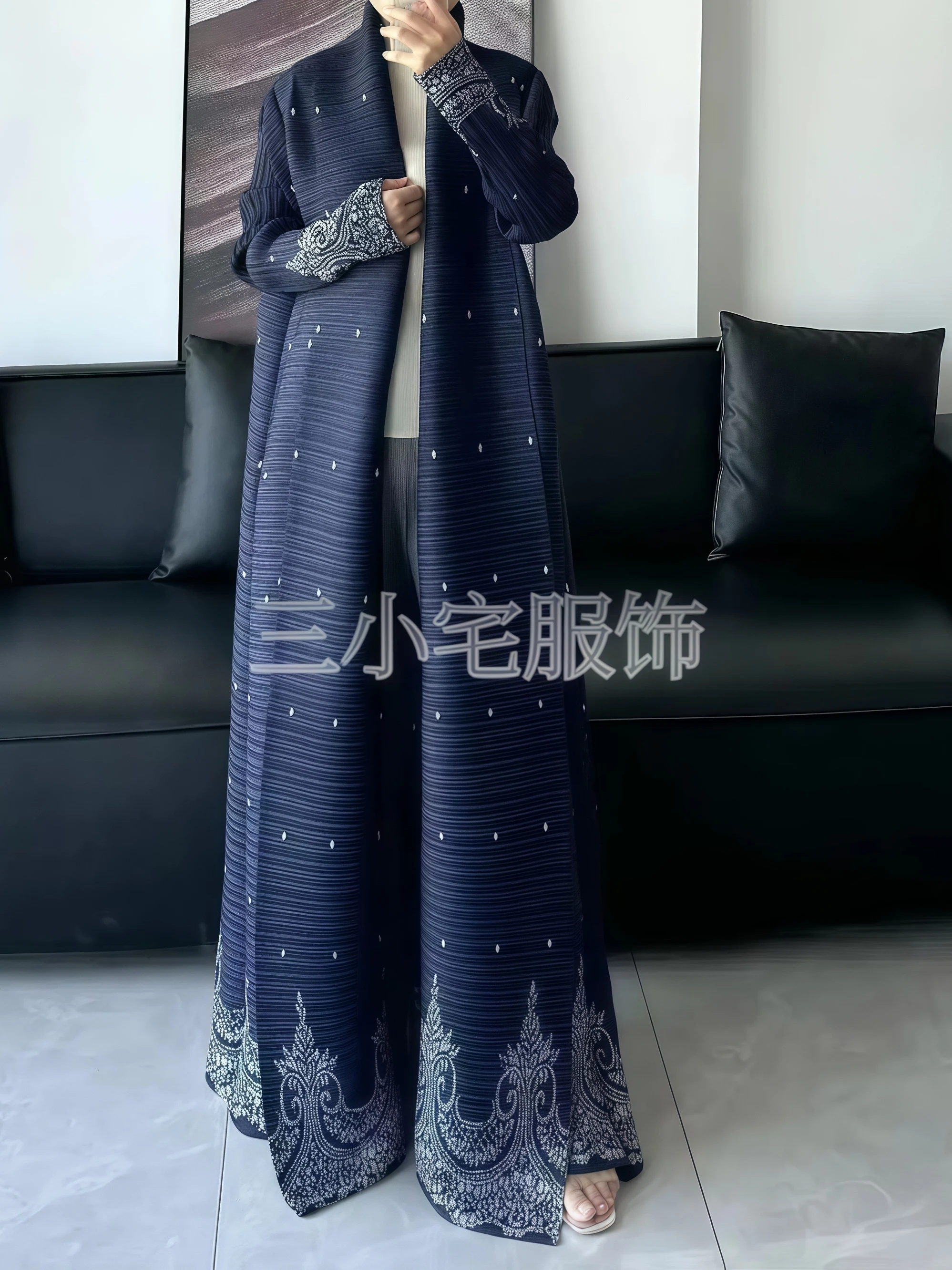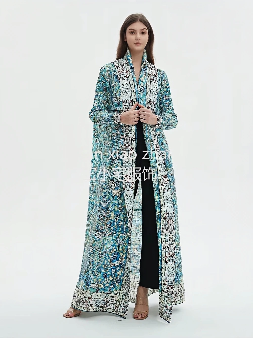 Miyake Pleated Abaya Print Foldable Collar Women’s Long Sleeve Robe 2024 New Winter Original Design Fashion Cardigan Coat
