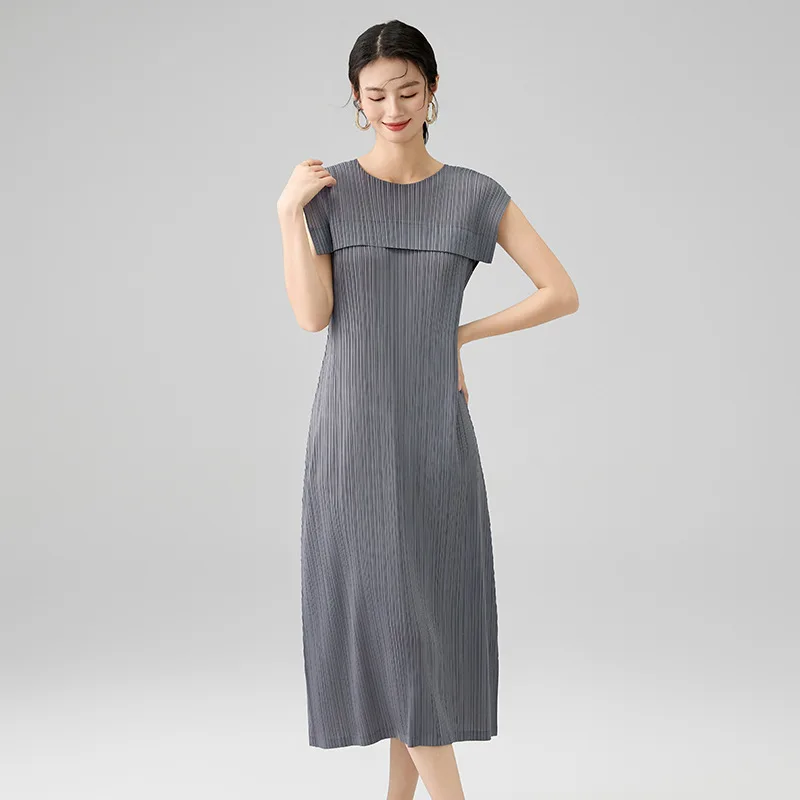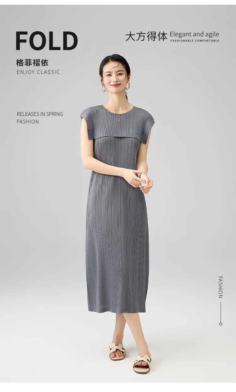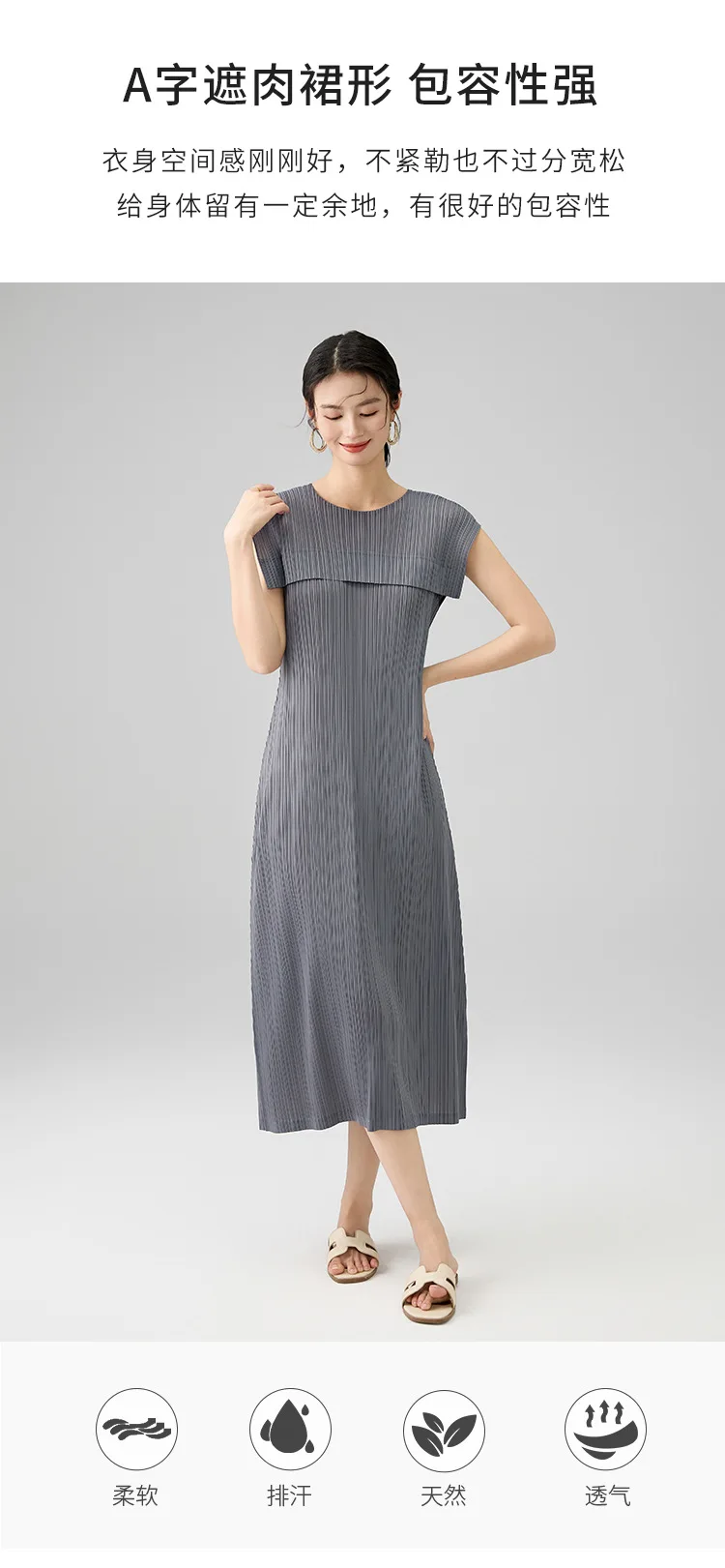 Miyake Pleated Splicing Dress 2025 Spring and Summer New Temperament Round Neck Sleeveless Comfortable Casual Peplum Long Skirt