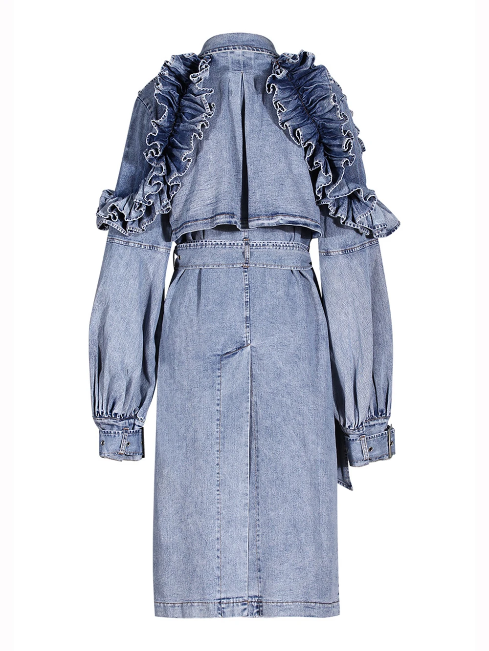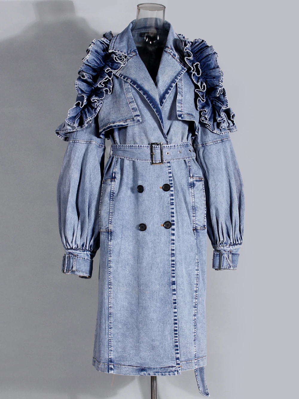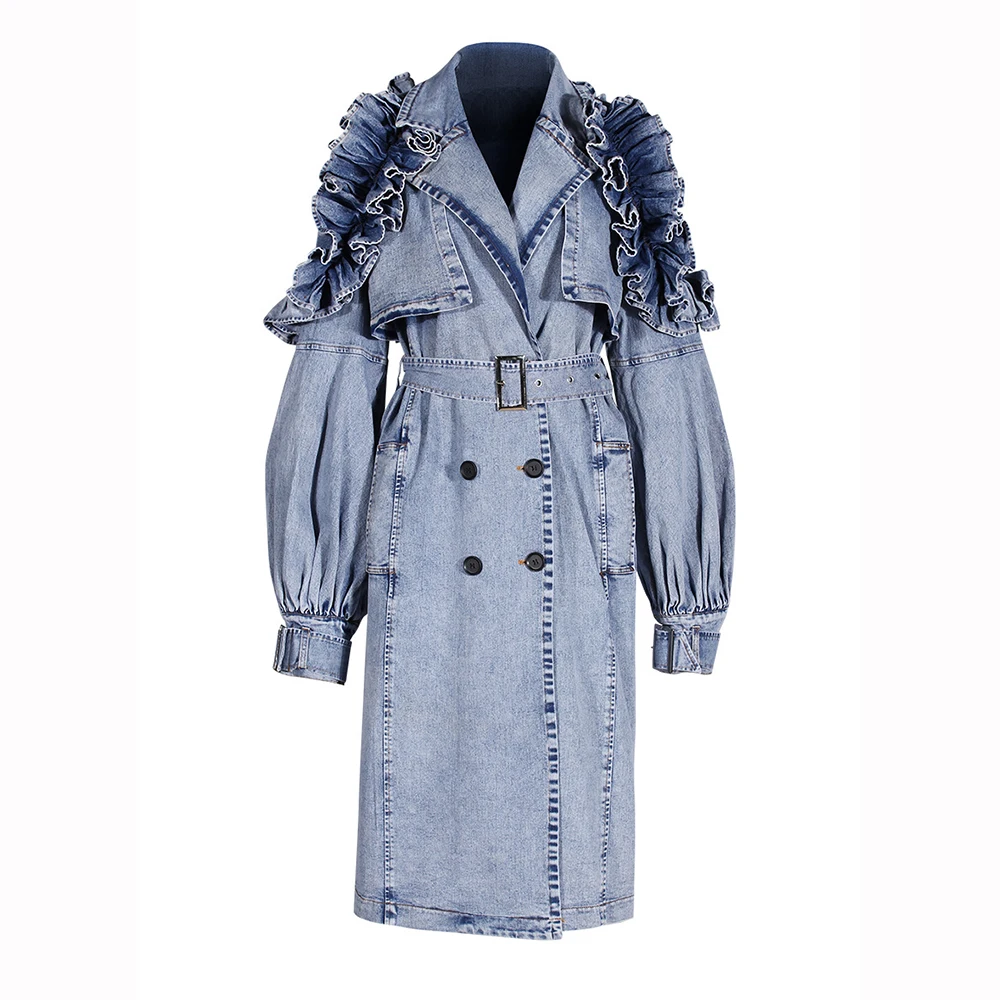 Modphy Autumn Oversized Blue Long Denim Trench Coat for Women Double Breasted Ruffle Loose Casual Fashion Overcoat 2025
