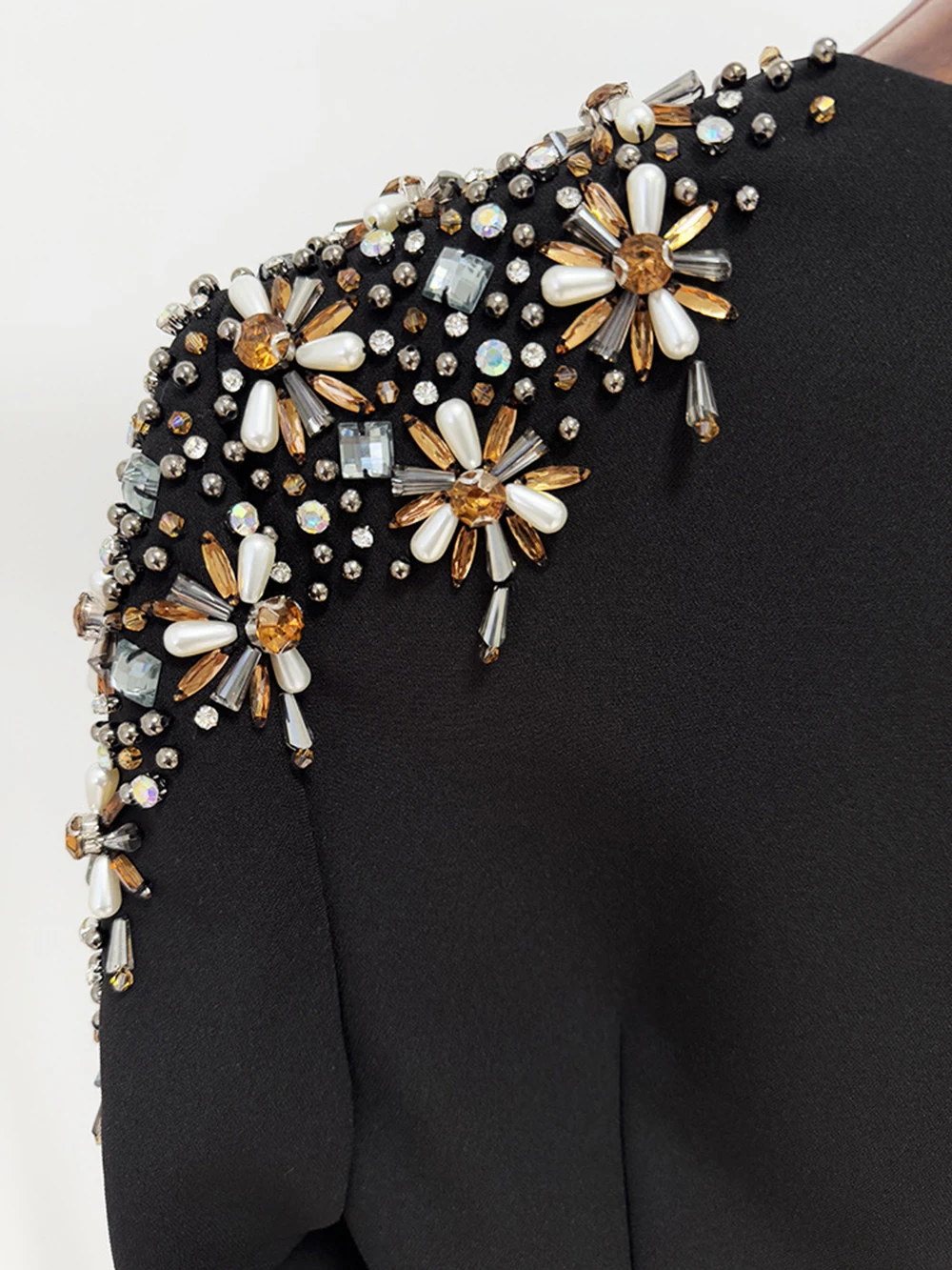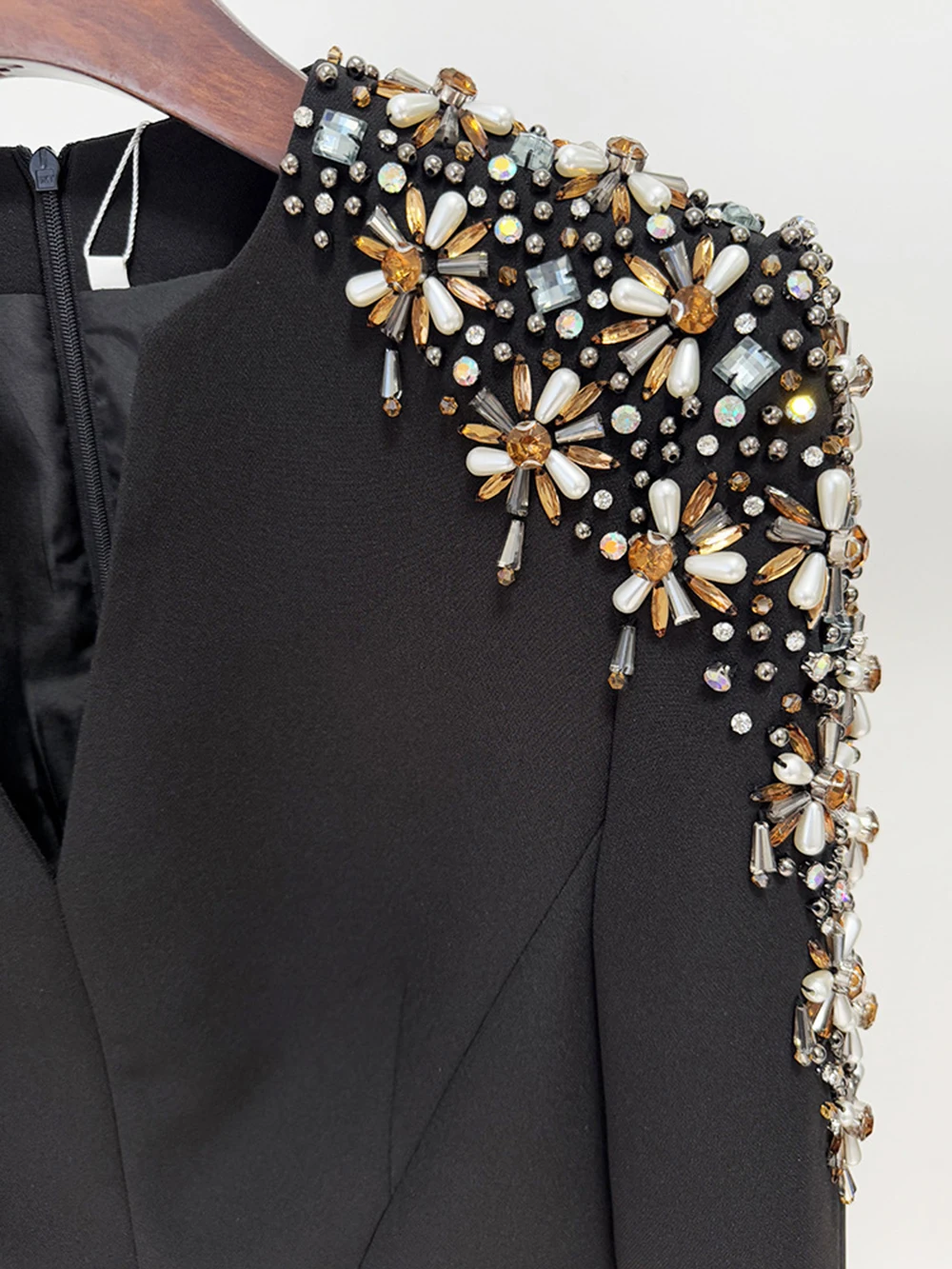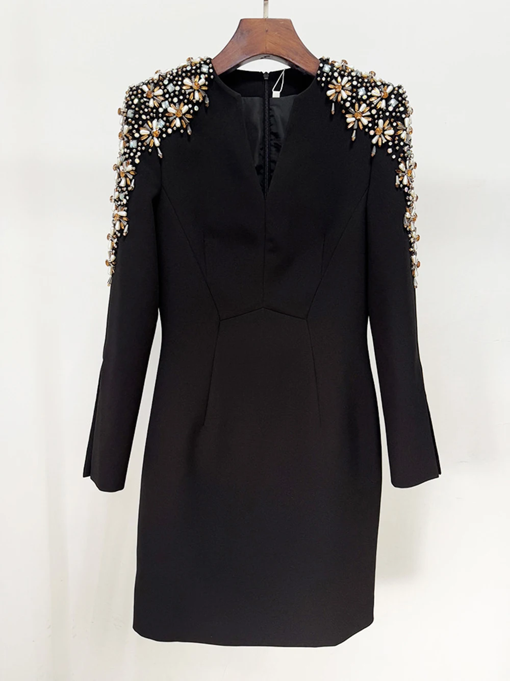 Modphy Fashion Women’s Nail Bead Diamond Mini Dress Black V Neck Long Sleeve Elegant Dresses 2025 New Clothing Female Vestidos