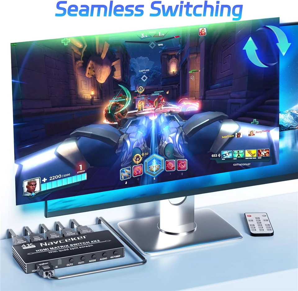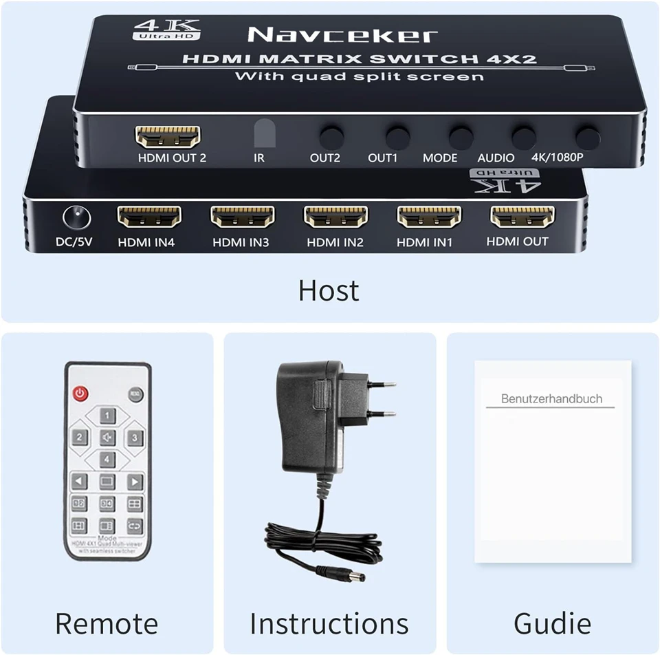 Navceker HDMI 4×2 Multi-viewer switcher 4K Seamless Quad Screen Multi Viewer Splitter 4 in 2 out HDMI Switch Adapter IR for PC