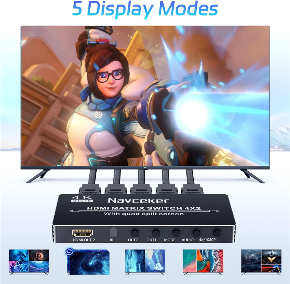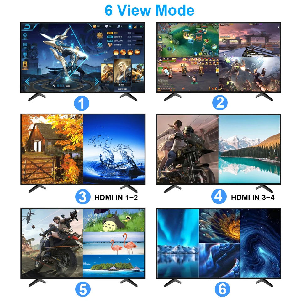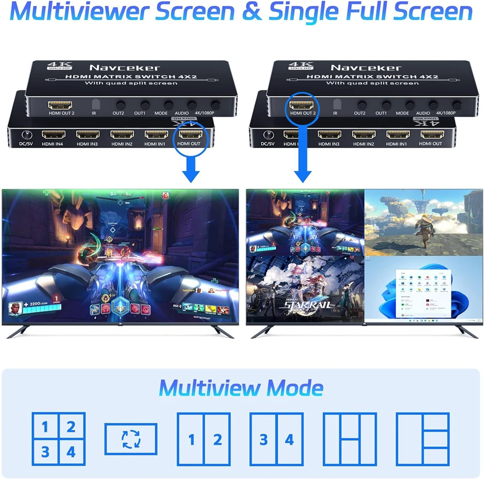 • 5 Ways Viewing Screen:The 4X2 Quad MultiView Matrix Selector support 5 viewing modes. 5 Display Modes: Full-screen mode, dual-screen mode, 4 equal-screen mode, 1 big 3 small-screen mode, 2 big 2 small-screen mode.You could see 4 HDMI input sources screen on one monitor by 5 ways view, and one monitor with single full screen;