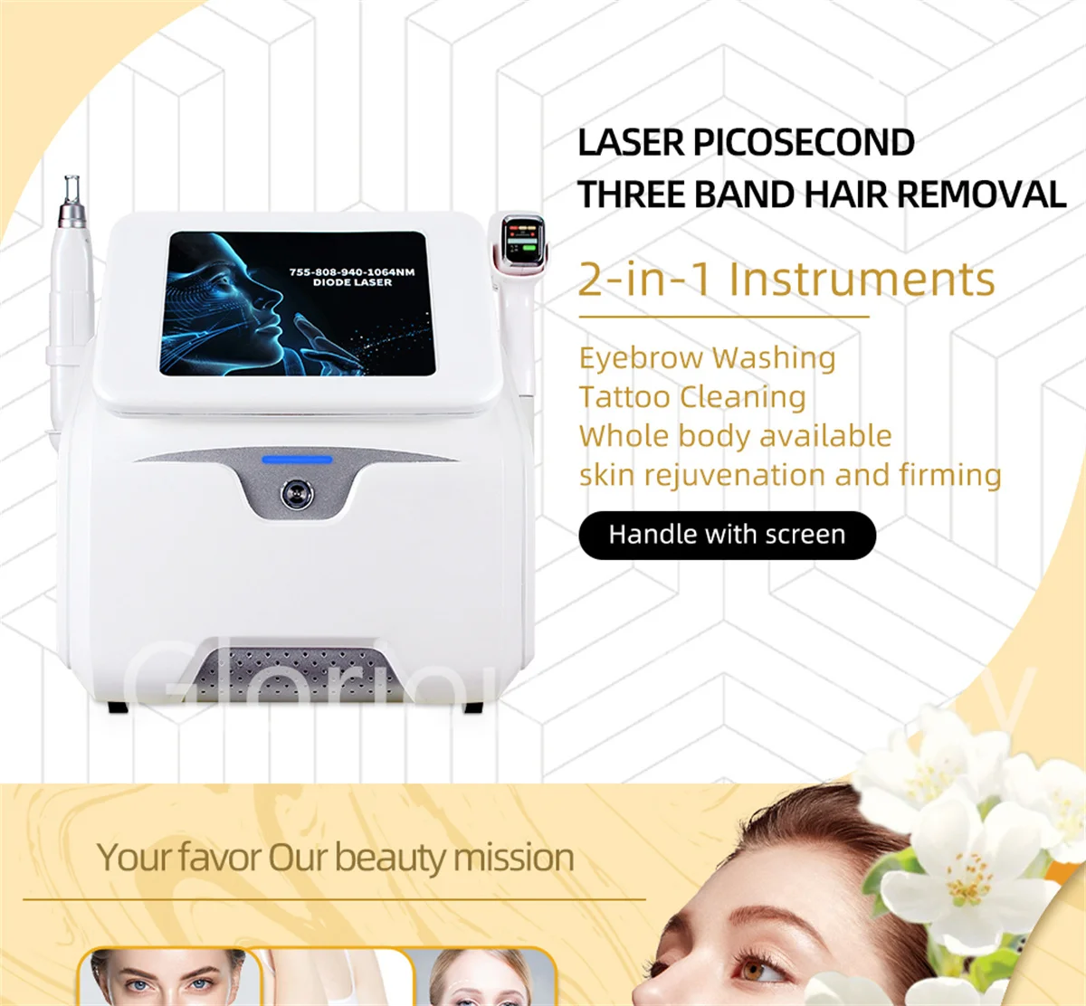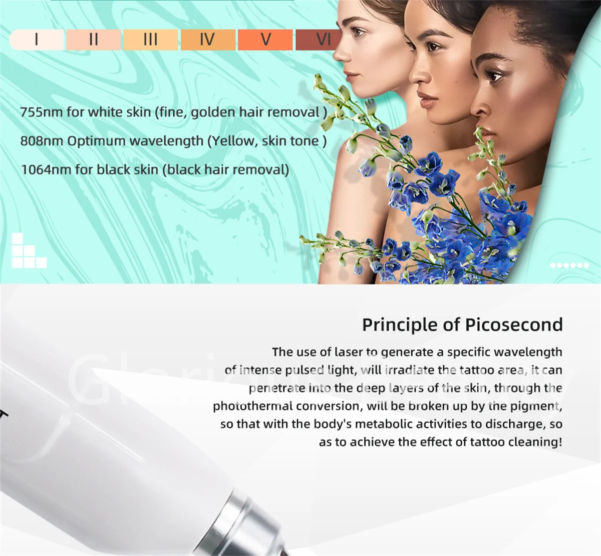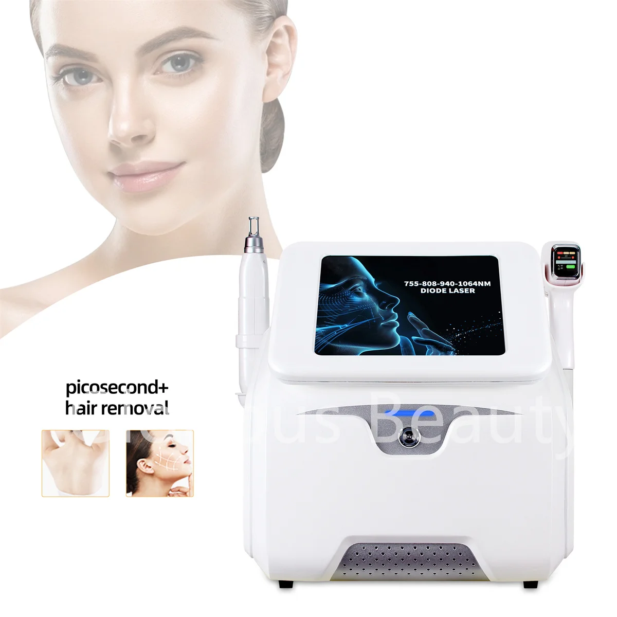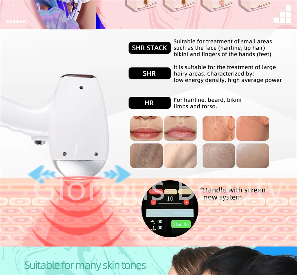 Safe hair removal on nearly all skin types, big spot size, much more efficient for bing area hair removal.