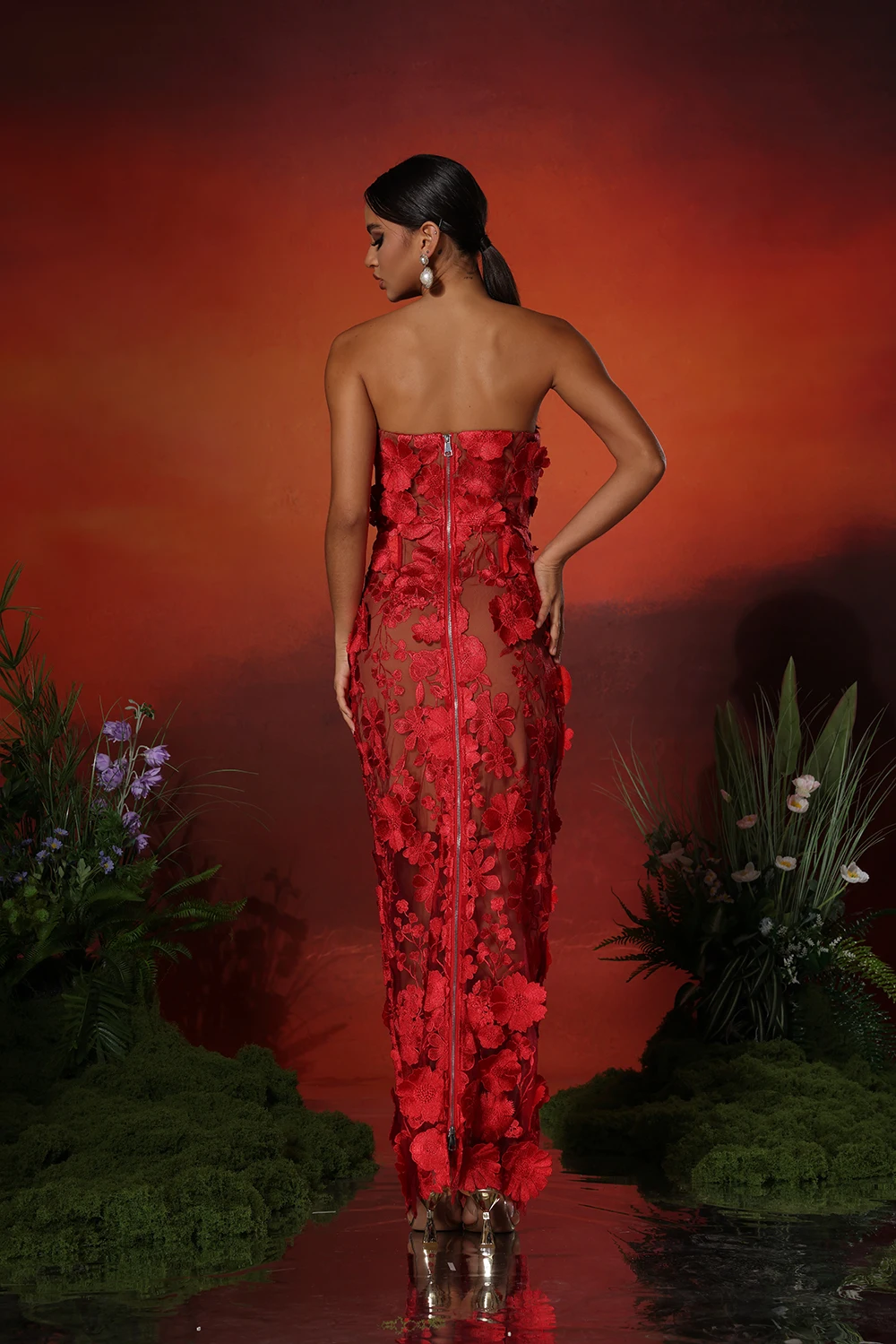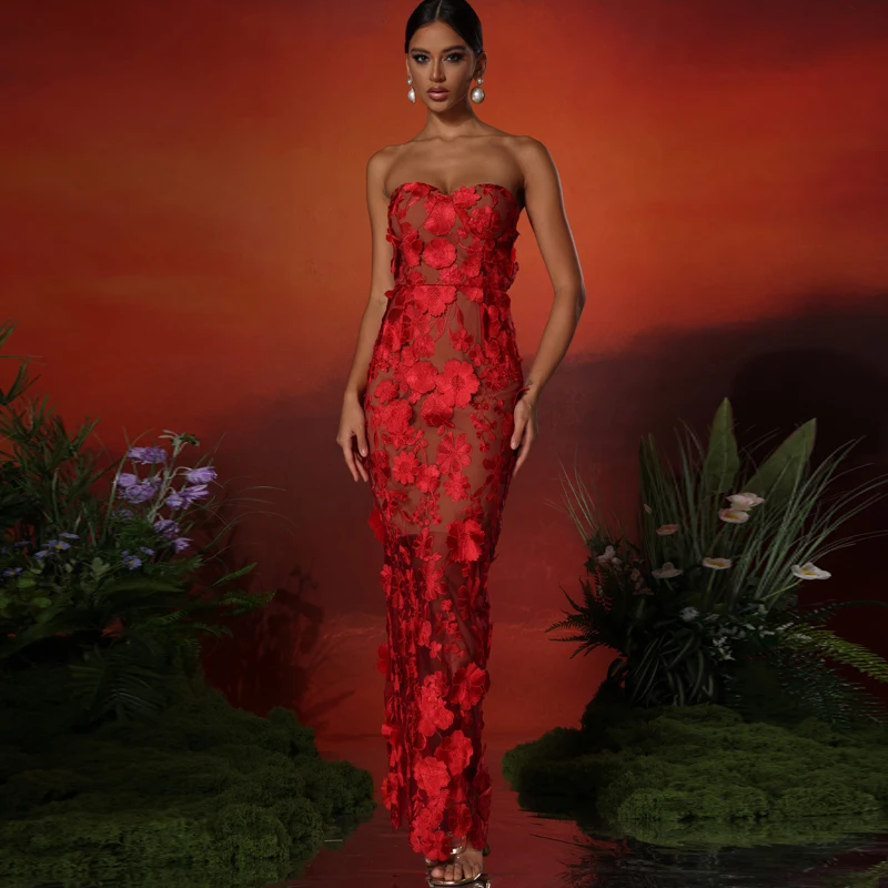 New red embroidered flower strapless dress, women’s slim and sexy party dress, long skirt