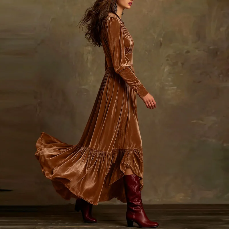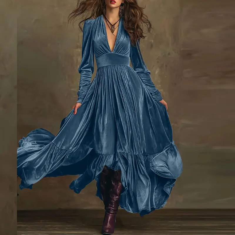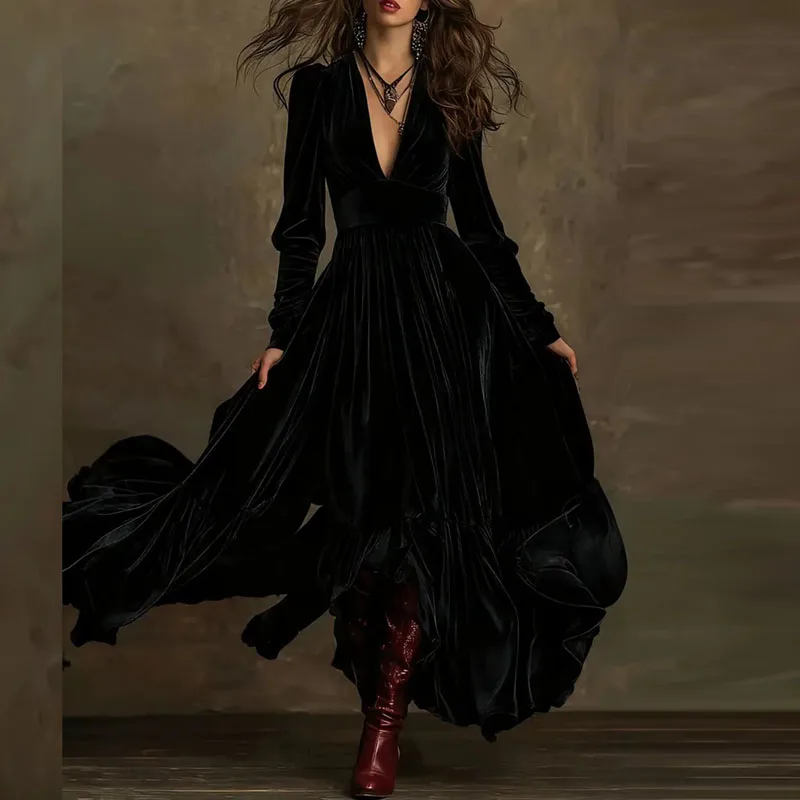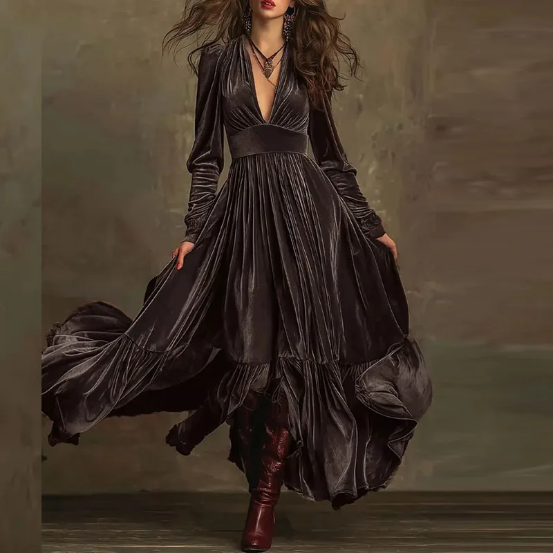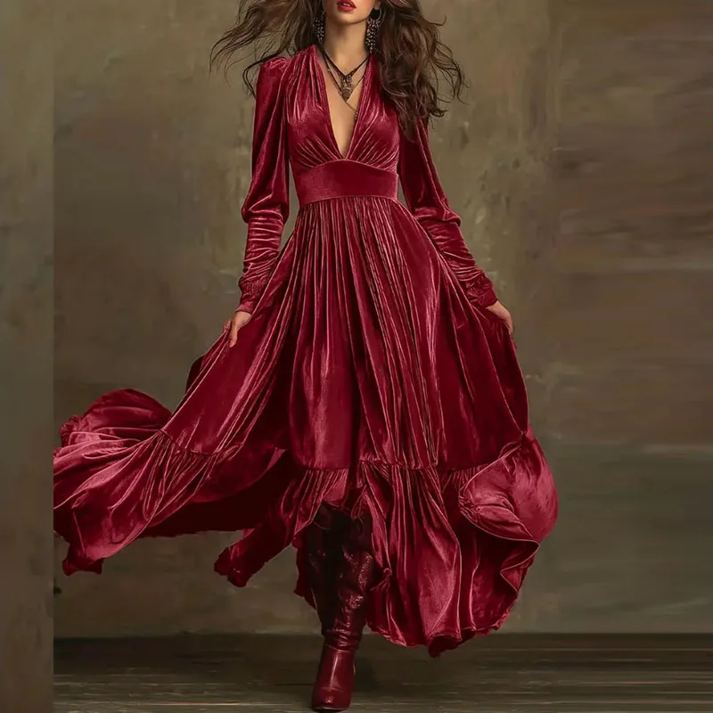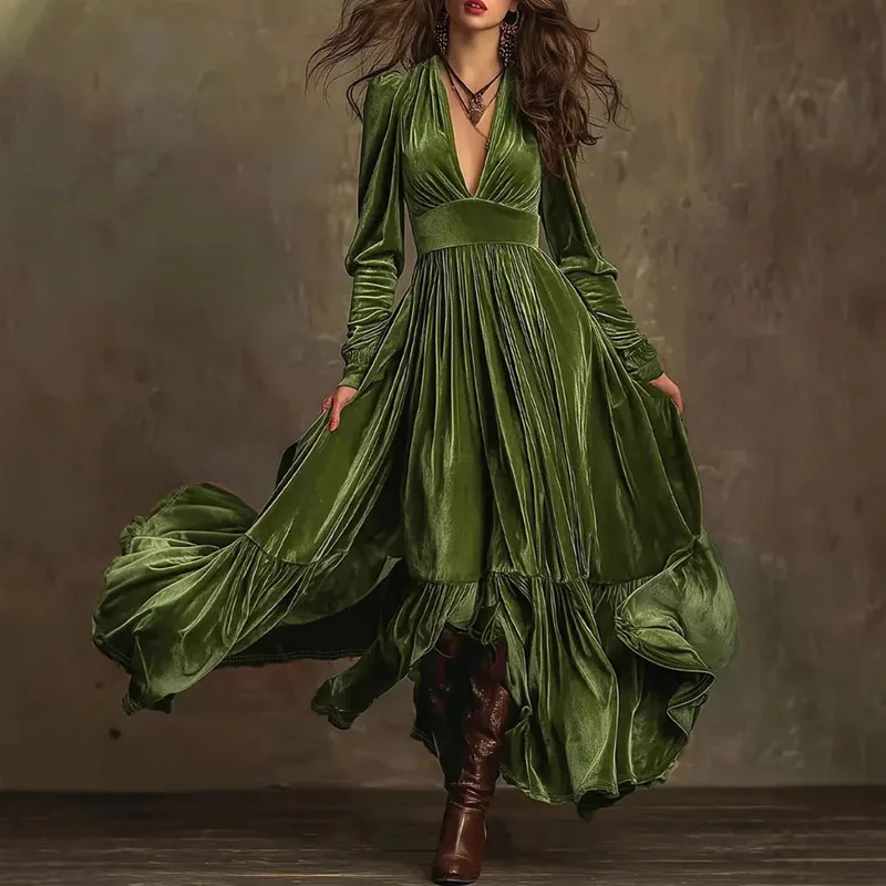 New Retro Solid High Waist Pleated Velvet Dress Woman Sexy Deep V Neck Swing Long Dress Fall Winter Long Sleeve Loose Maxi Dress