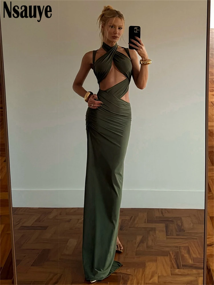Nsauye Patchwork Hollow Out Slim Elegant Evening Maxi Dresses For Women Chic Party Long Dress Vestidos Winter New 2025 Lady Club