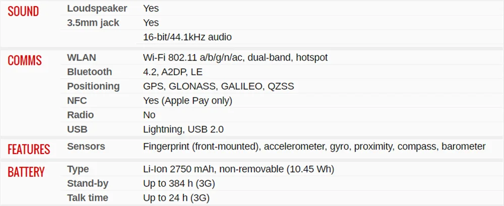 - NFC:Â Yes (Apple Pay only)