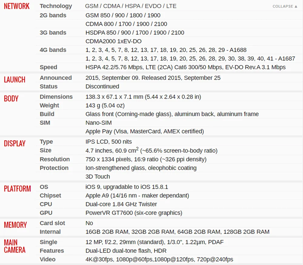 - Apple Model:Â iPhone 6s