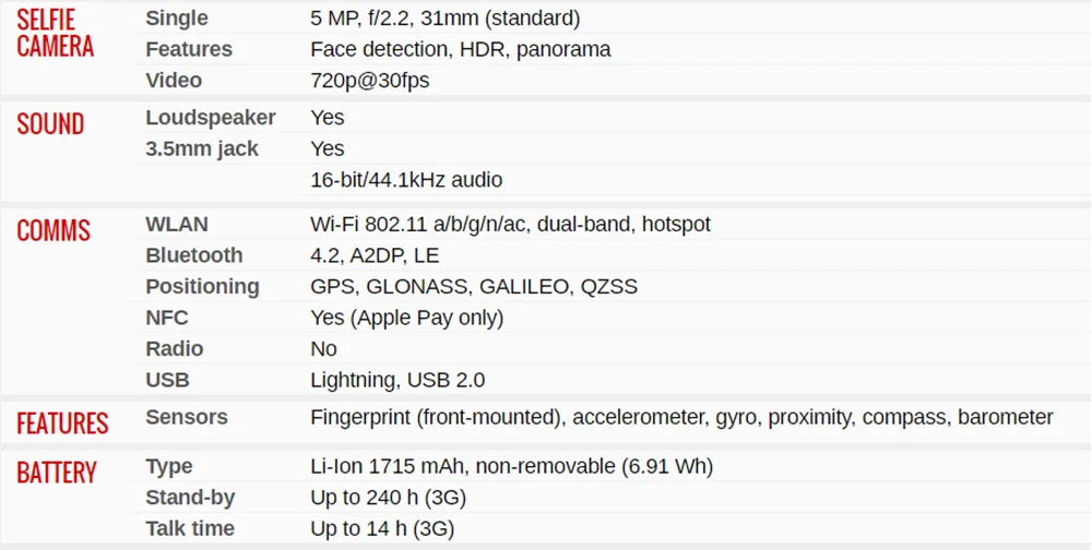 - NFC:Â Yes (Apple Pay only)