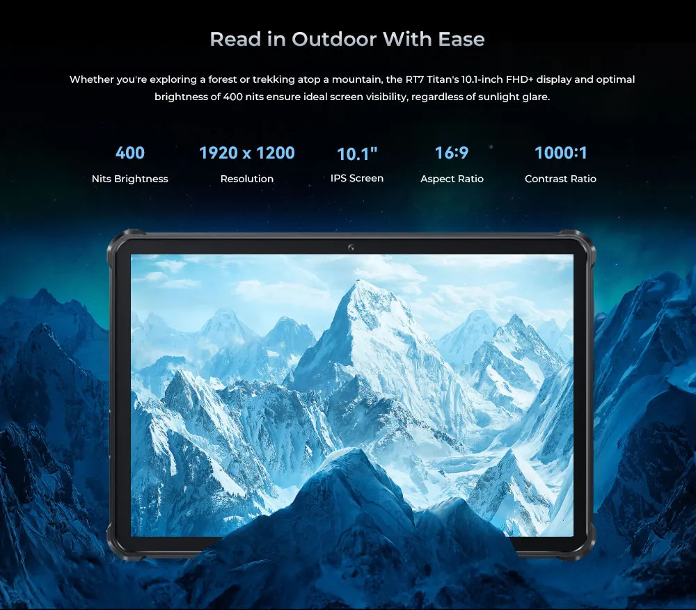 Whether you’re exploring a forest or trekking atop a mountain, the RT7 Titan’s 10.1-inch FHD+ display and optimal brightness of 400 nits ensure ideal screen visibility, regardless of sunlight glare.