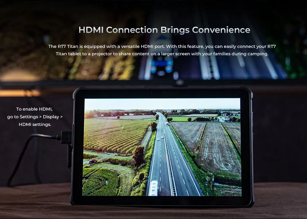 The RT7 Titan is equipped with a versatile HDMI port. With this feature, you can easily connect your RT7 Titan tablet to a projector to share content on a larger screen with your families during camping.