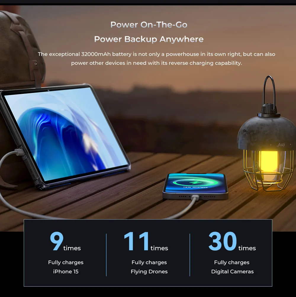 The exceptional 32000mAh battery is not only a powerhouse in its own right, but can also power other devices in need with its reverse charging capability.