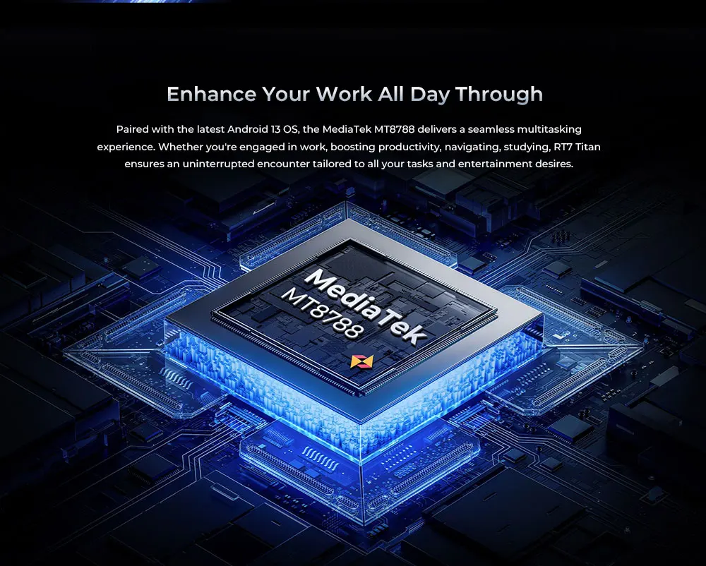 Paired with the latest Android 13 OS, the MediaTek MT8788 delivers a seamless multitasking experience. Whether you’re engaged in work, boosting productivity, navigating, studying, RT7 Titan ensures an uninterrupted encounter tailored to all your tasks and entertainment desires.HDMI Connection Brings Convenience