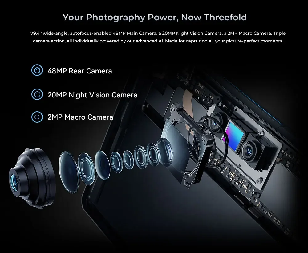 79.4° wide-angle, autofocus-enabled 48MP Main Camera, a 20MP Night Vision Camera, a 2MP Macro Camera. Triple camera action, all individually powered by our advanced Al. Made for capturing all your picture-perfect moments.