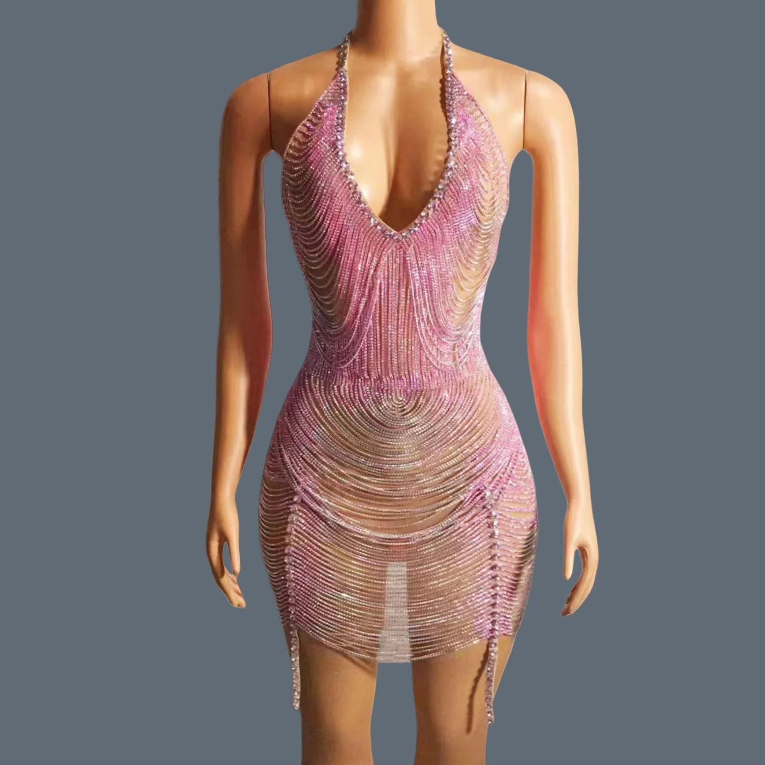 Perspective Dance Wear Women’s Birthday Prom Celebrate Outfit Bar Evening Fringes Dress Sparkly Pink Stones Tassel Dress Yuanpan