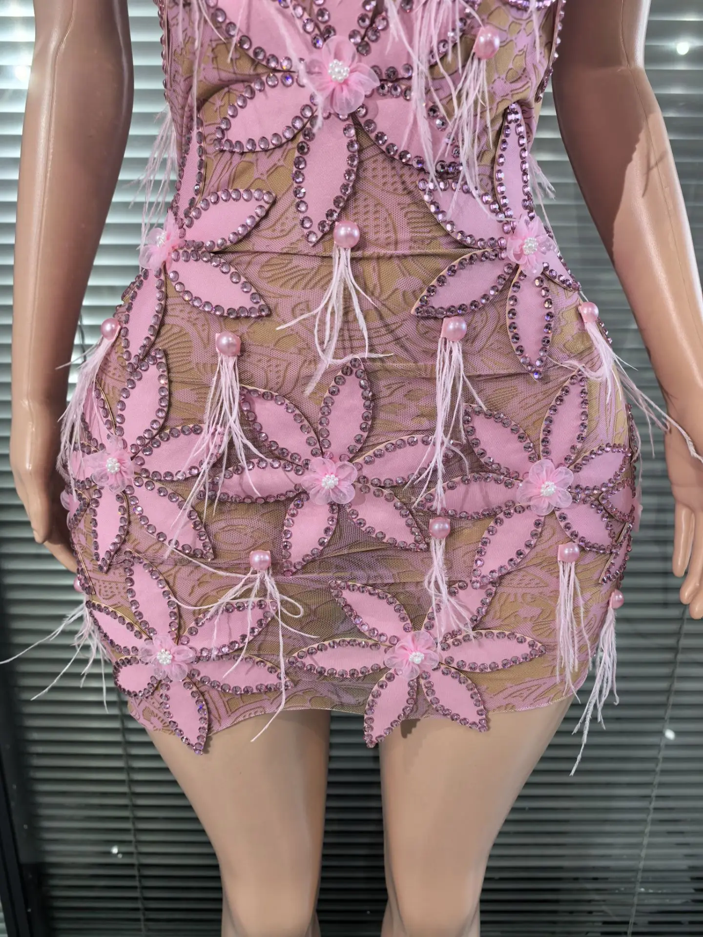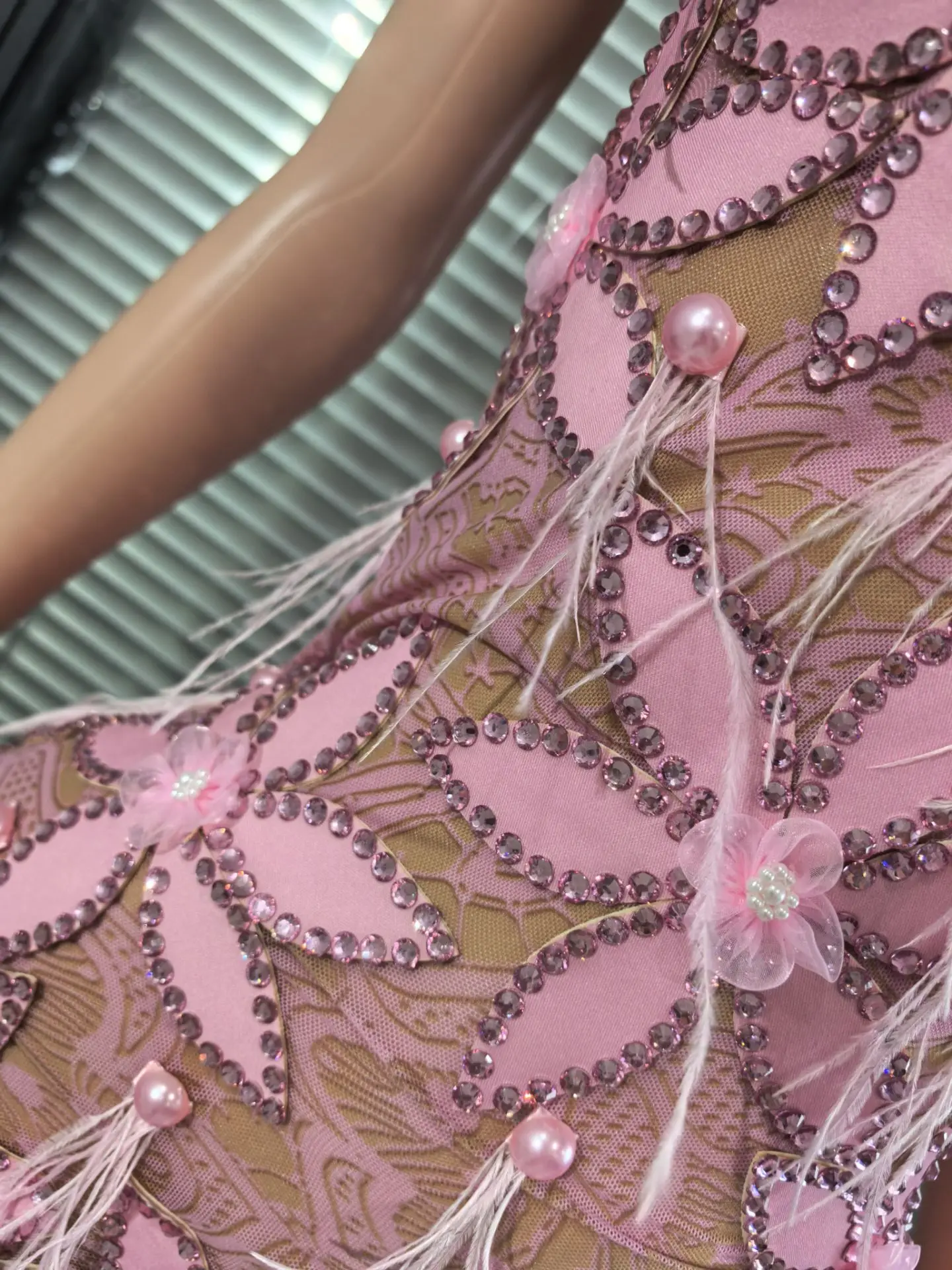 Pink Flower Birthday Concert Performance Clothing Off the Shoulder Cut Out Mesh Sequin Dresses Women Party Night Club outfit