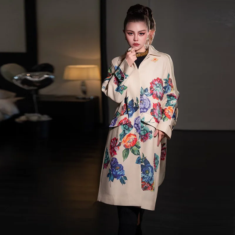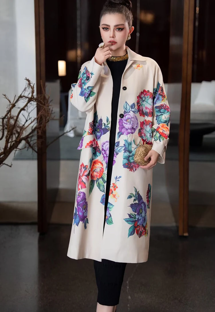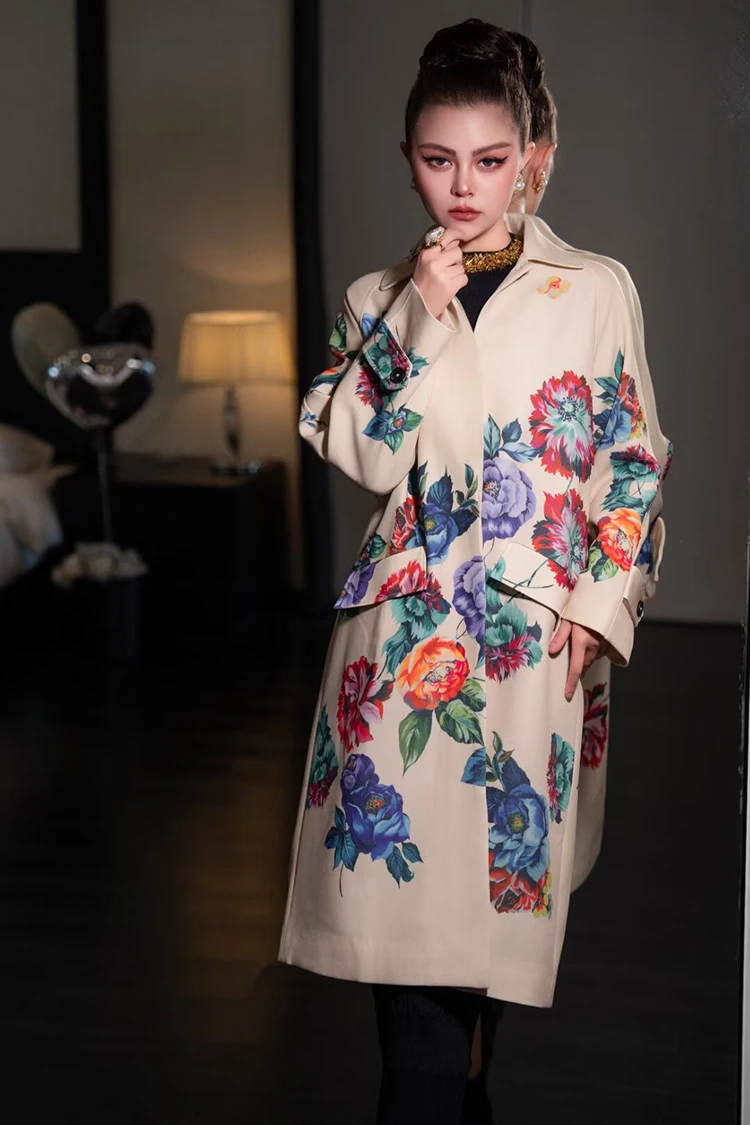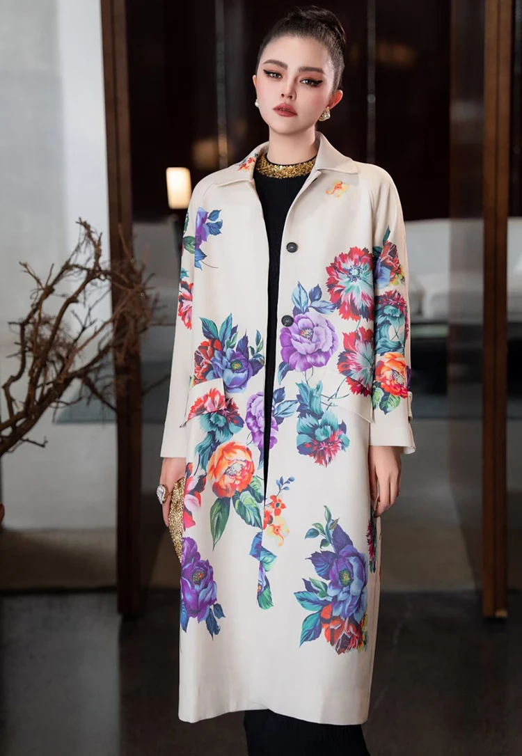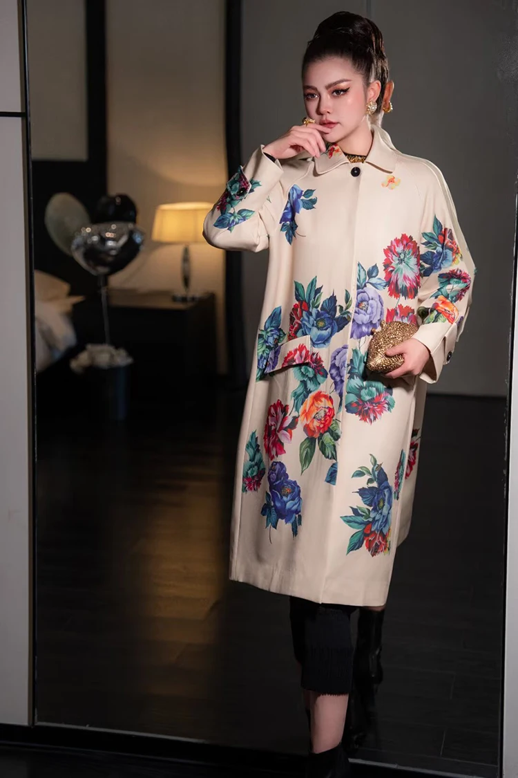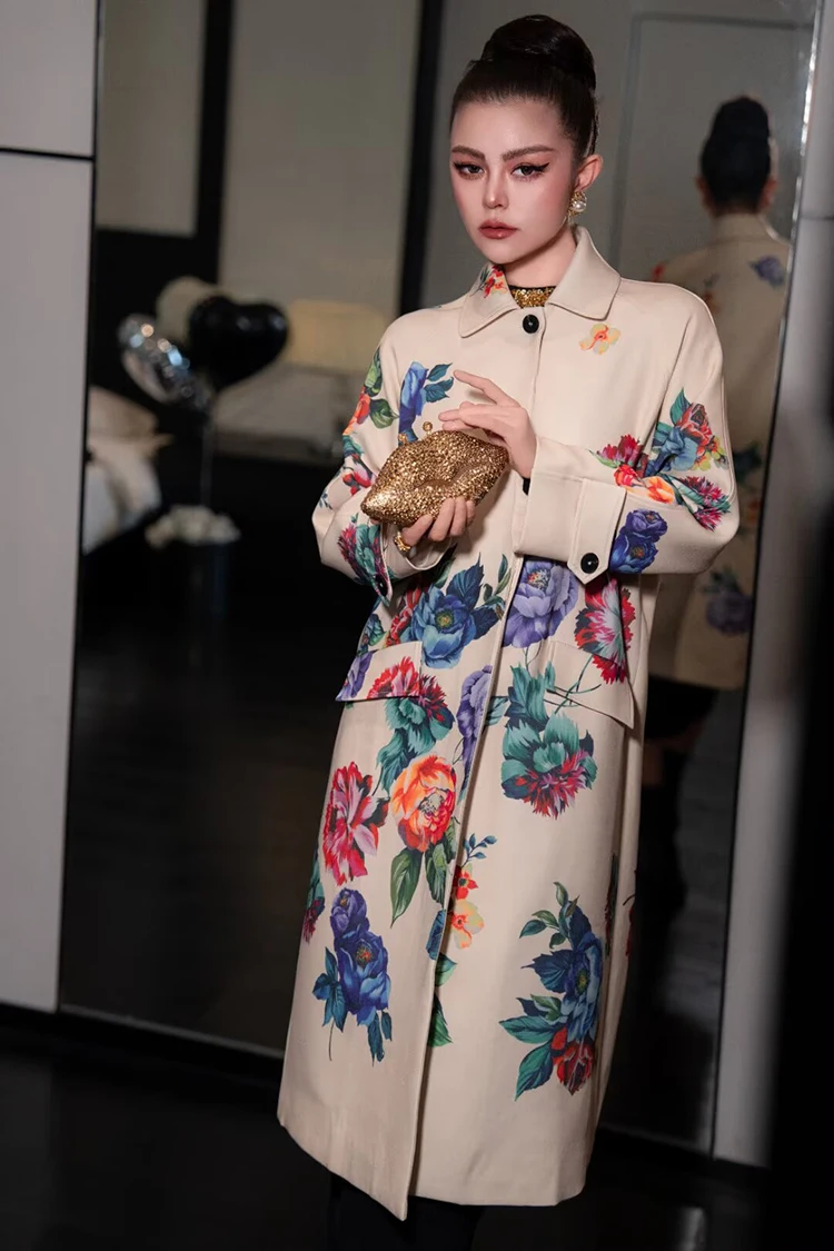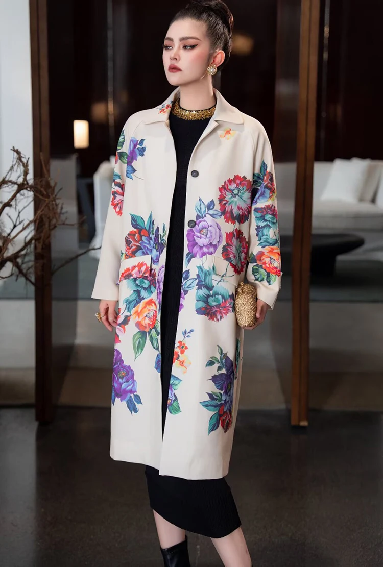 Seifrmann Solid Long Sleeve Turn-Down Collar Coat For Women Single-Breasted Floral-Print Loose Waist Fashion Overcoat