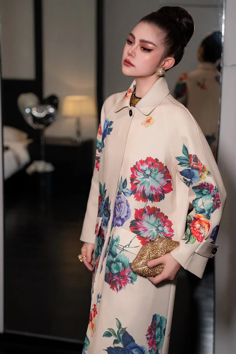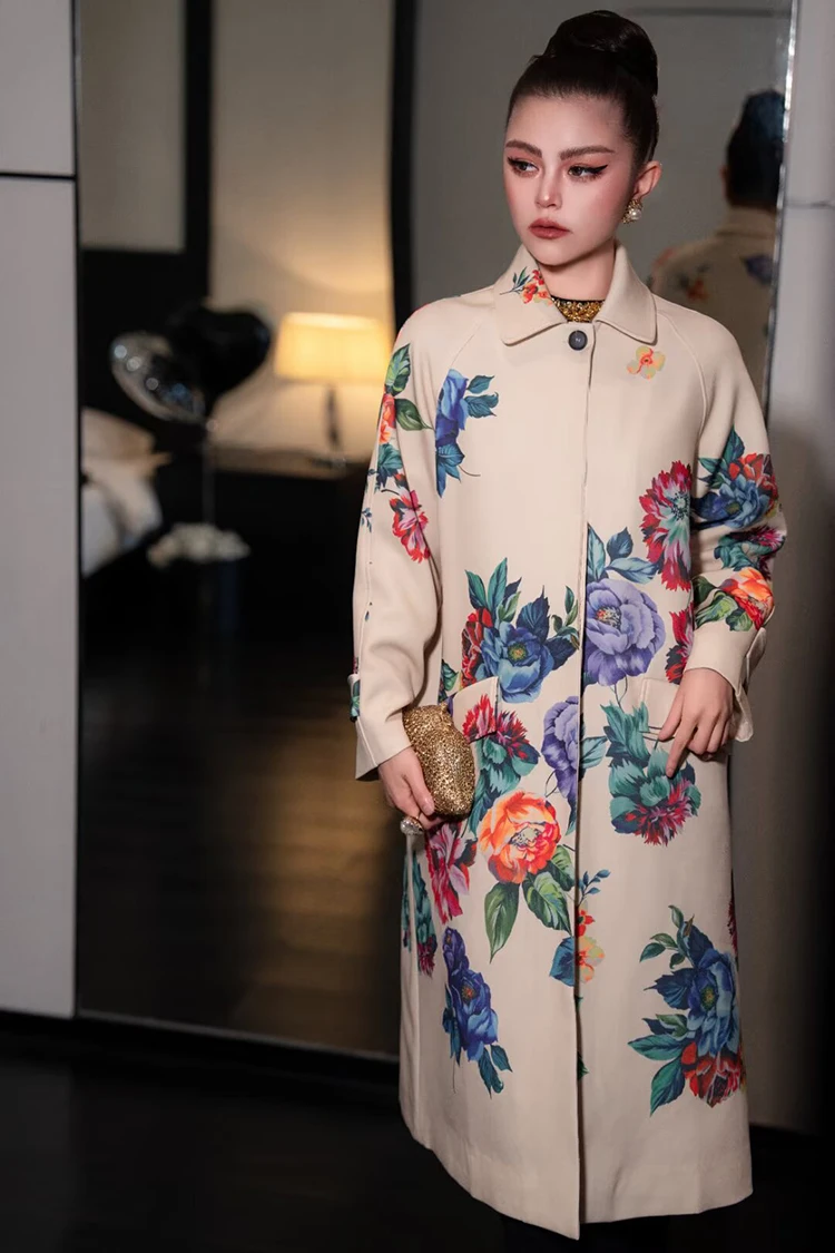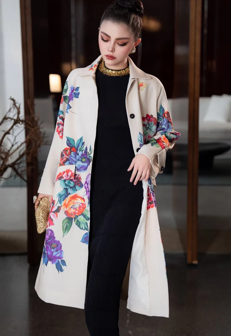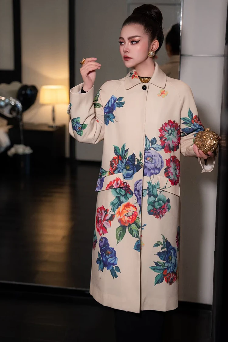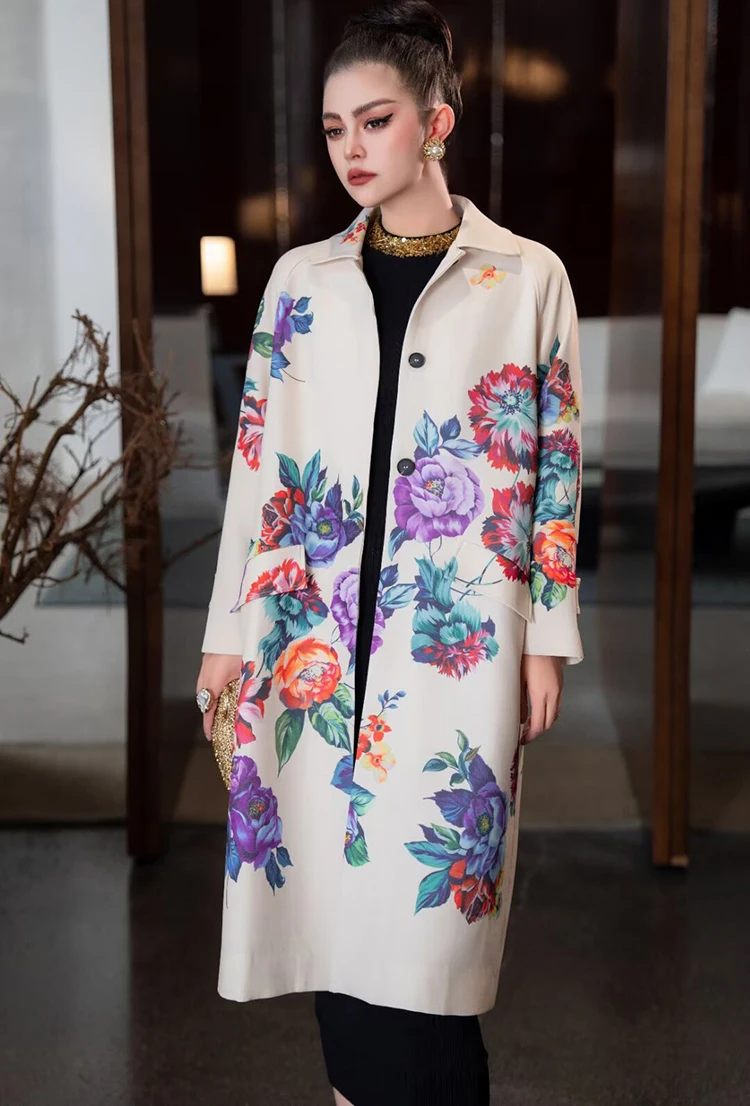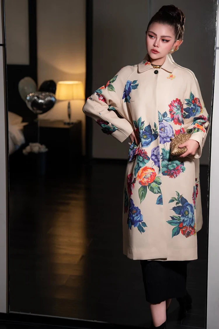 Seifrmann Solid Long Sleeve Turn-Down Collar Coat For Women Single-Breasted Floral-Print Loose Waist Fashion Overcoat