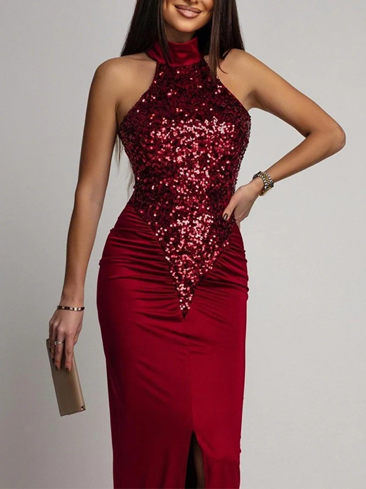 Sexy Draped Hight Waist Long Dress Fashion Sequin Splicing Sleeveless Gowns Dress Women Elegant Split Solid Slim Evening Dress