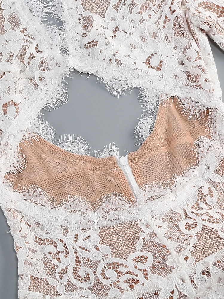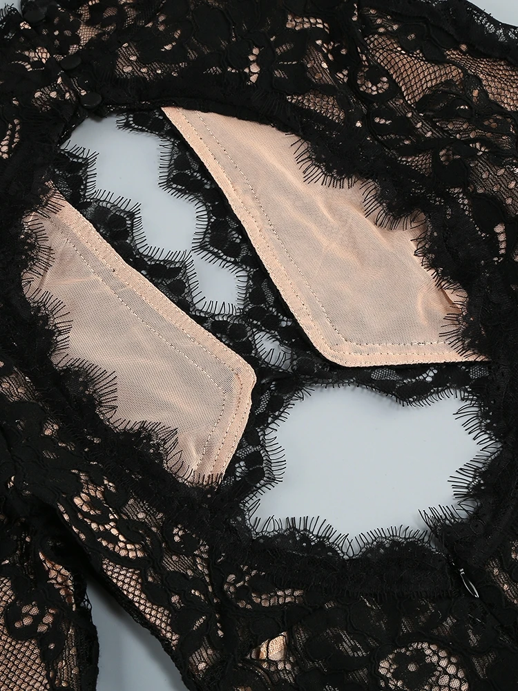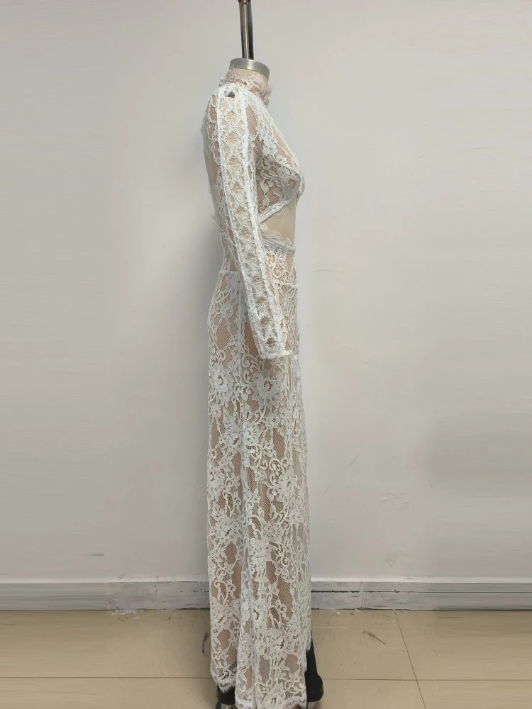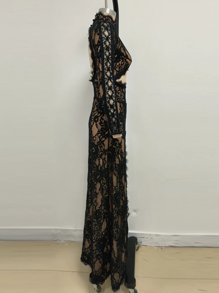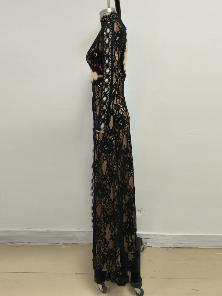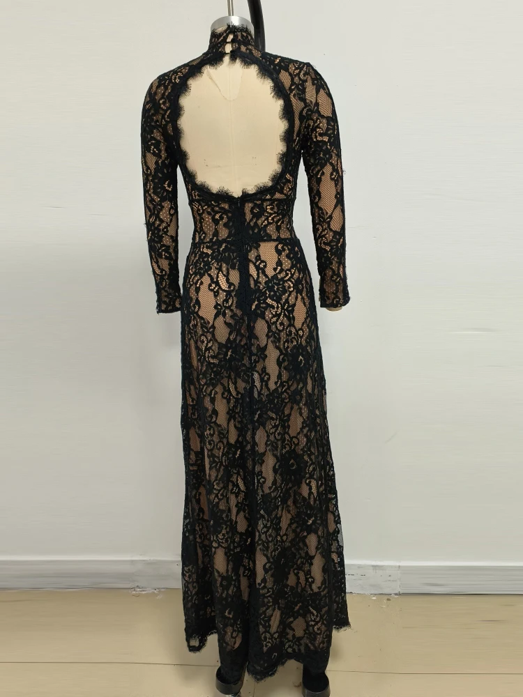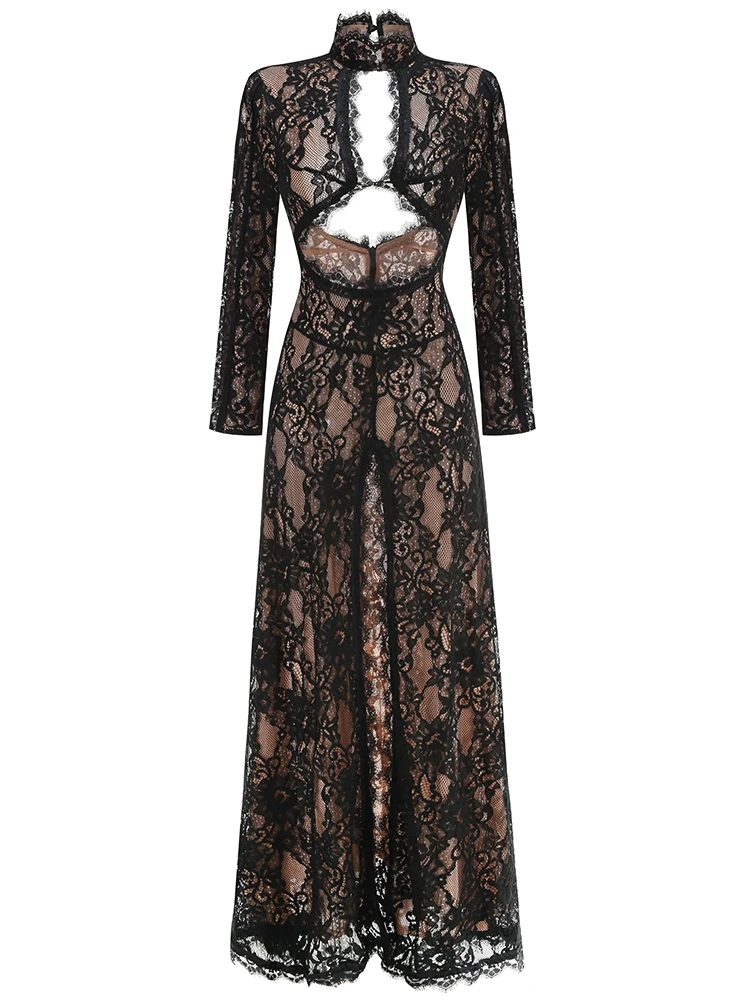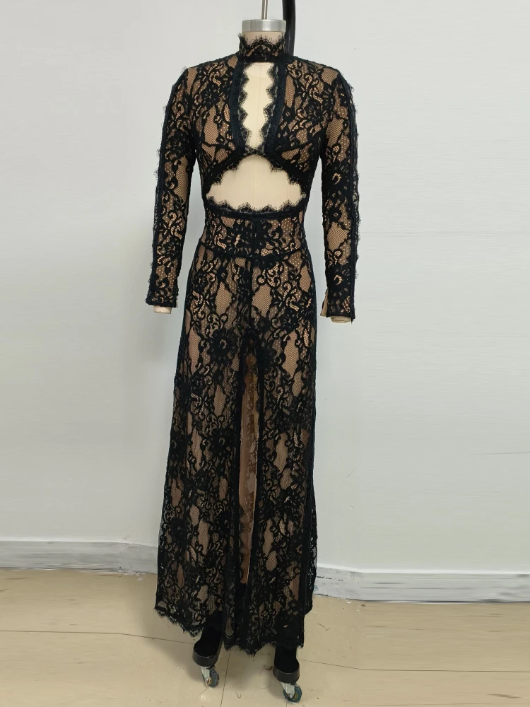 Sexy Long Sleeve Lace Hollow Out Design Long Dress Women Black O Neck Cut Out Split Slim Dresses Evening Party Cocktail Gowns