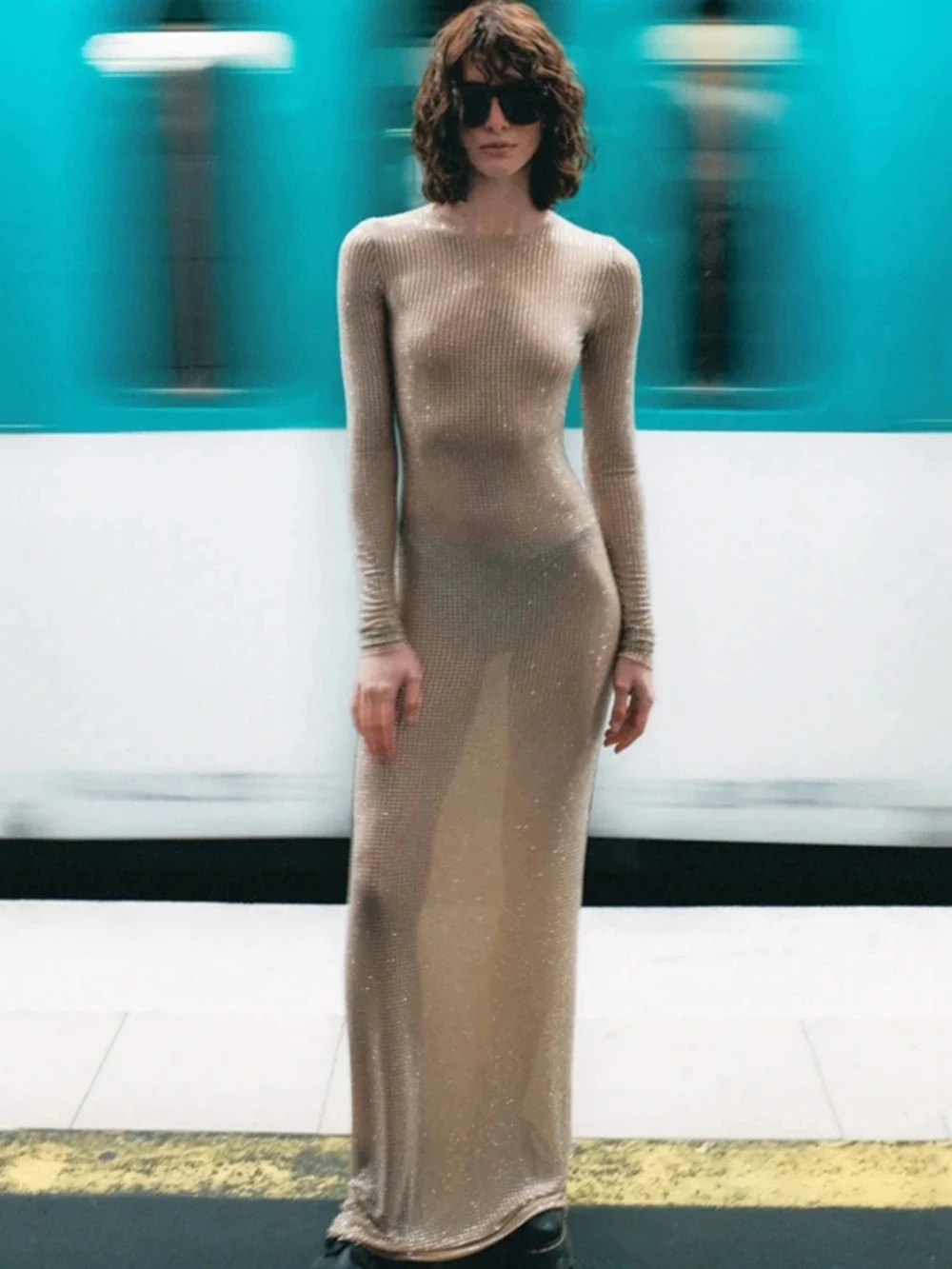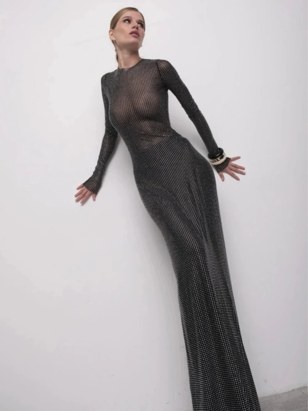 Sexy Round Neck Sparkling Rhinestone Mesh See Through Long Dress Slim Fit And Hip Hugging Dress Club Evening Gowns