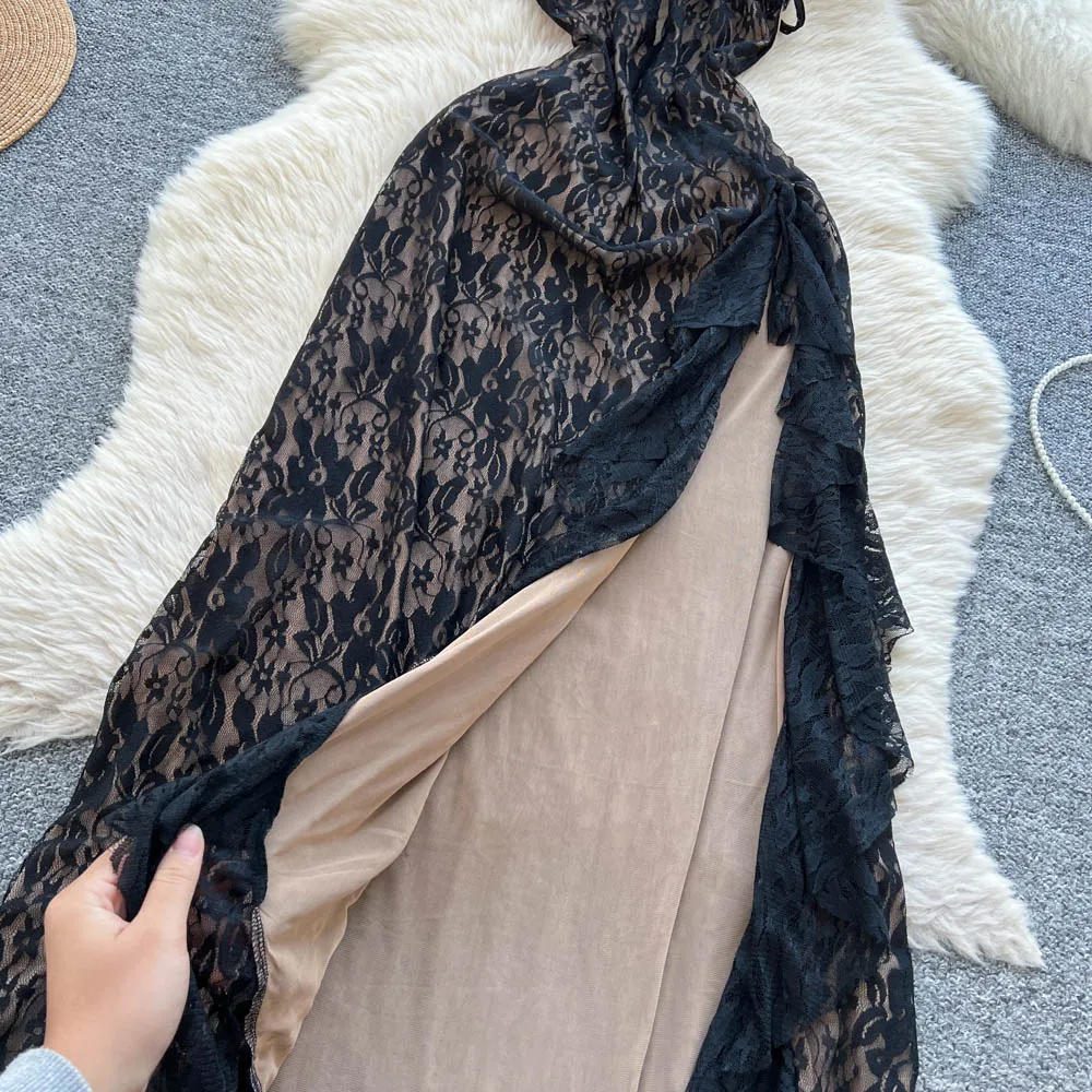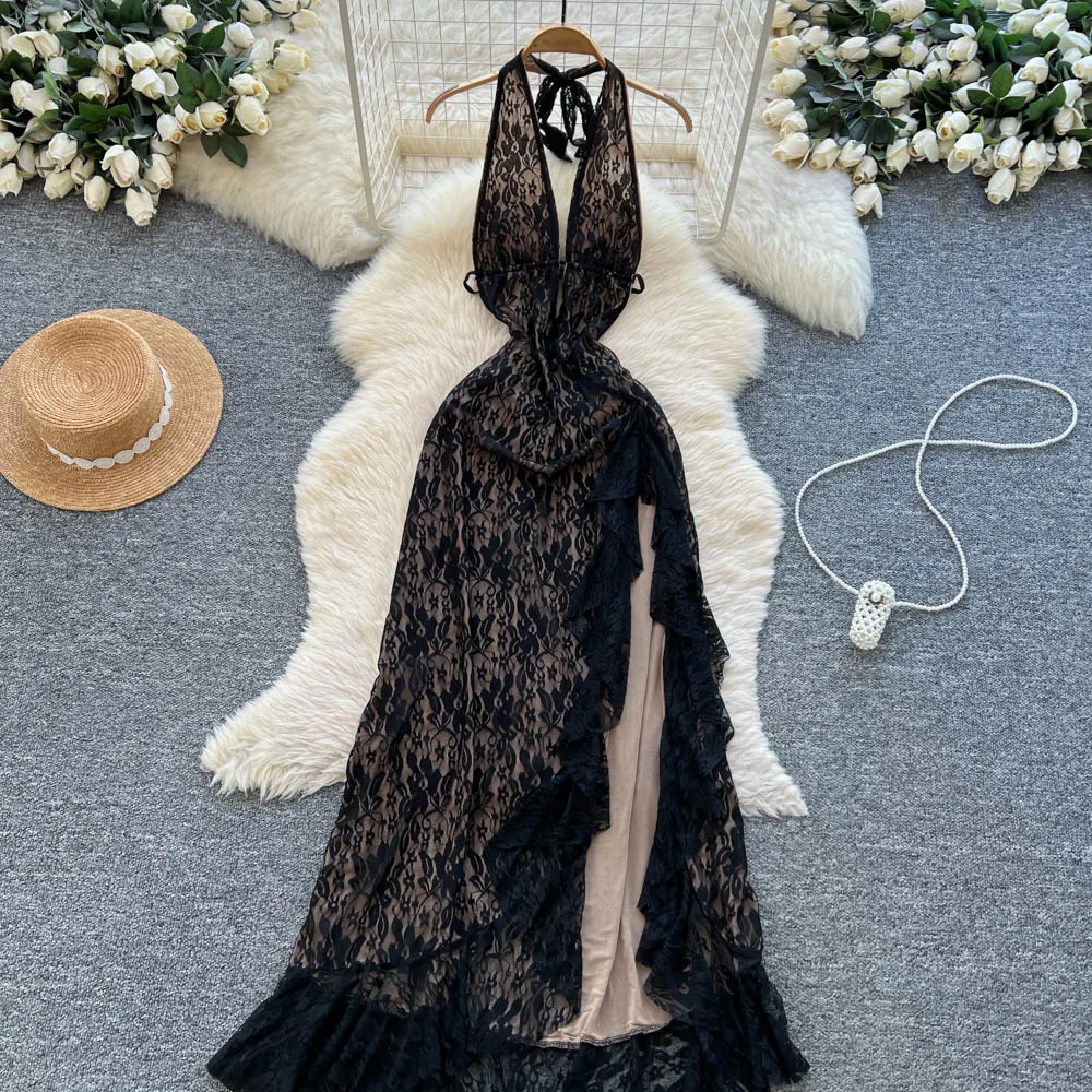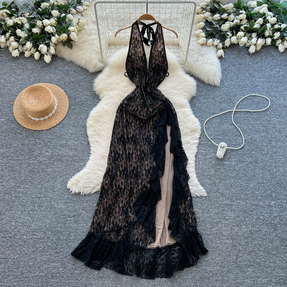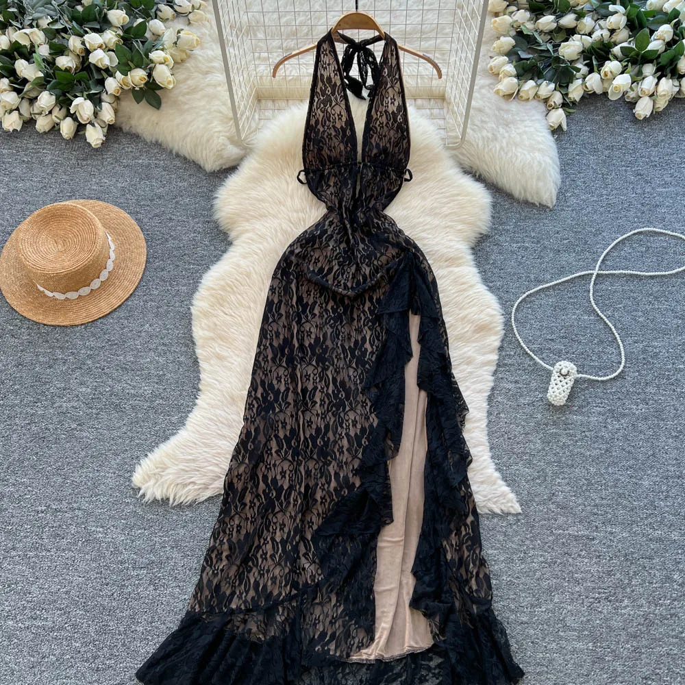 SINGREINY Sexy Lace High Slit Dress Ladies Trendy Sensual Deep V Neck Ruffles Lace Up Halter Backless Luxury Party Maxi Dresses