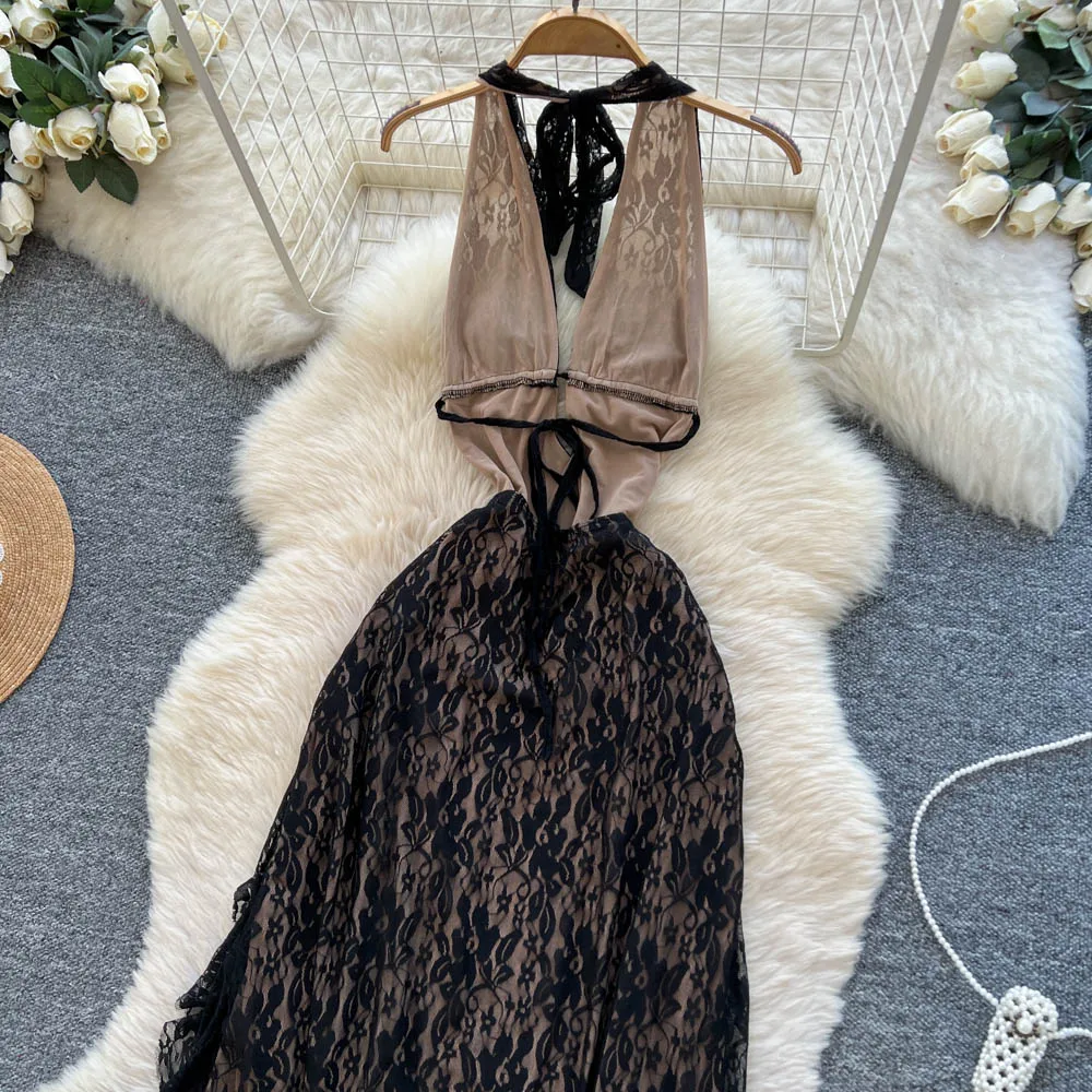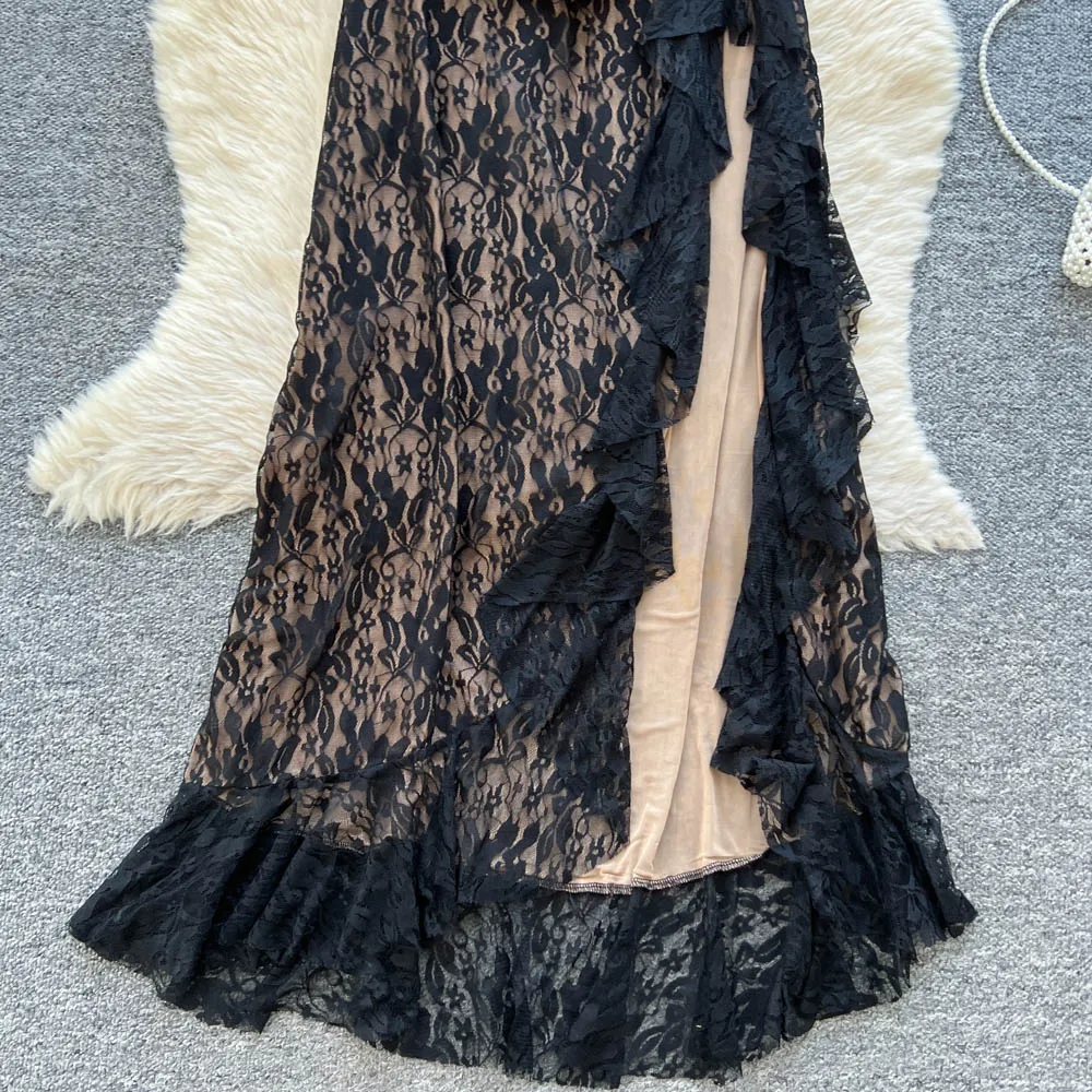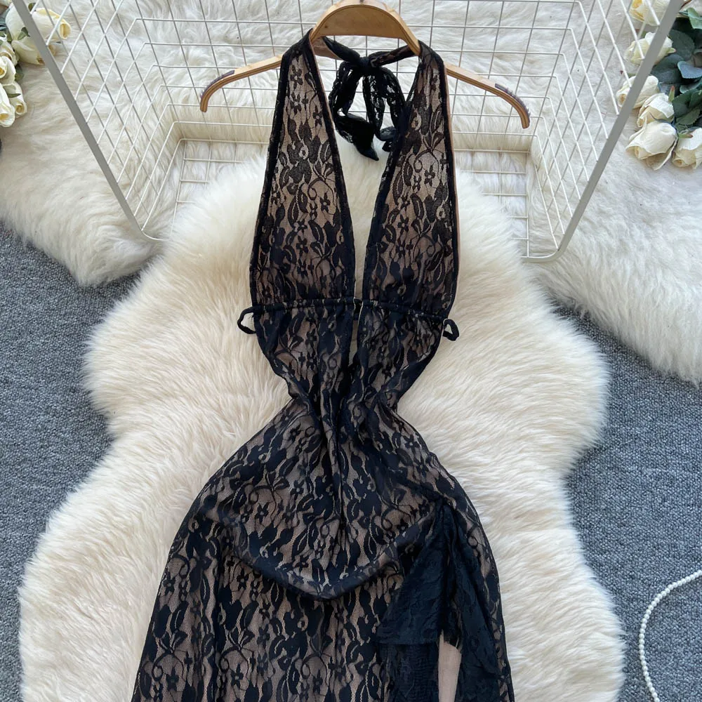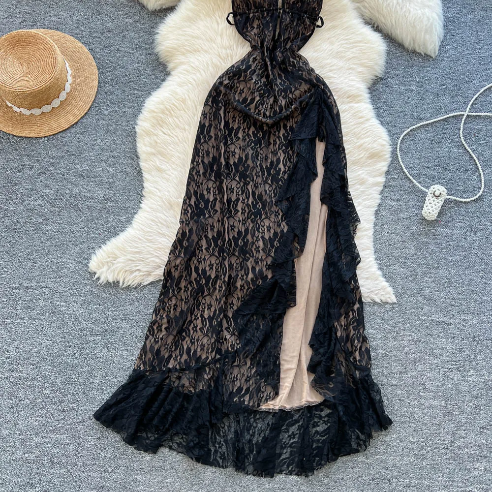 SINGREINY Sexy Lace High Slit Dress Ladies Trendy Sensual Deep V Neck Ruffles Lace Up Halter Backless Luxury Party Maxi Dresses