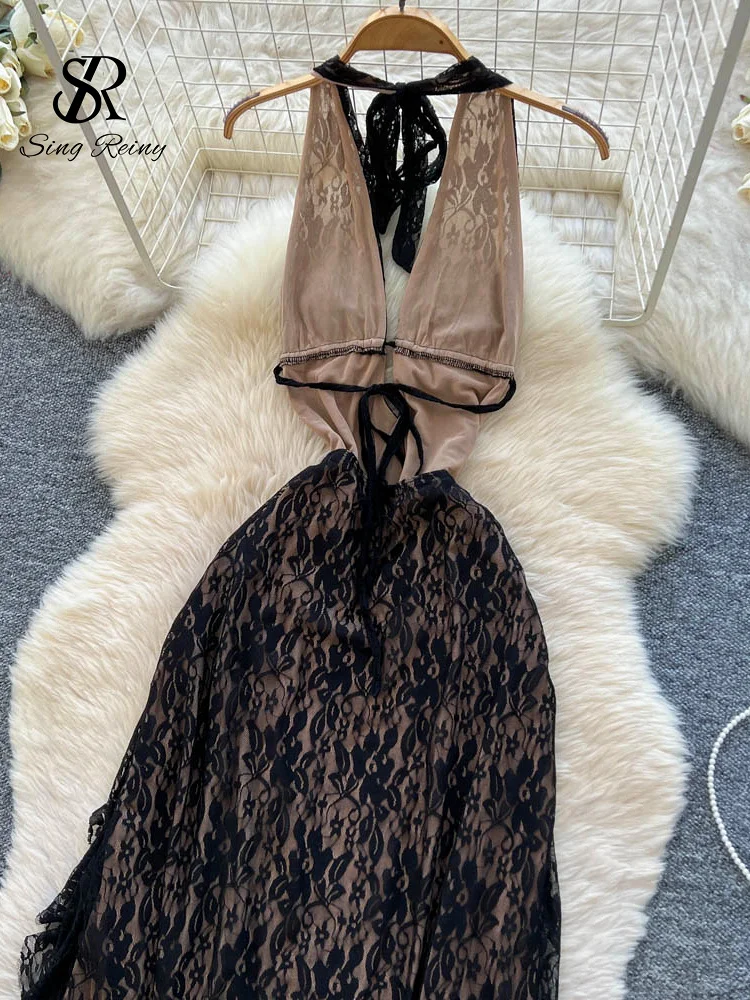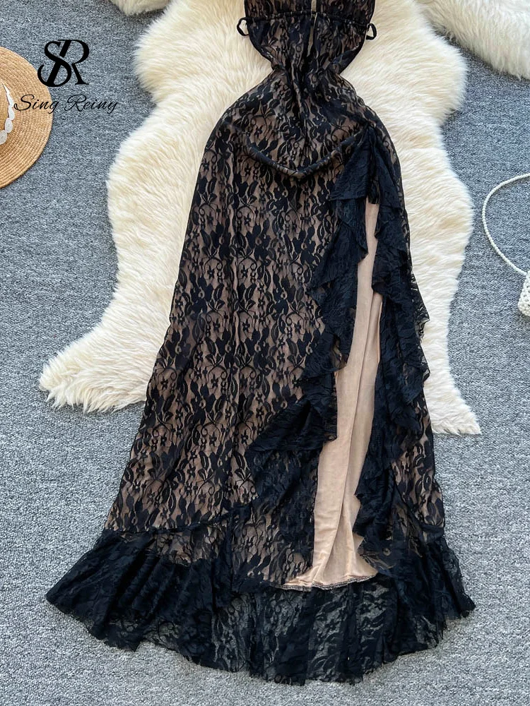 SINGREINY Sexy Lace High Slit Dress Ladies Trendy Sensual Deep V Neck Ruffles Lace Up Halter Backless Luxury Party Maxi Dresses