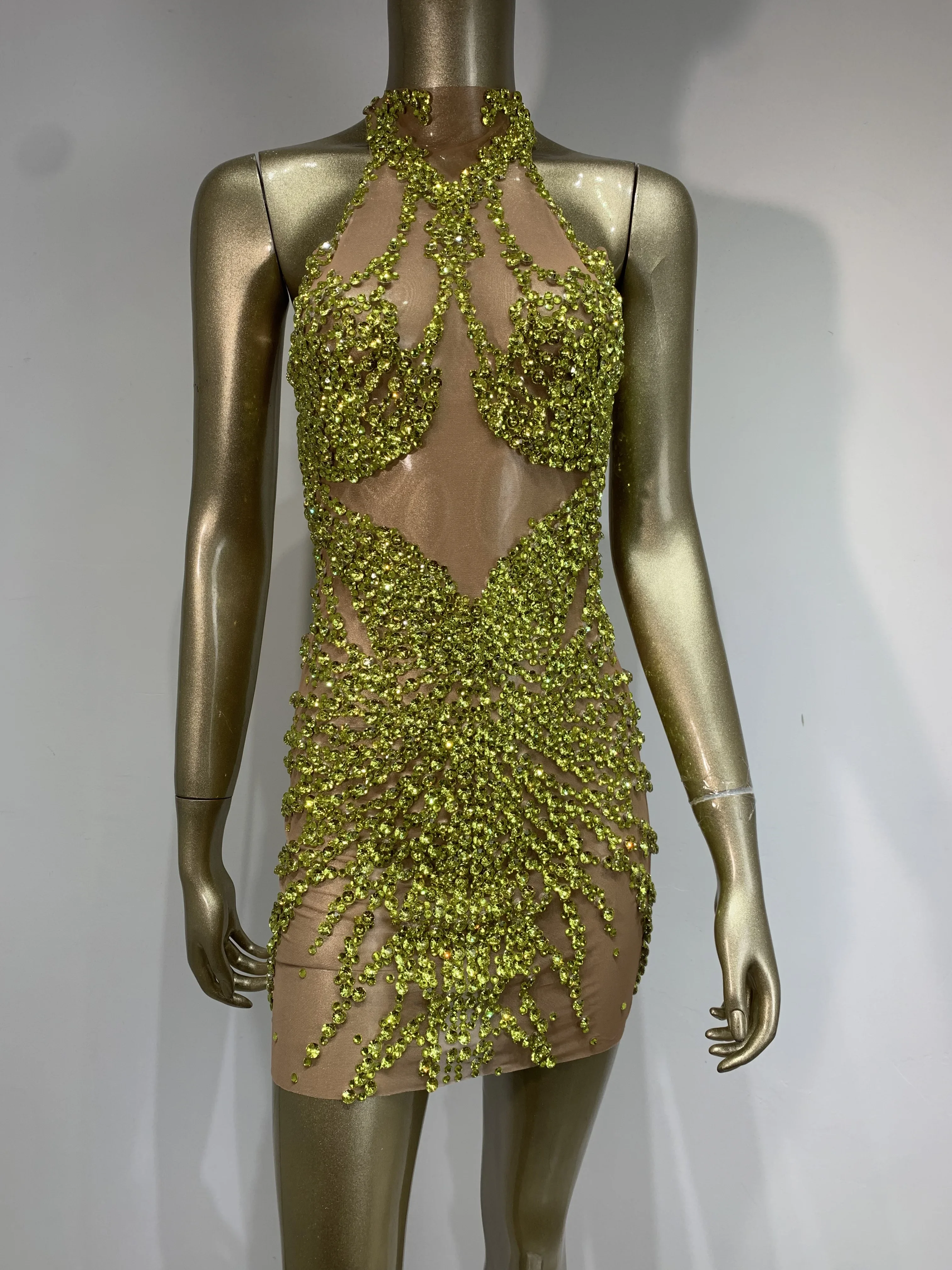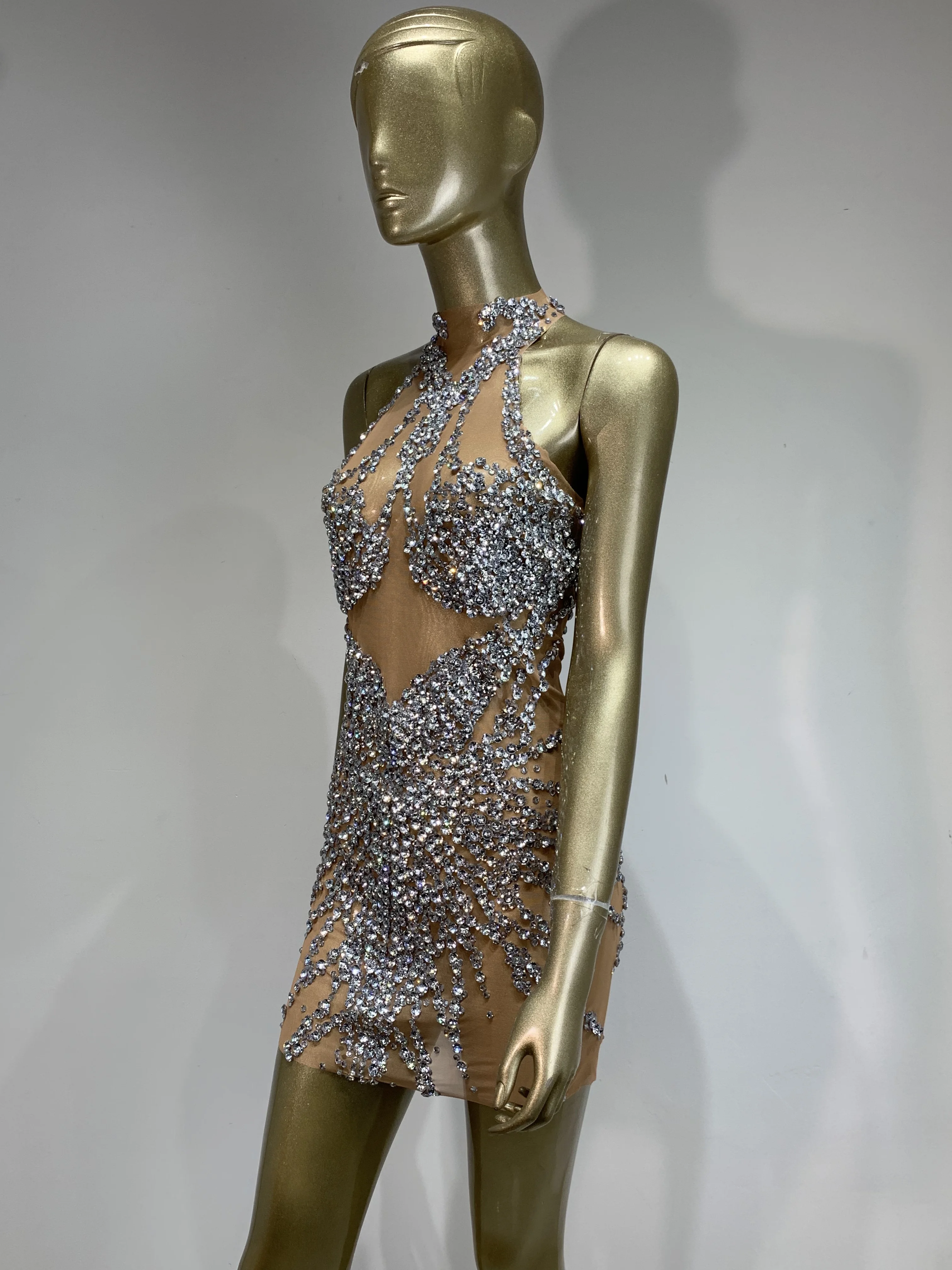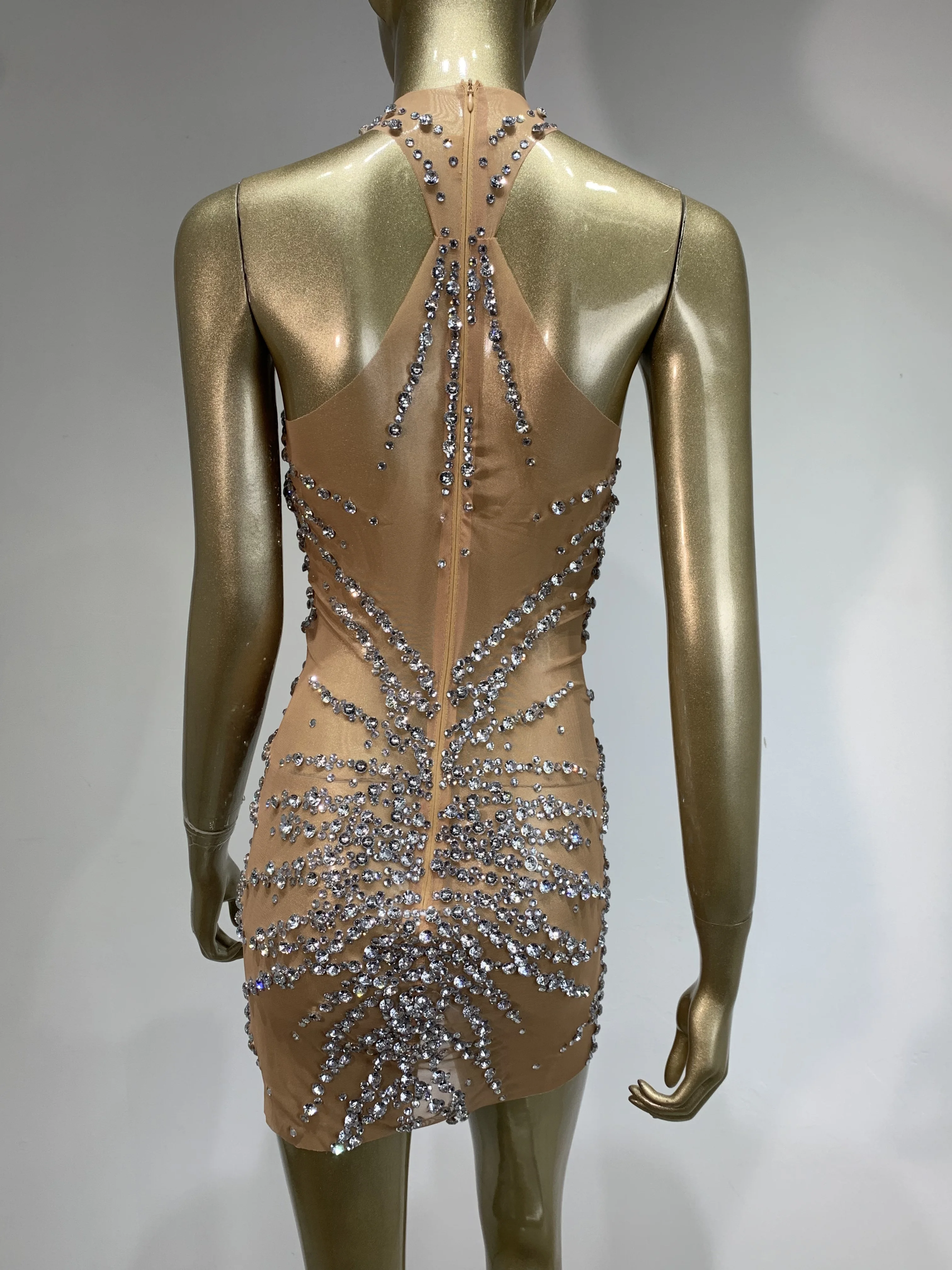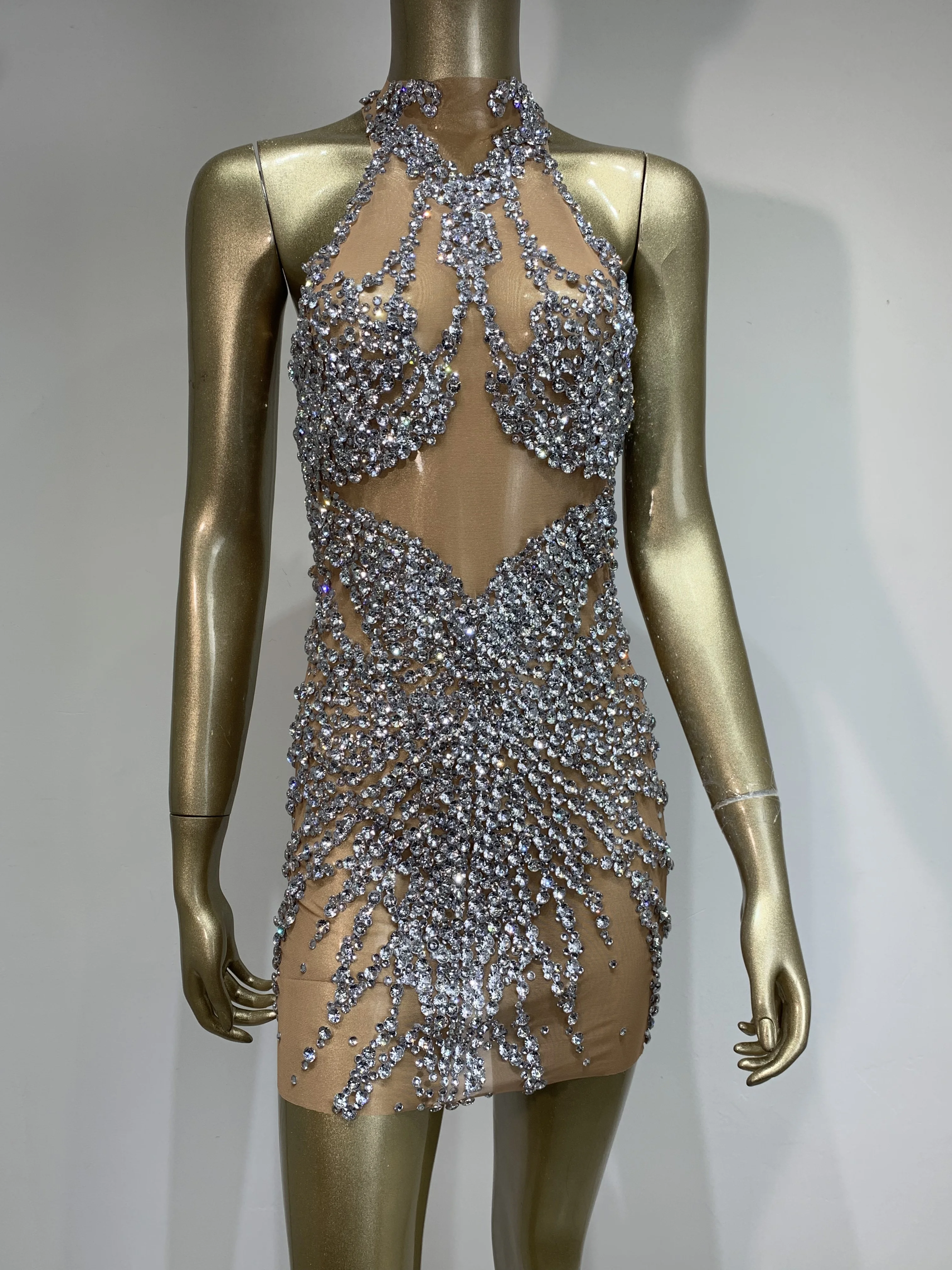 Sparkly Rhinestone Mini Dress Sexy Sleeveless Mesh See Through Evening Party Dresses Celebrate Birthday Stage Performa Costume