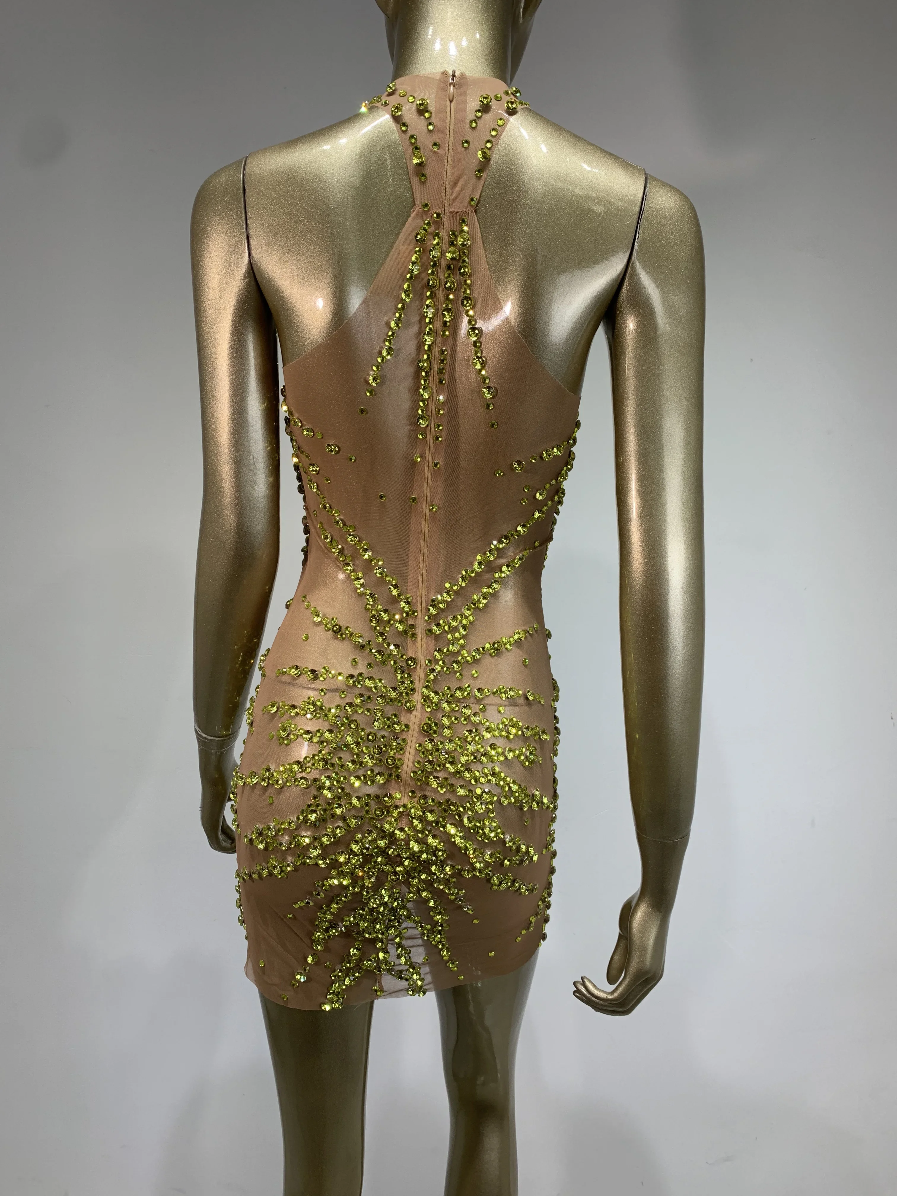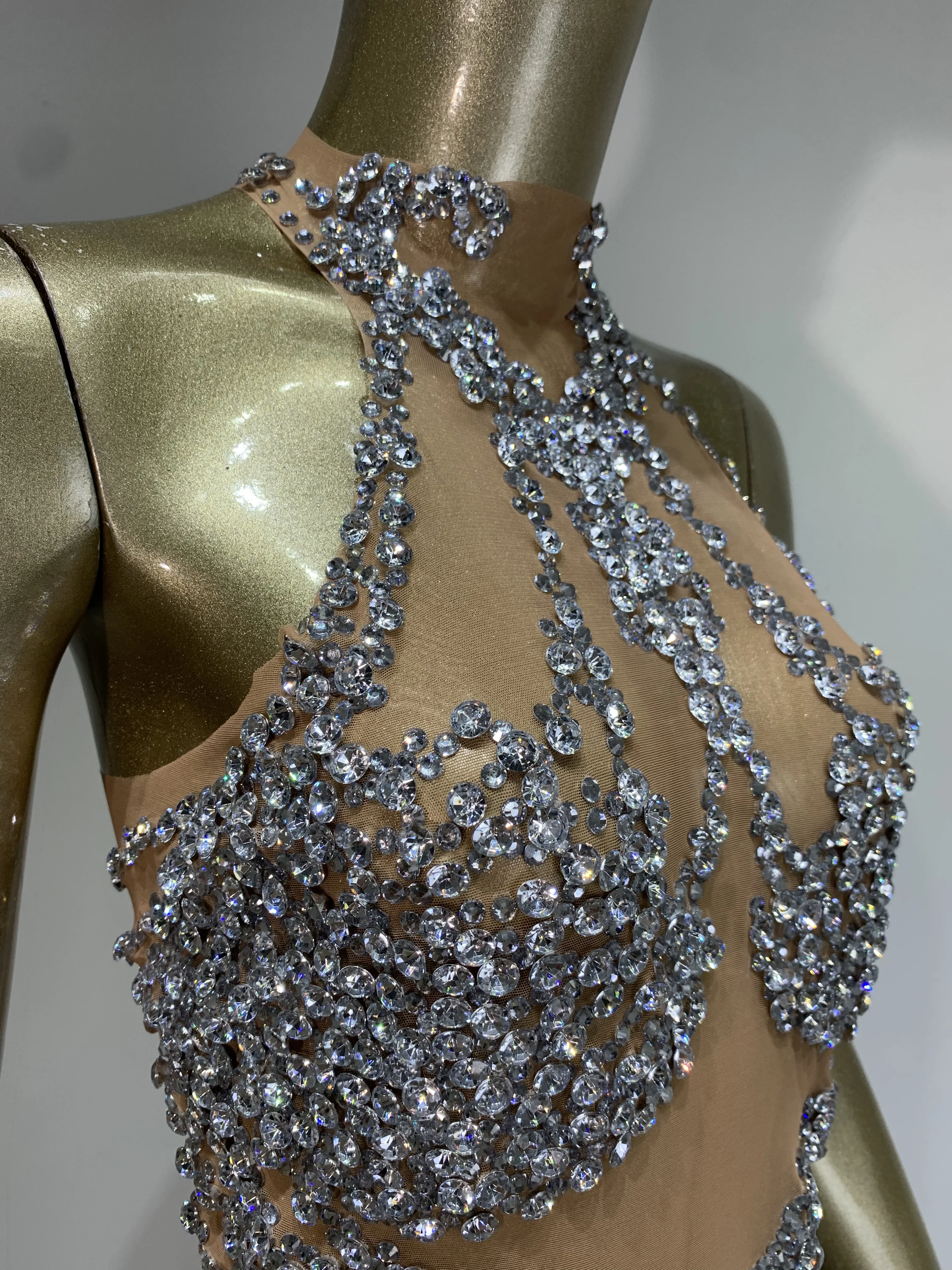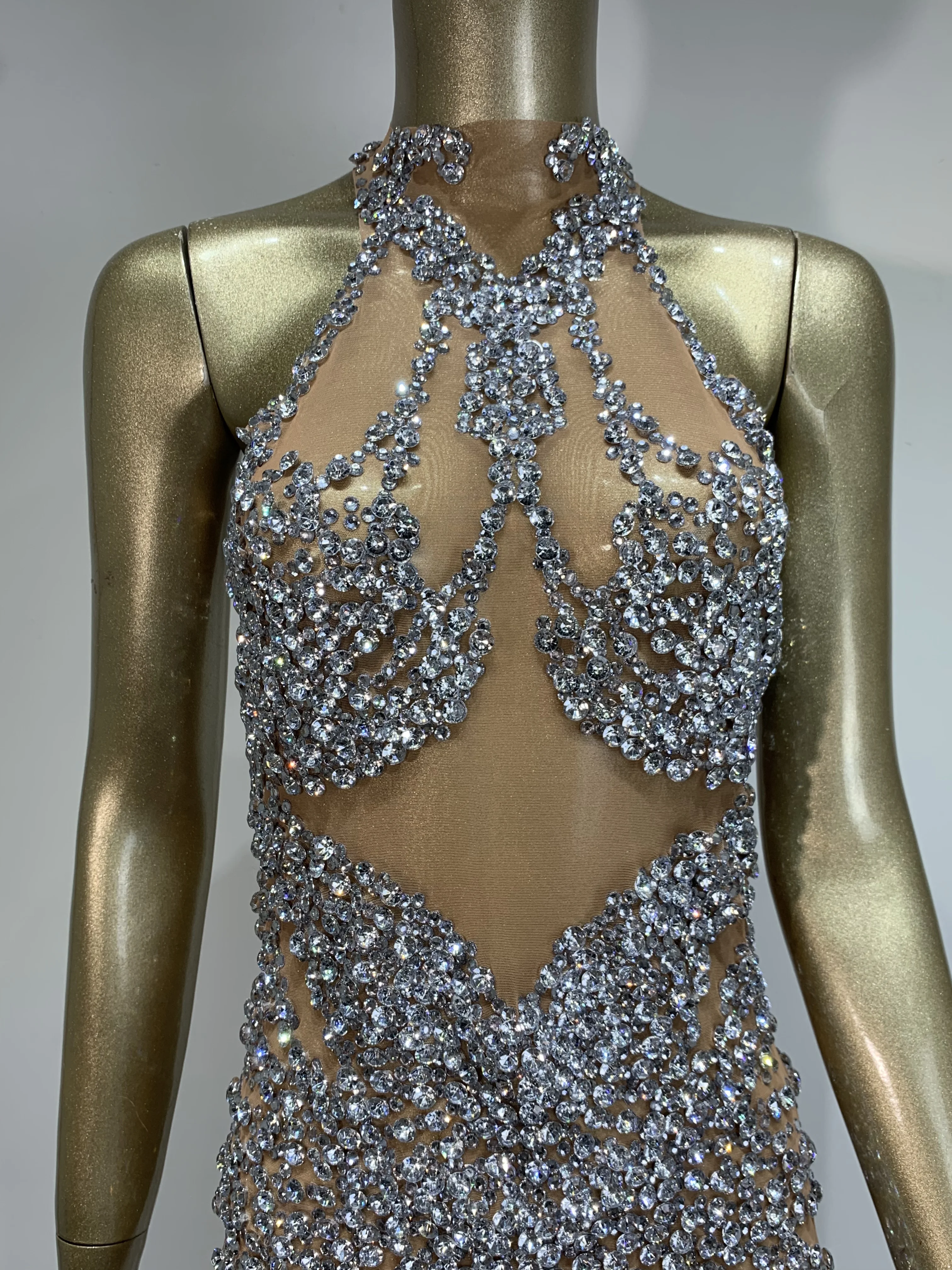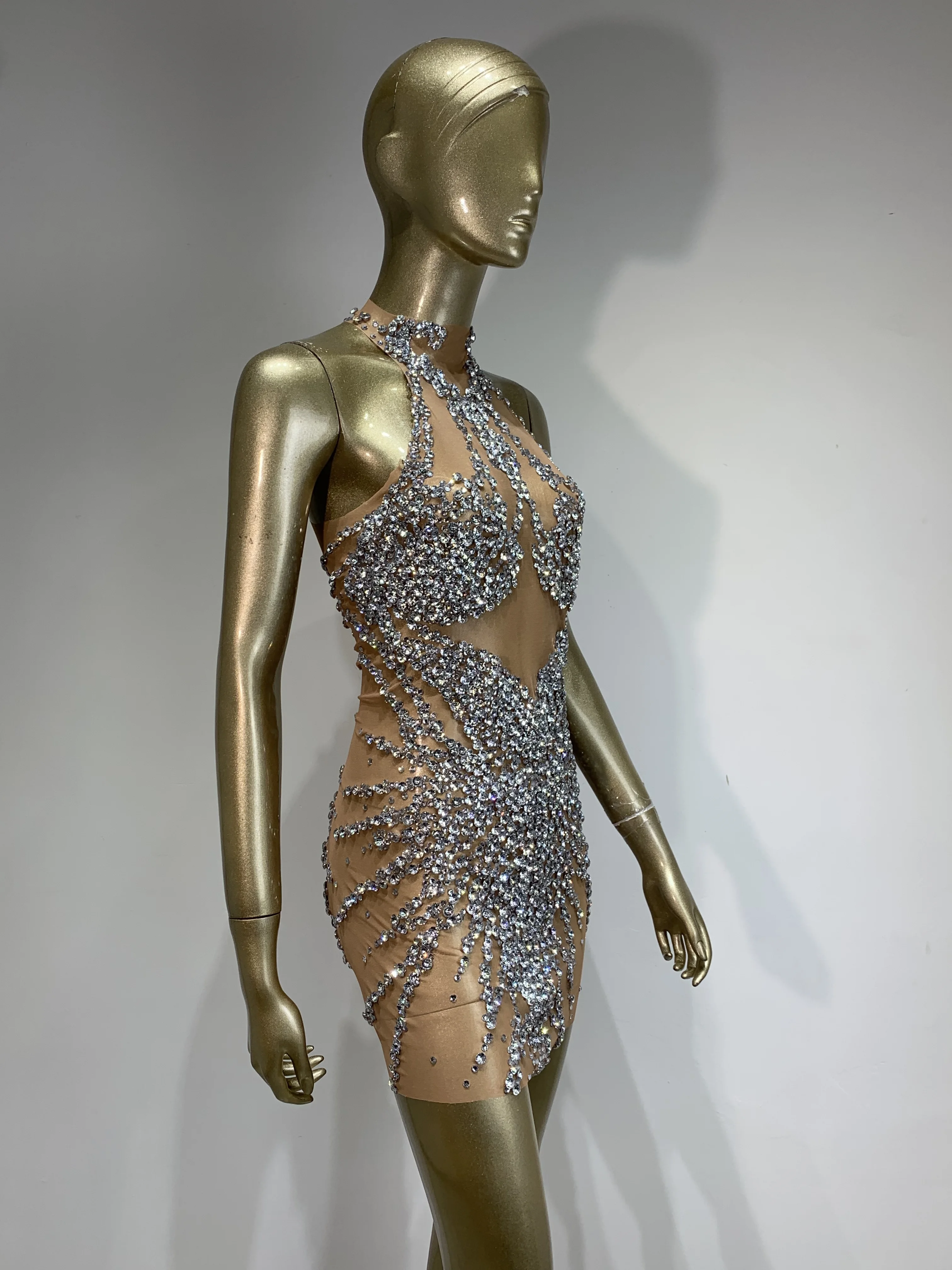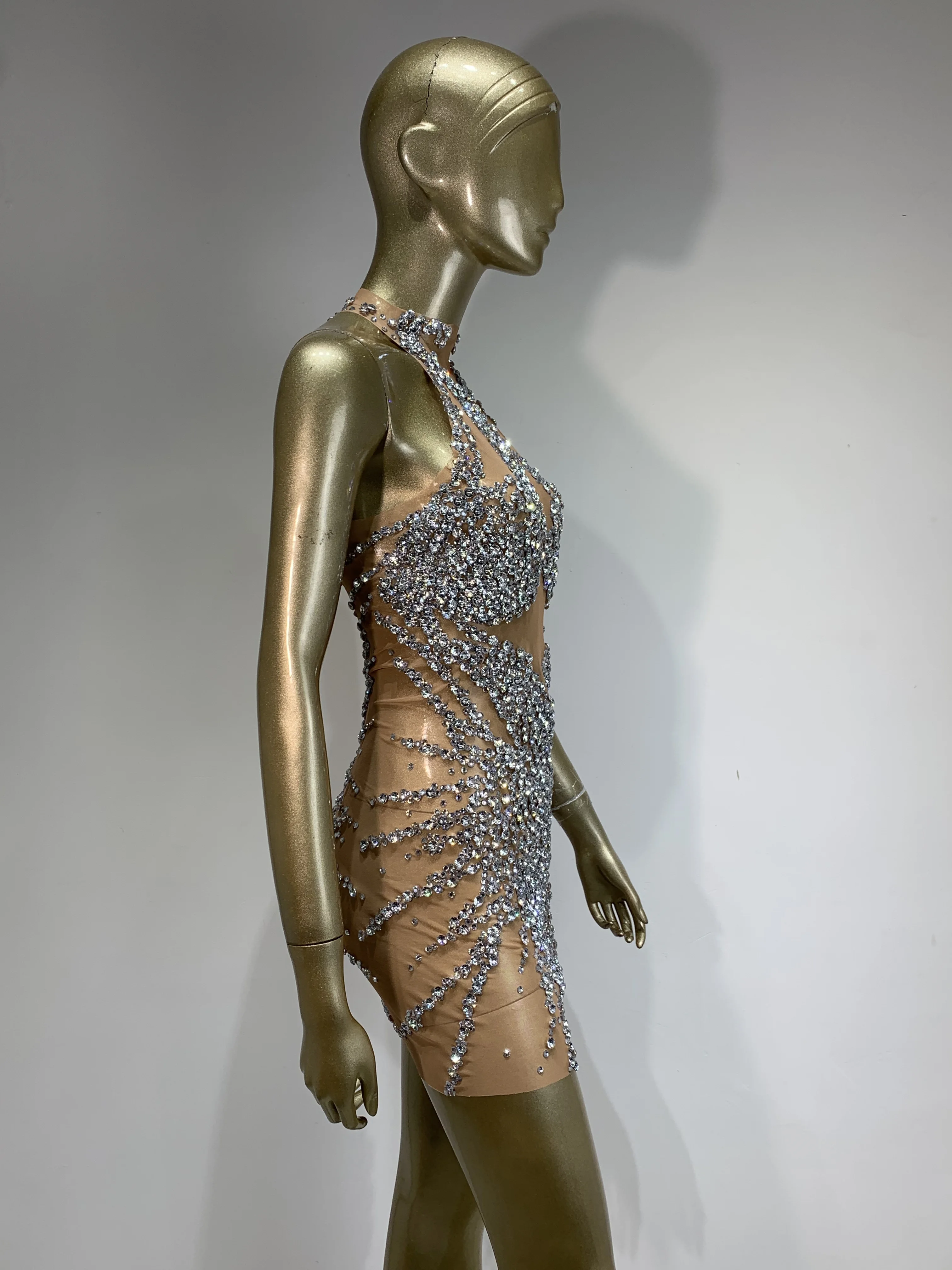 Sparkly Rhinestone Mini Dress Sexy Sleeveless Mesh See Through Evening Party Dresses Celebrate Birthday Stage Performa Costume