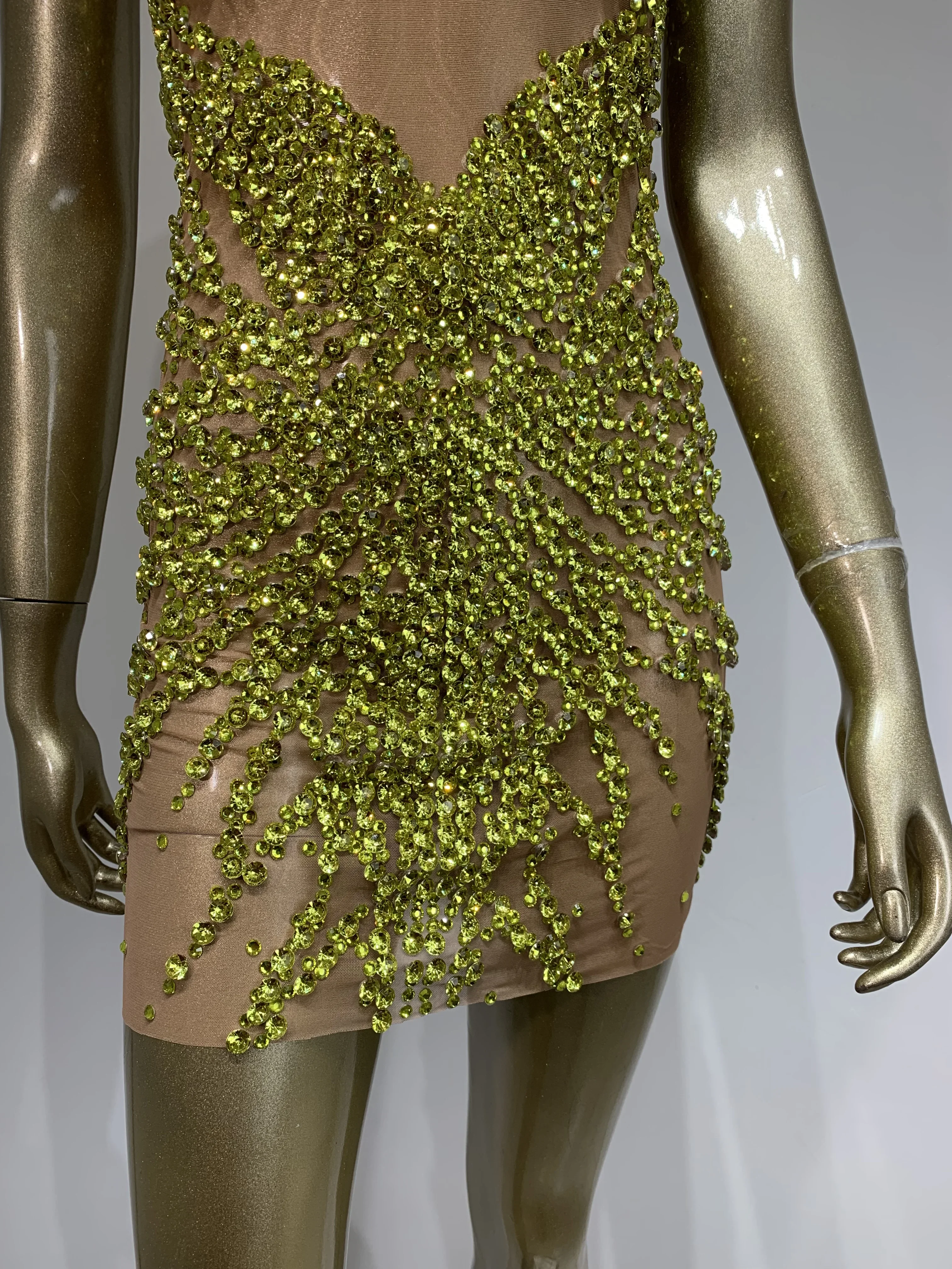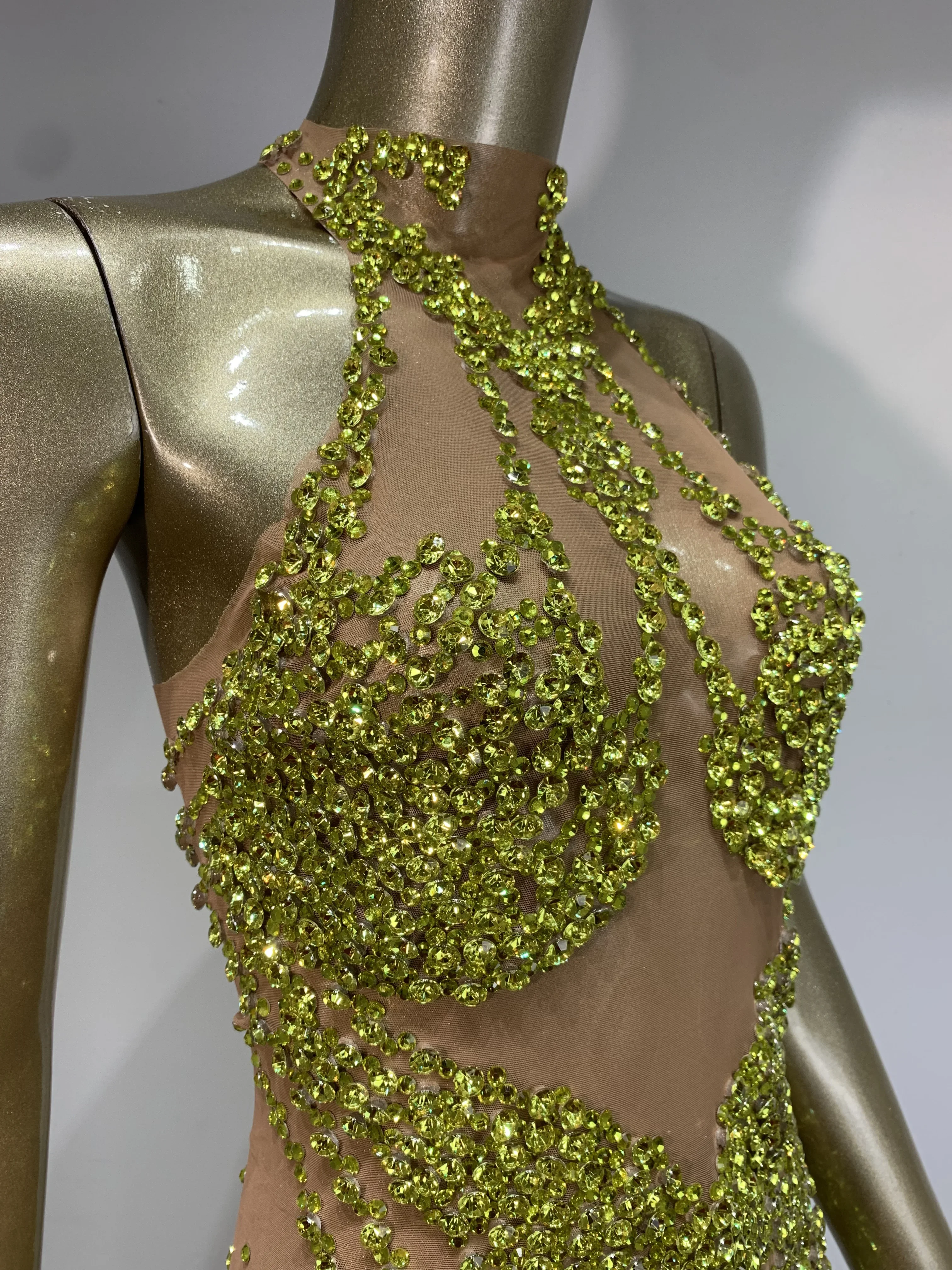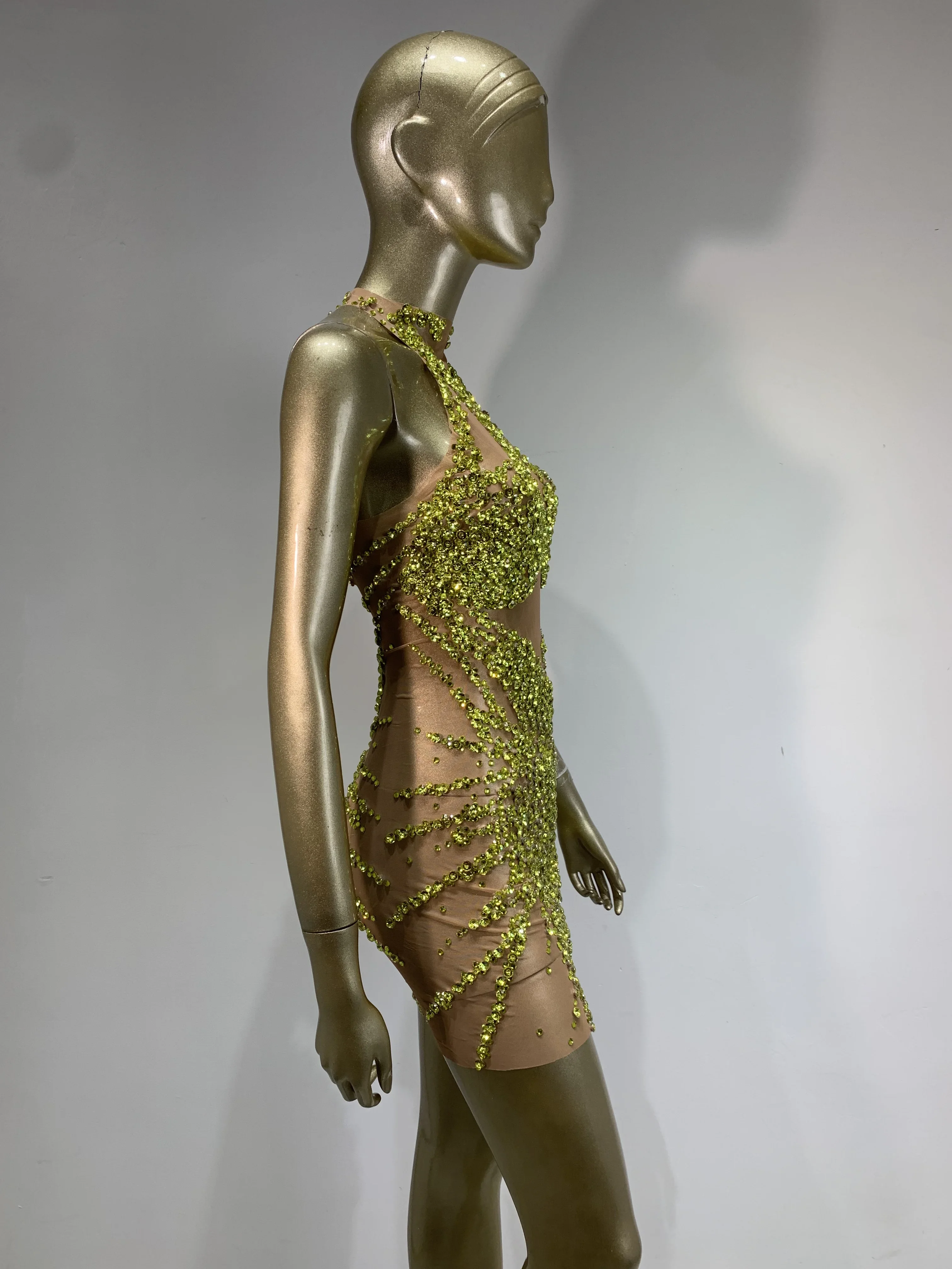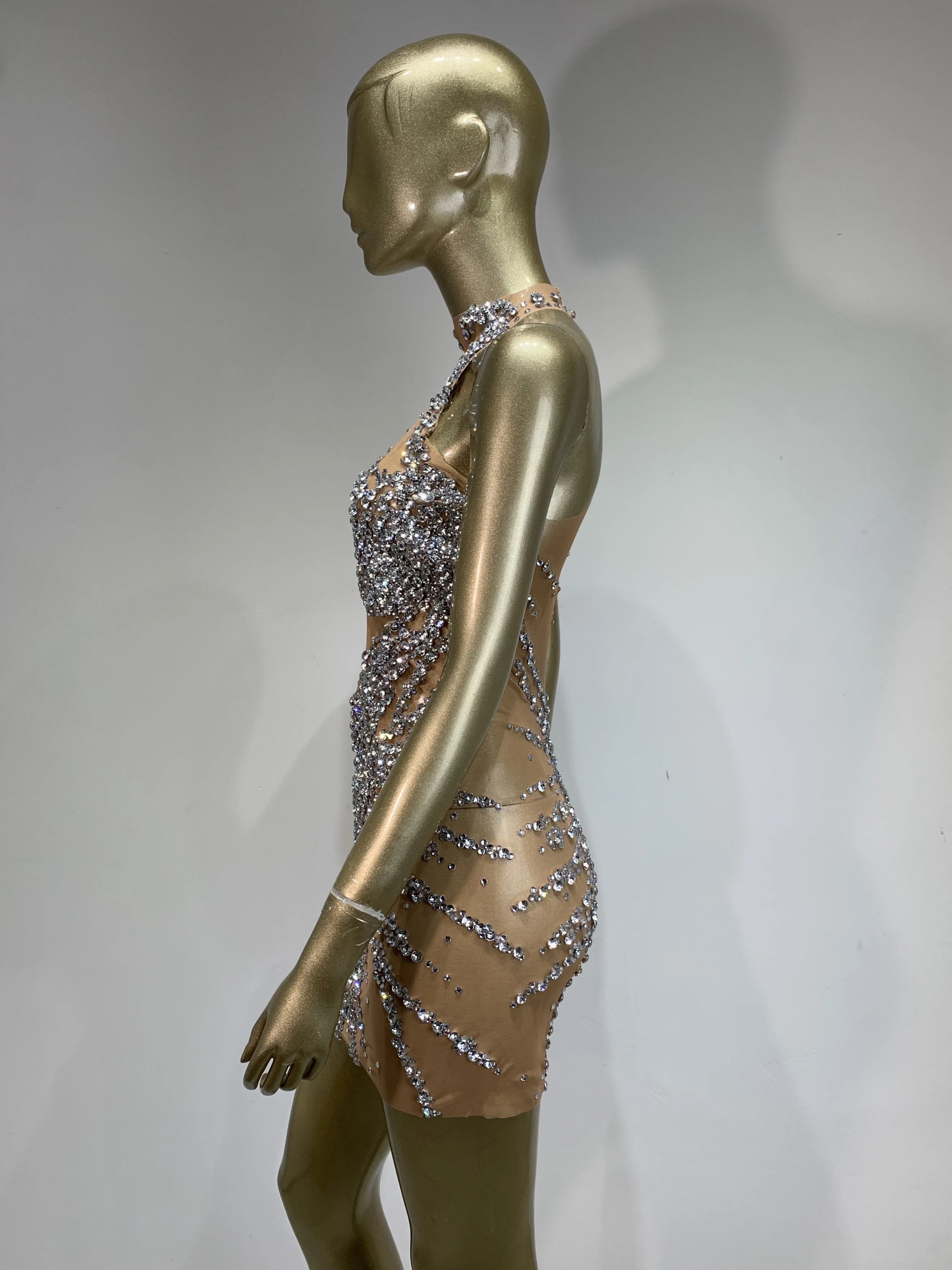 Sparkly Rhinestone Mini Dress Sexy Sleeveless Mesh See Through Evening Party Dresses Celebrate Birthday Stage Performa Costume