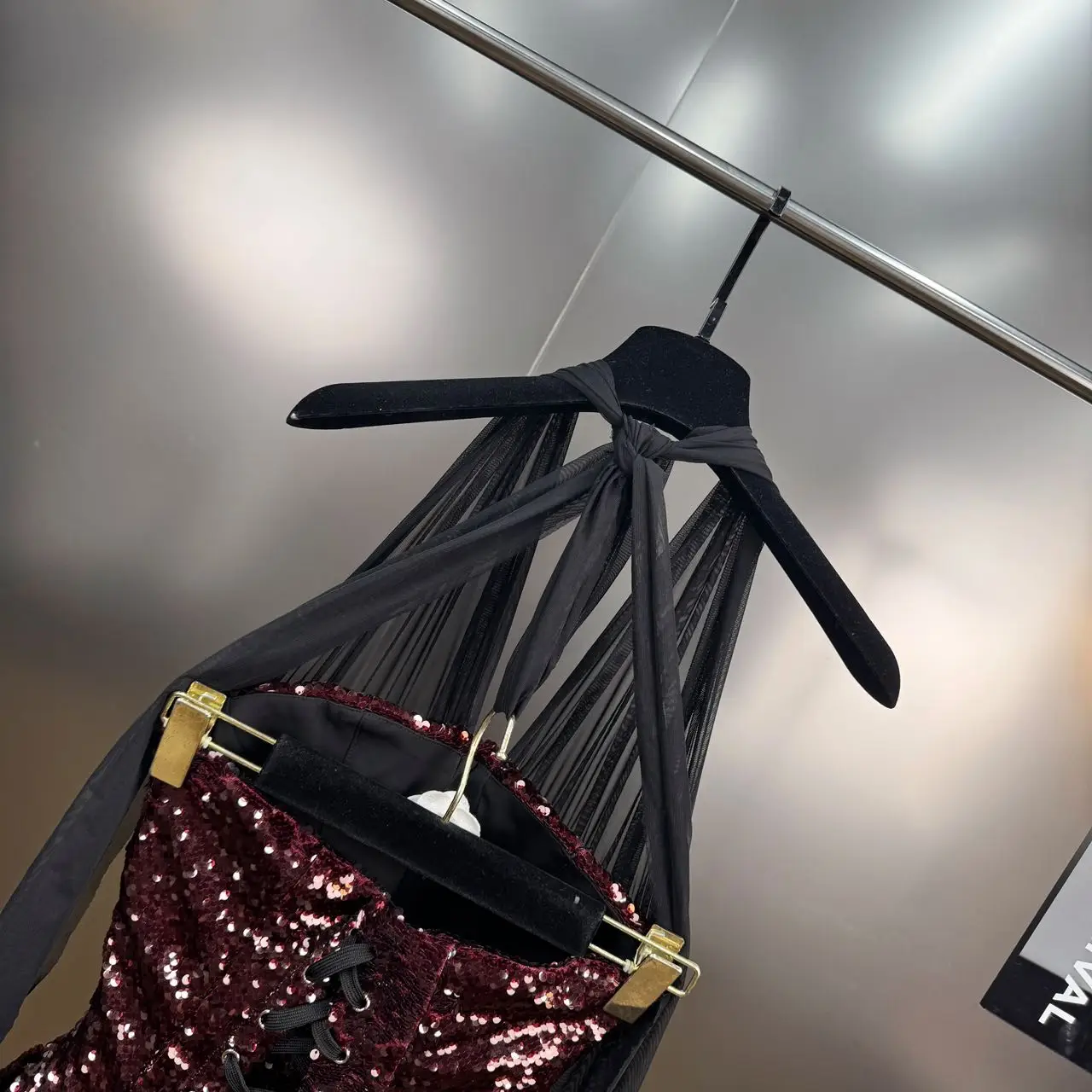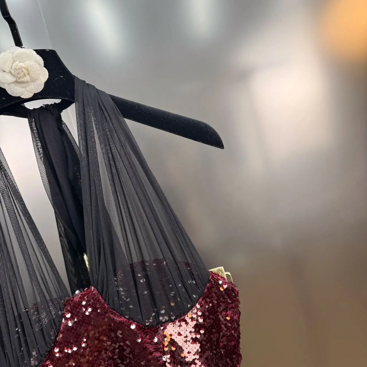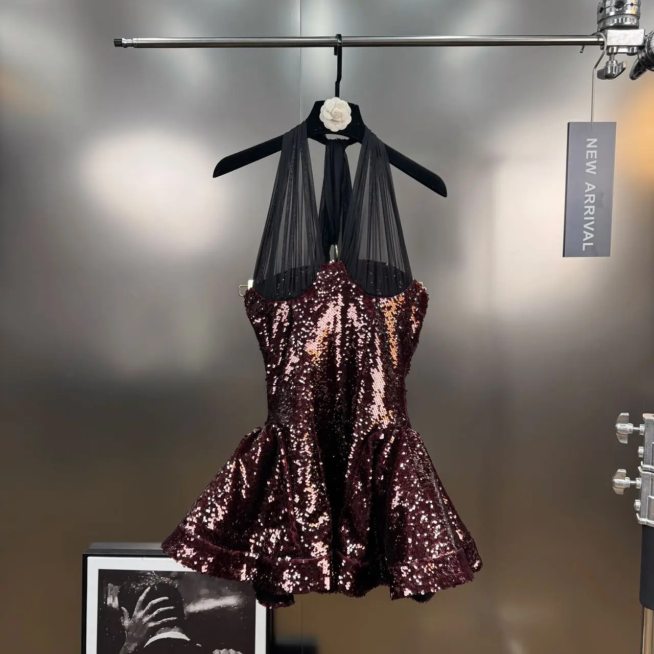 Spring and Summer 2025 New French Retro Heavy Industry Sequined Yarn Neck Slim Backless Dress Sexy Dress for Women
