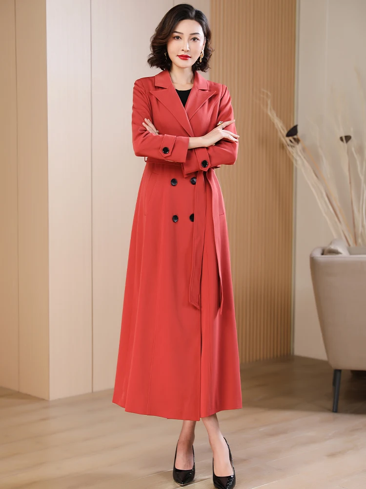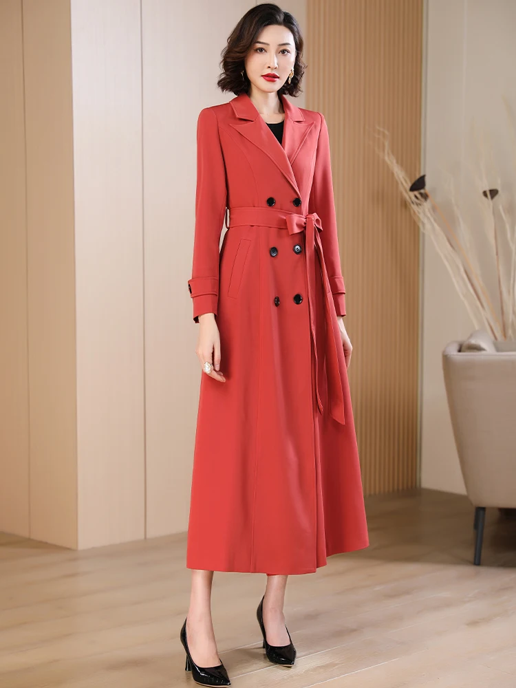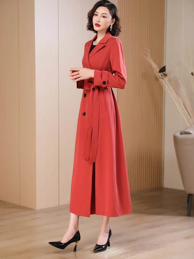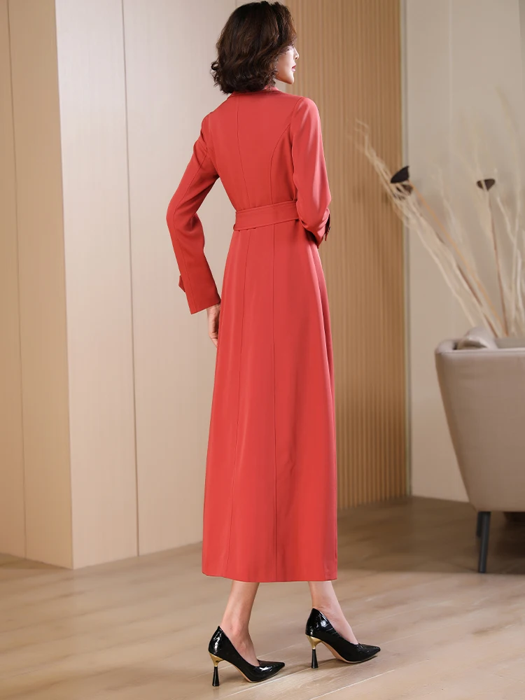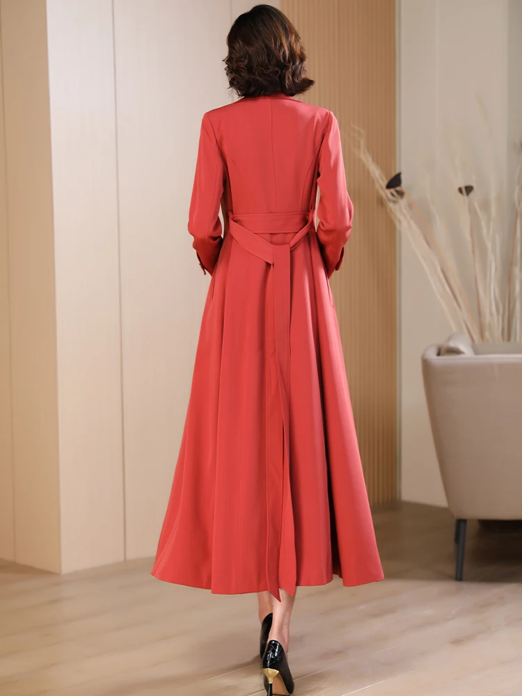 Spring Autumn New Brick Red Long Coat Women’s Suit Collar High-end Elegant Slim Fit Outerwear 2025 Fashion Trend 573