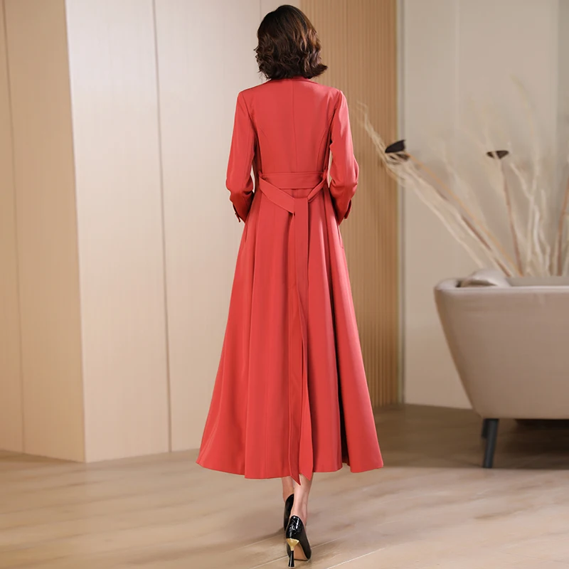 Spring Autumn New Brick Red Long Coat Women’s Suit Collar High-end Elegant Slim Fit Outerwear 2025 Fashion Trend 573