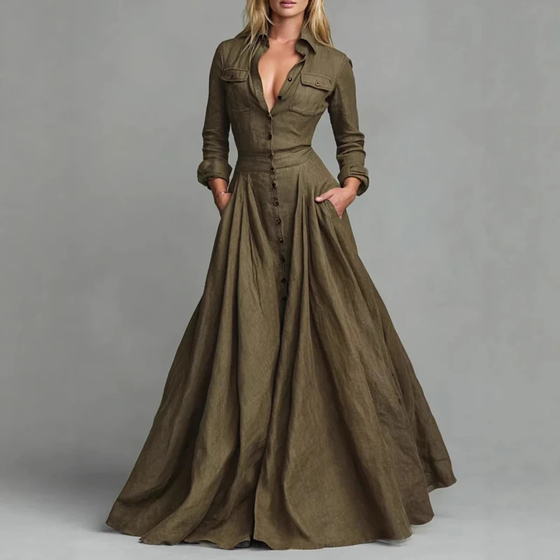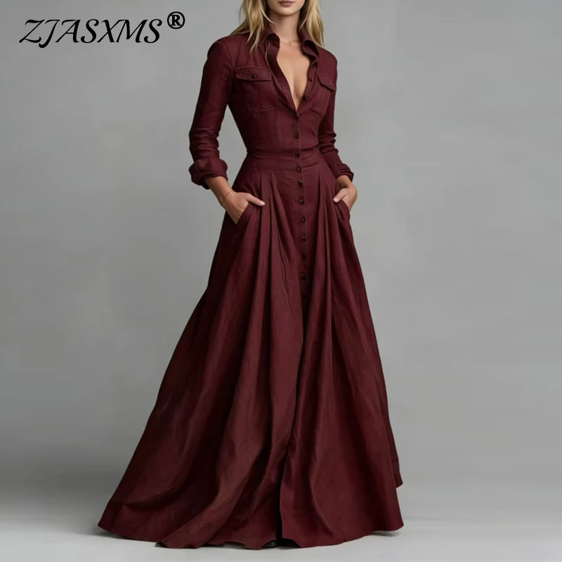 Spring Fashion Shirt Collar Button Long Dresses Woman Elegant High Waist Pocket Party Dress Autumn Long Sleeve Loose Swing Dress