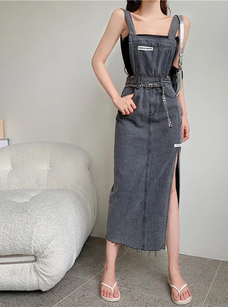 Summer Label Suspender Long Skirt Retro Ripped Denim Skirt Spaghetti Strap Sexy Split Blue Skirt Women Sundress Streetwear KS688