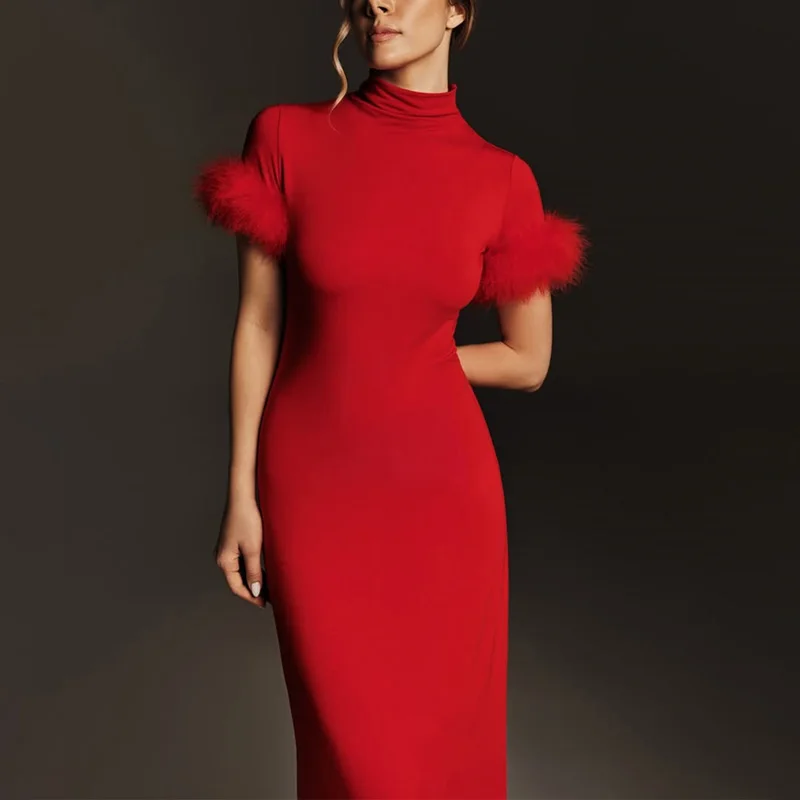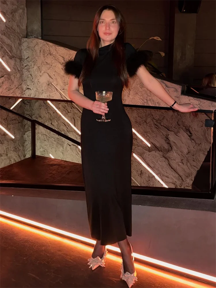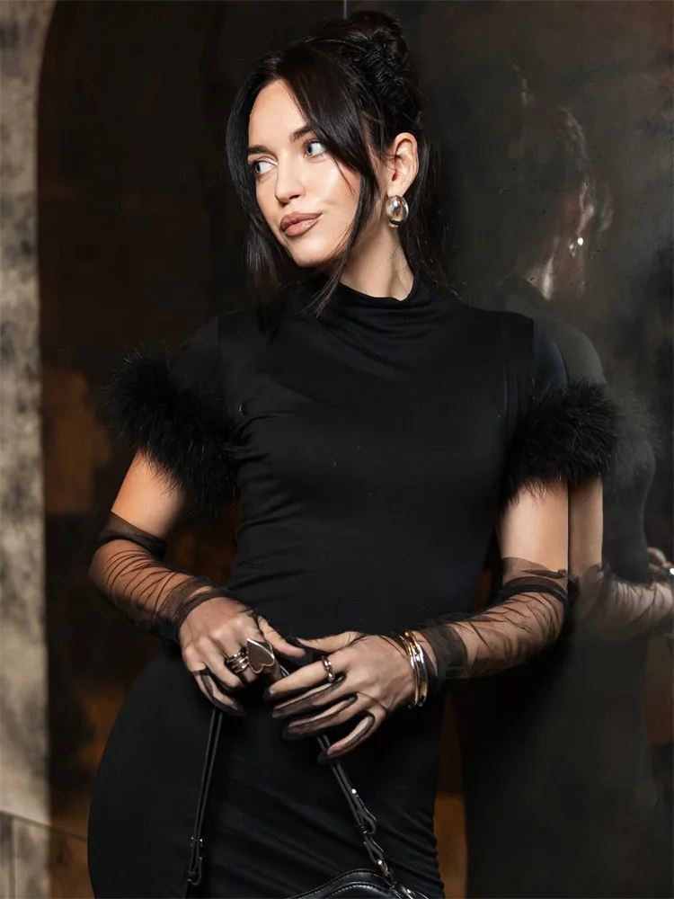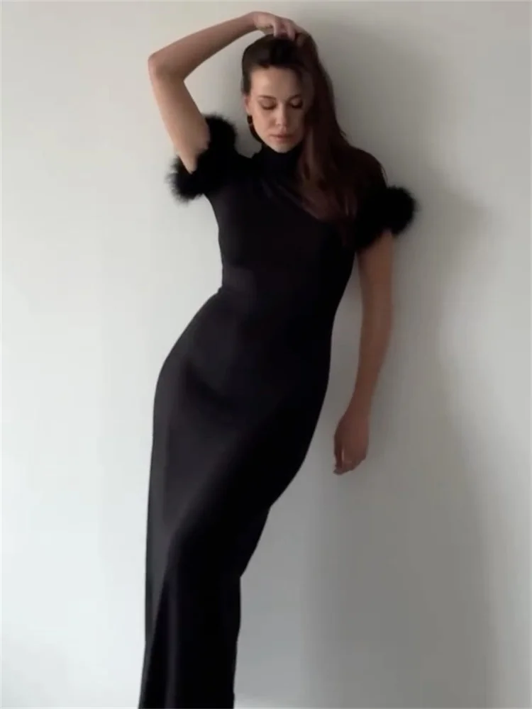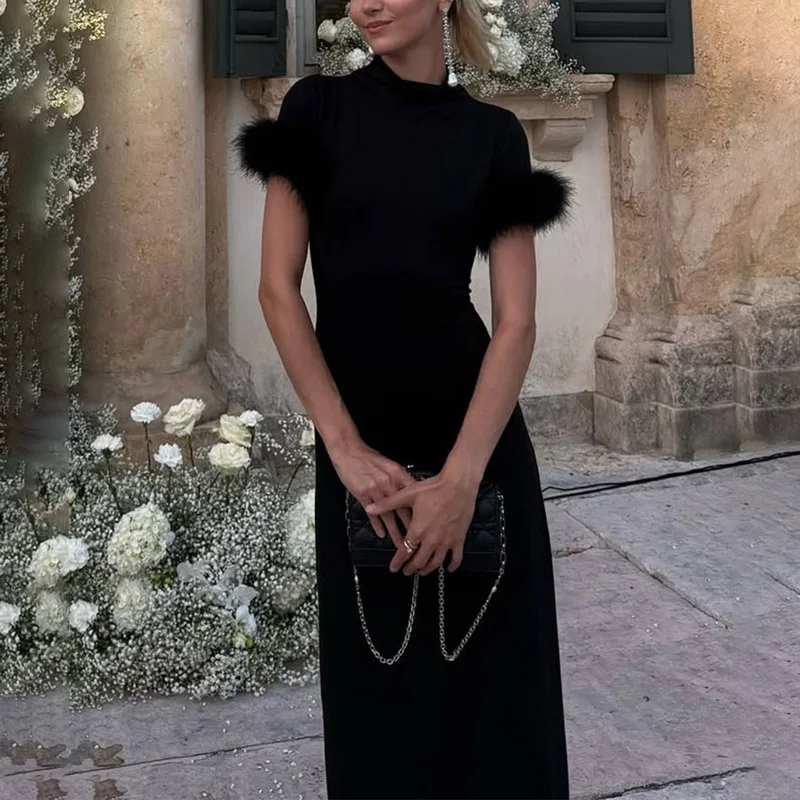 Tossy Black Fashion Fluffy Long Dress Female Short Sleeve Elegant High Waist Patchwork Slim Party Dress Women Spring Maxi Dress