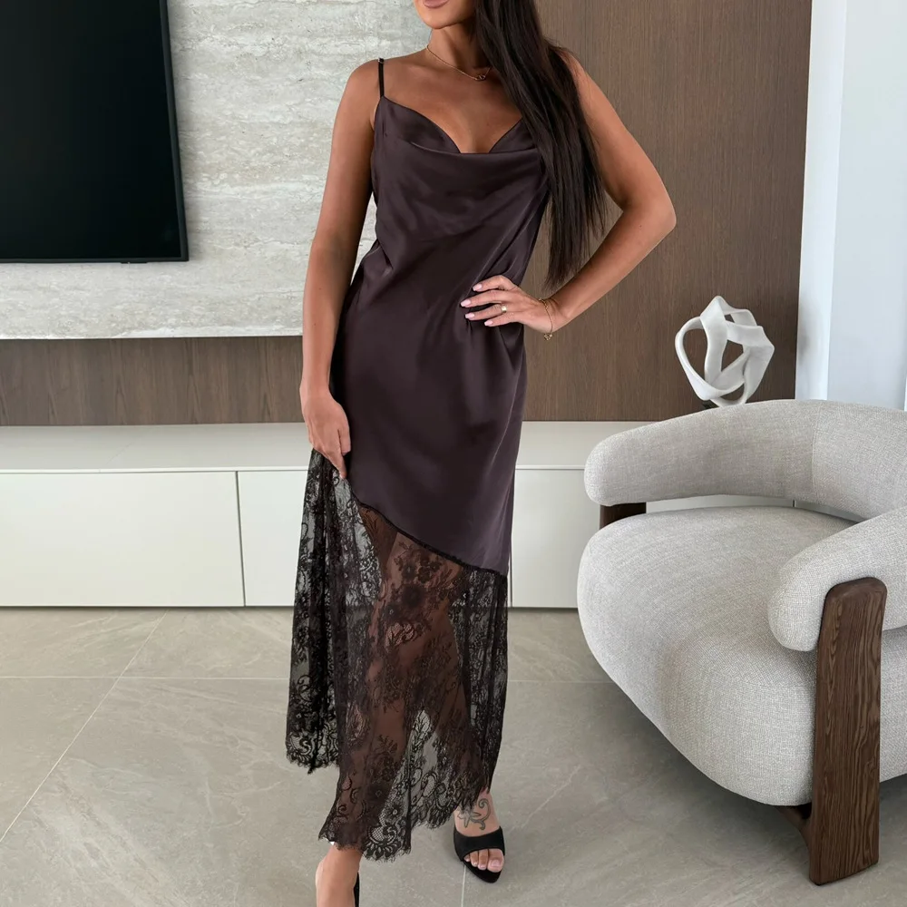 Tuularose Fashion Lace Long Dress Women’s New Sexy V-Neck Lace Satin Patchwork Halter Dress Elegant Luxury Vintage Party Dresses