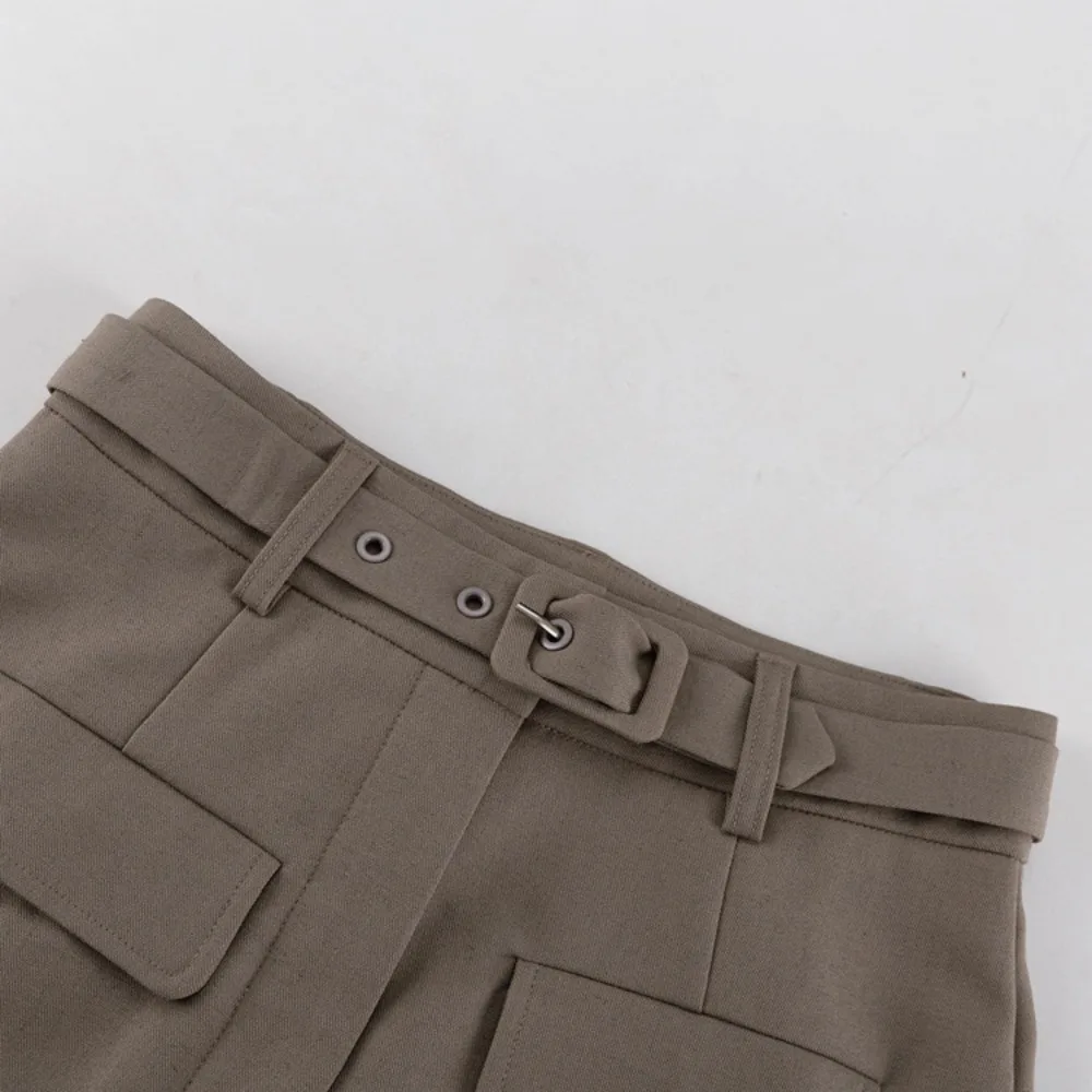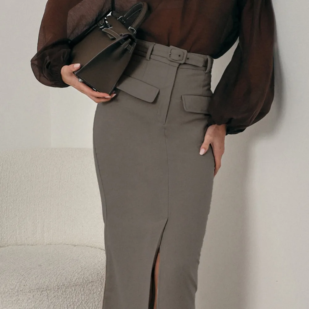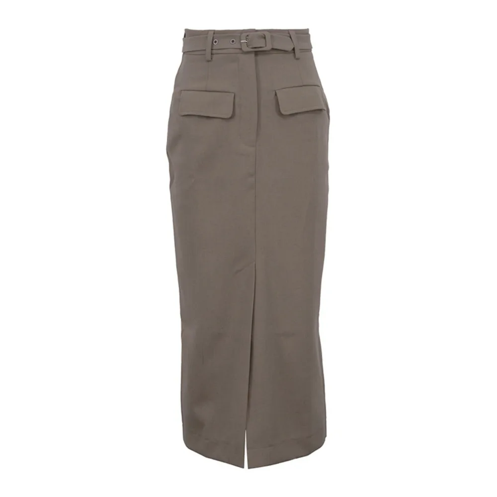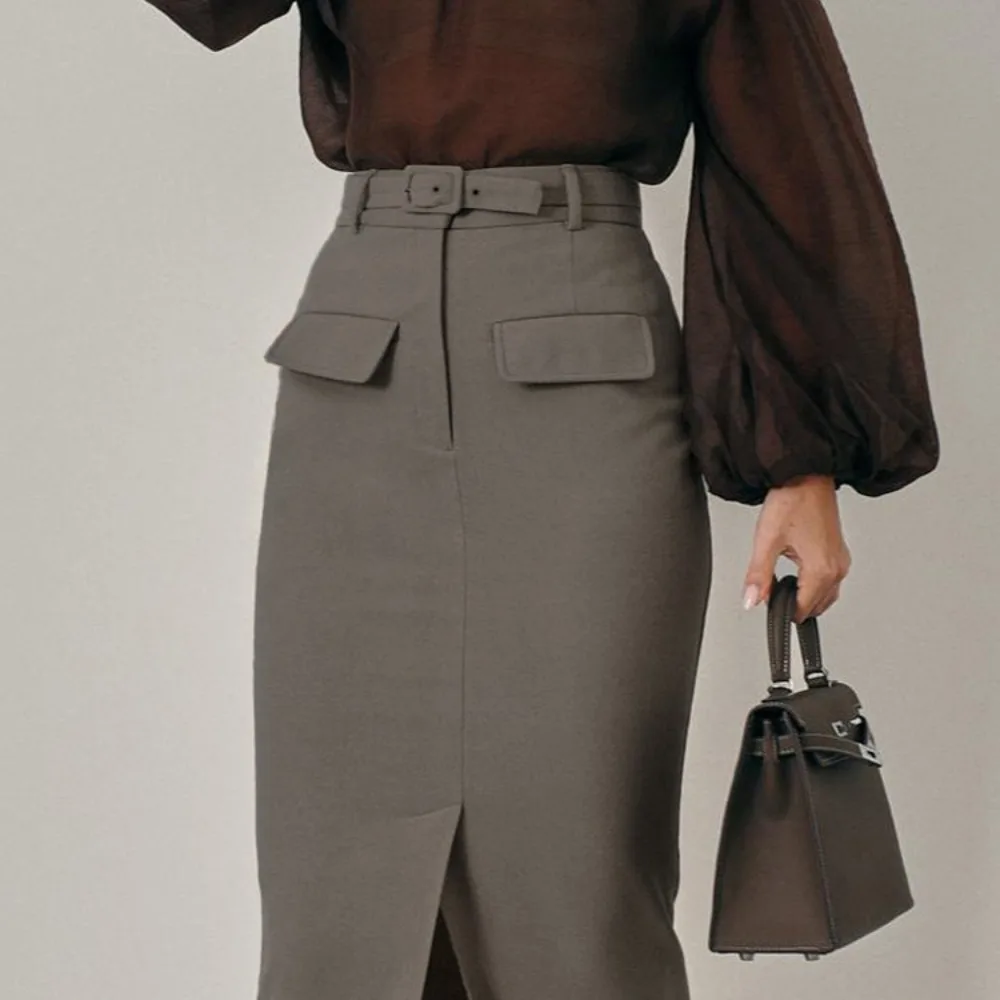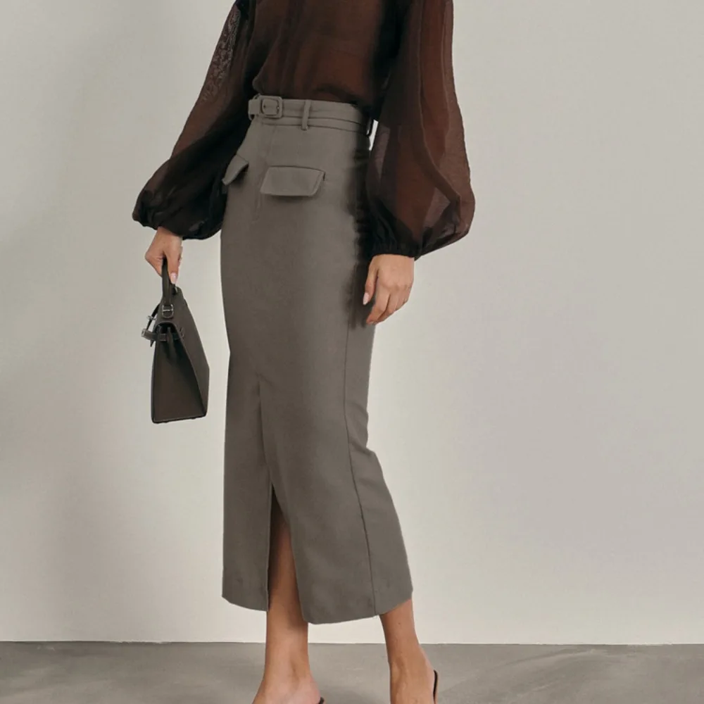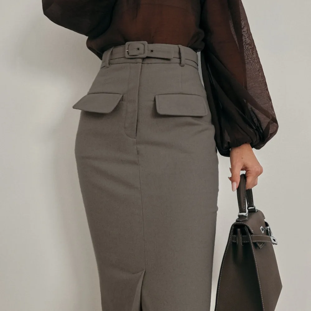 TWOTWINSTYLE Office Patchwork Pockets Midi Skirts for Women High Waist Spliced Sashes Front Slit Minimalist Style Skirt Female