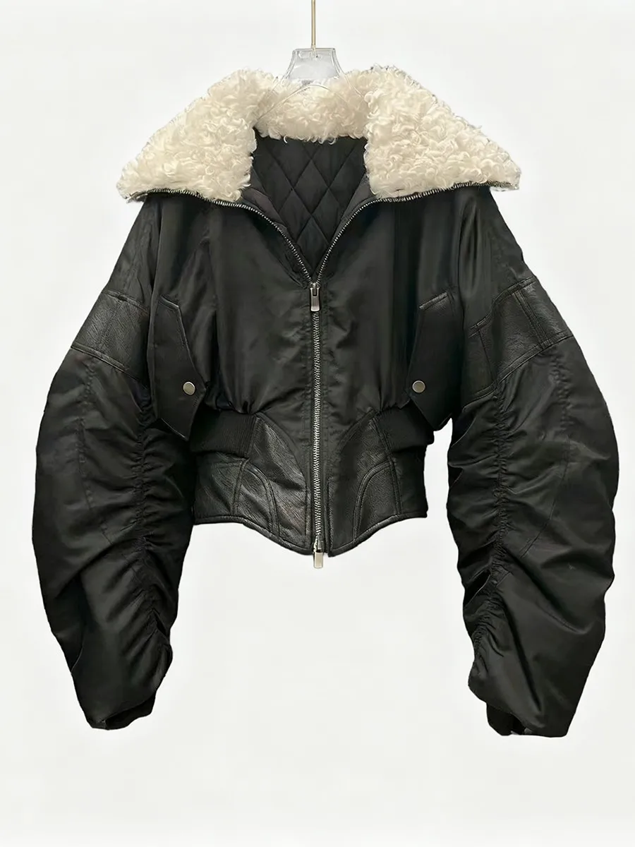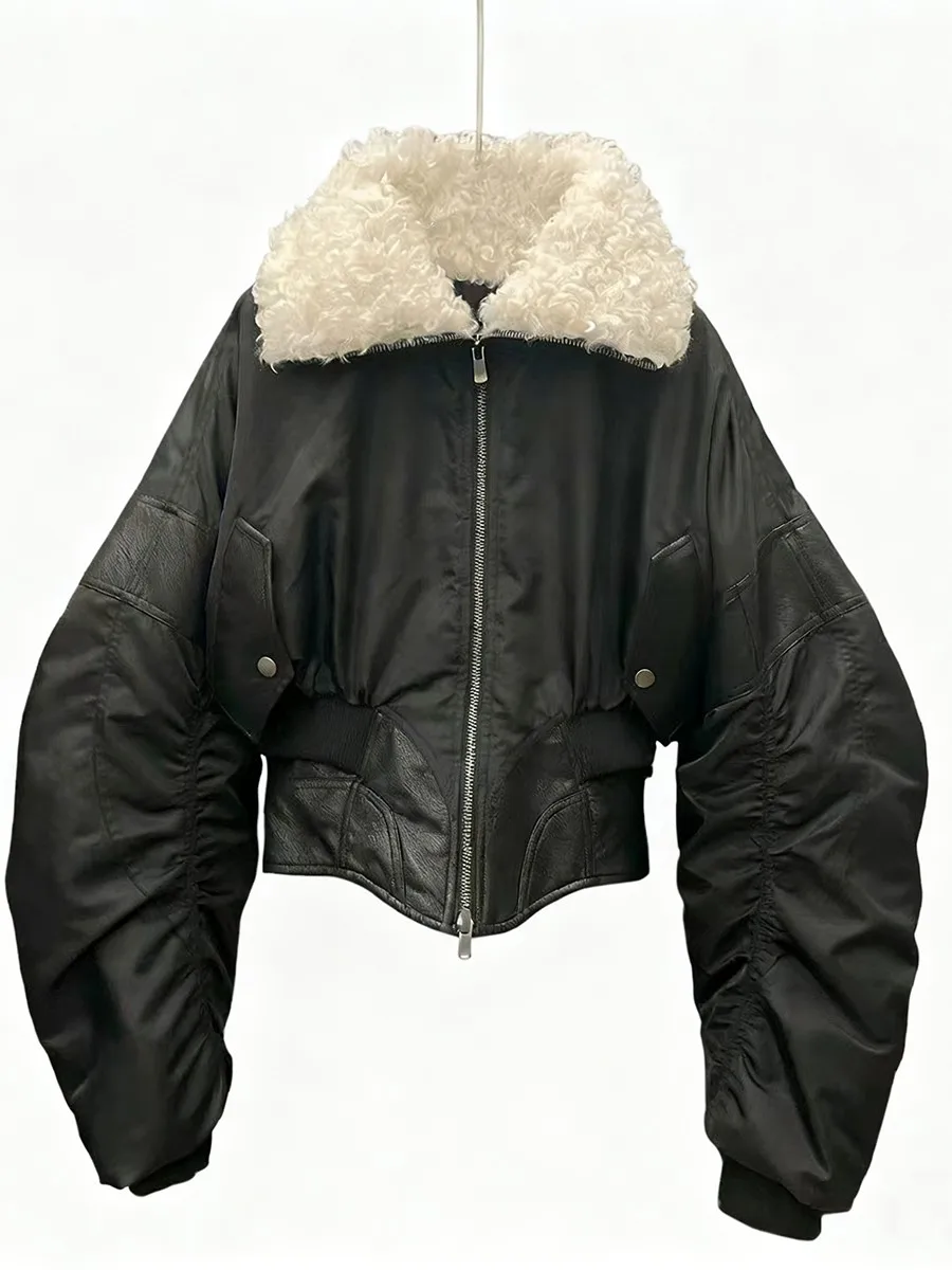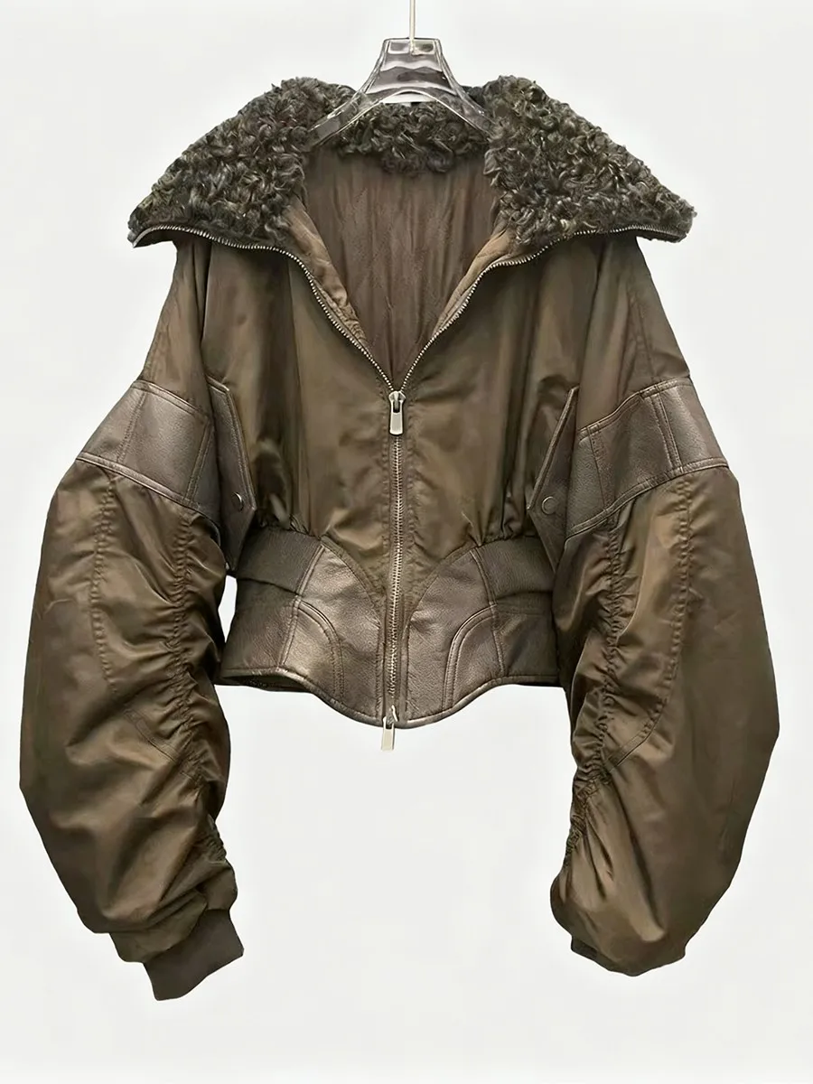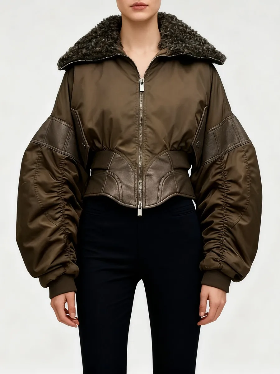 TWOTWINSTYLE Slimming Spliced Leather Fashion Jackets for Women Lapel Long Sleeves Tunic Patchwork Flocking Casual Jacket Female