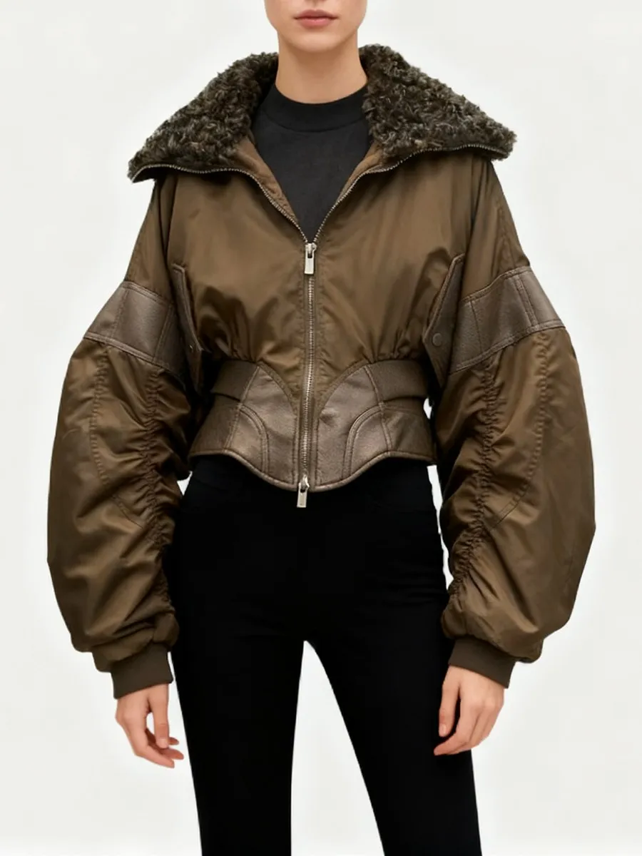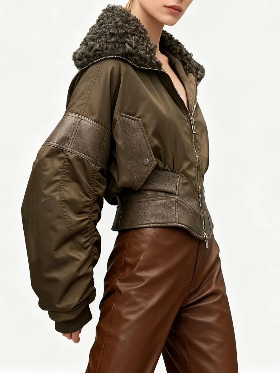 TWOTWINSTYLE Slimming Spliced Leather Fashion Jackets for Women Lapel Long Sleeves Tunic Patchwork Flocking Casual Jacket Female